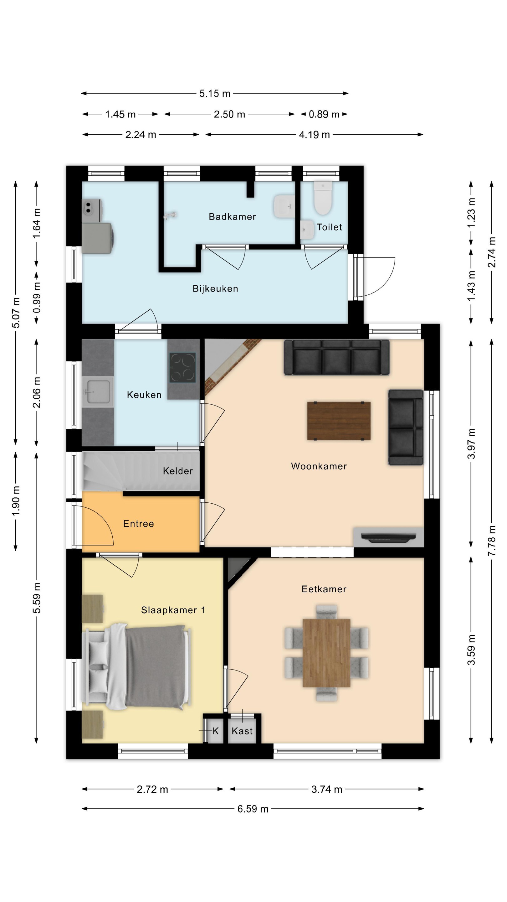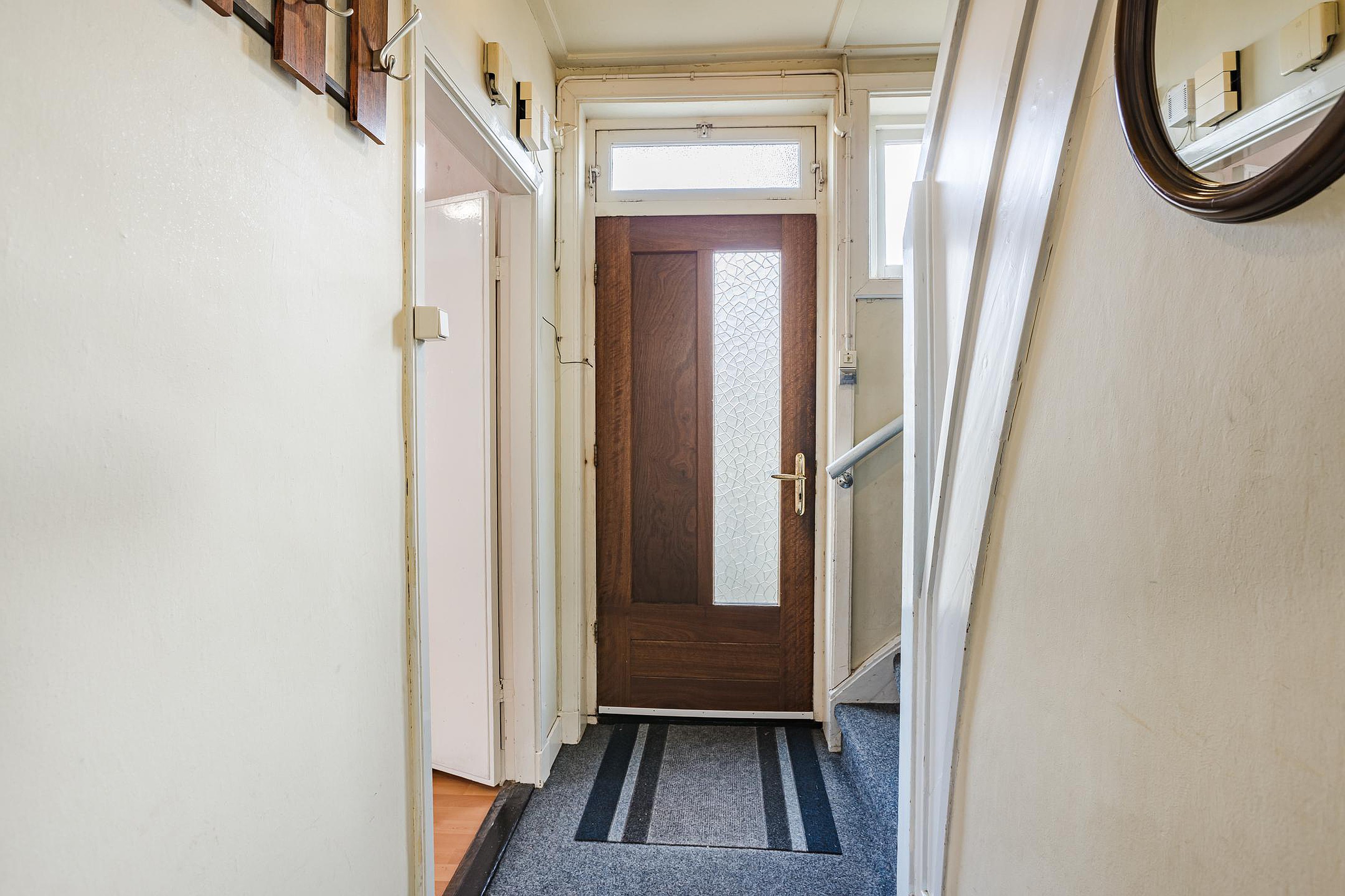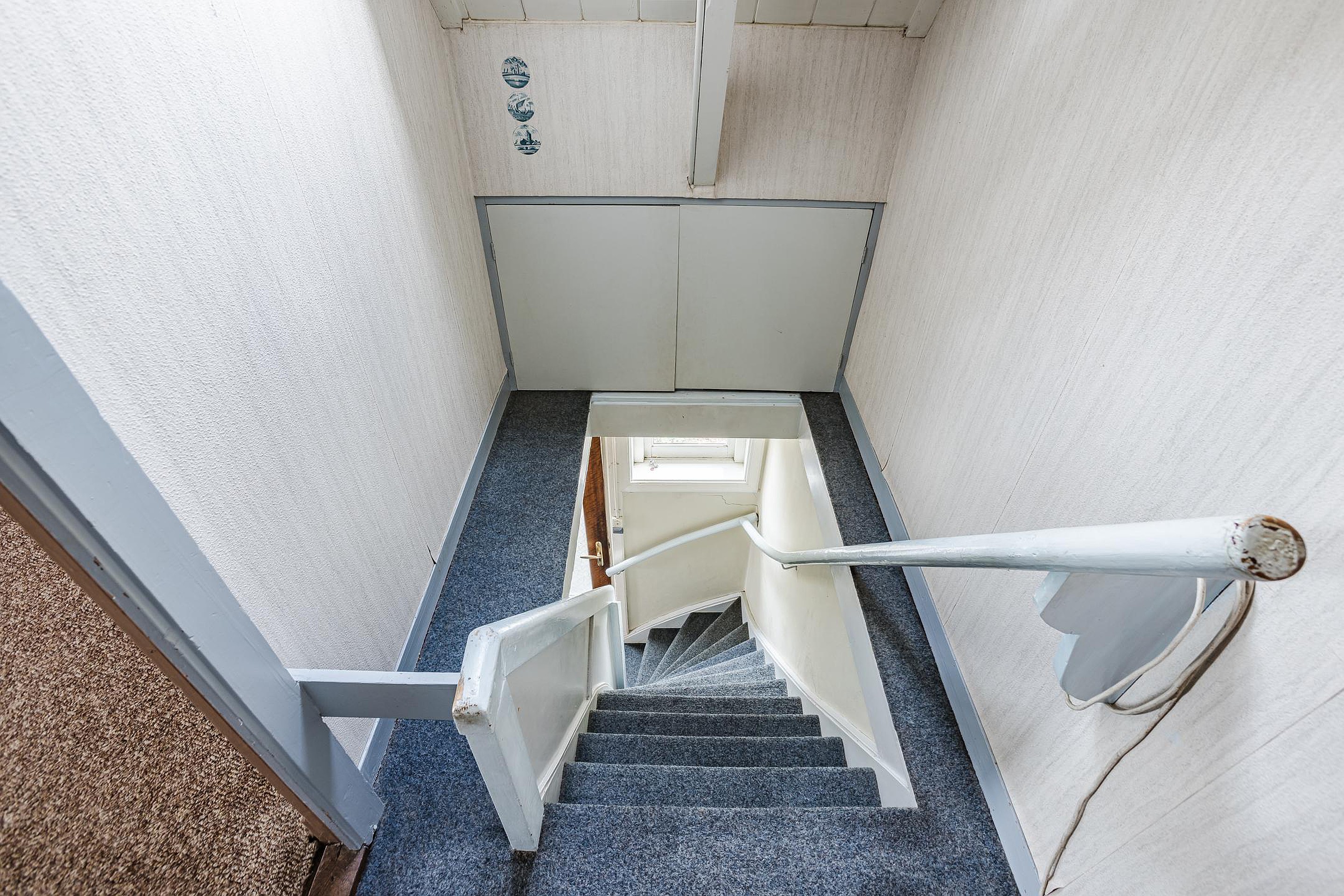 Begane grond Entree, trapopgang, slaapkamer met meterkast, voorkamer met vaste kast, achterkamer met gashaard, kleine keuken met eenvoudig keukenblok met enige inbouwapparatuur, kelder, bijkeuken met opstelplaats voor wasmachine/droger en geiser, badkamer met ruime douche-inrichting en wastafel, afzonderlijk toilet met fontein, achteringang.