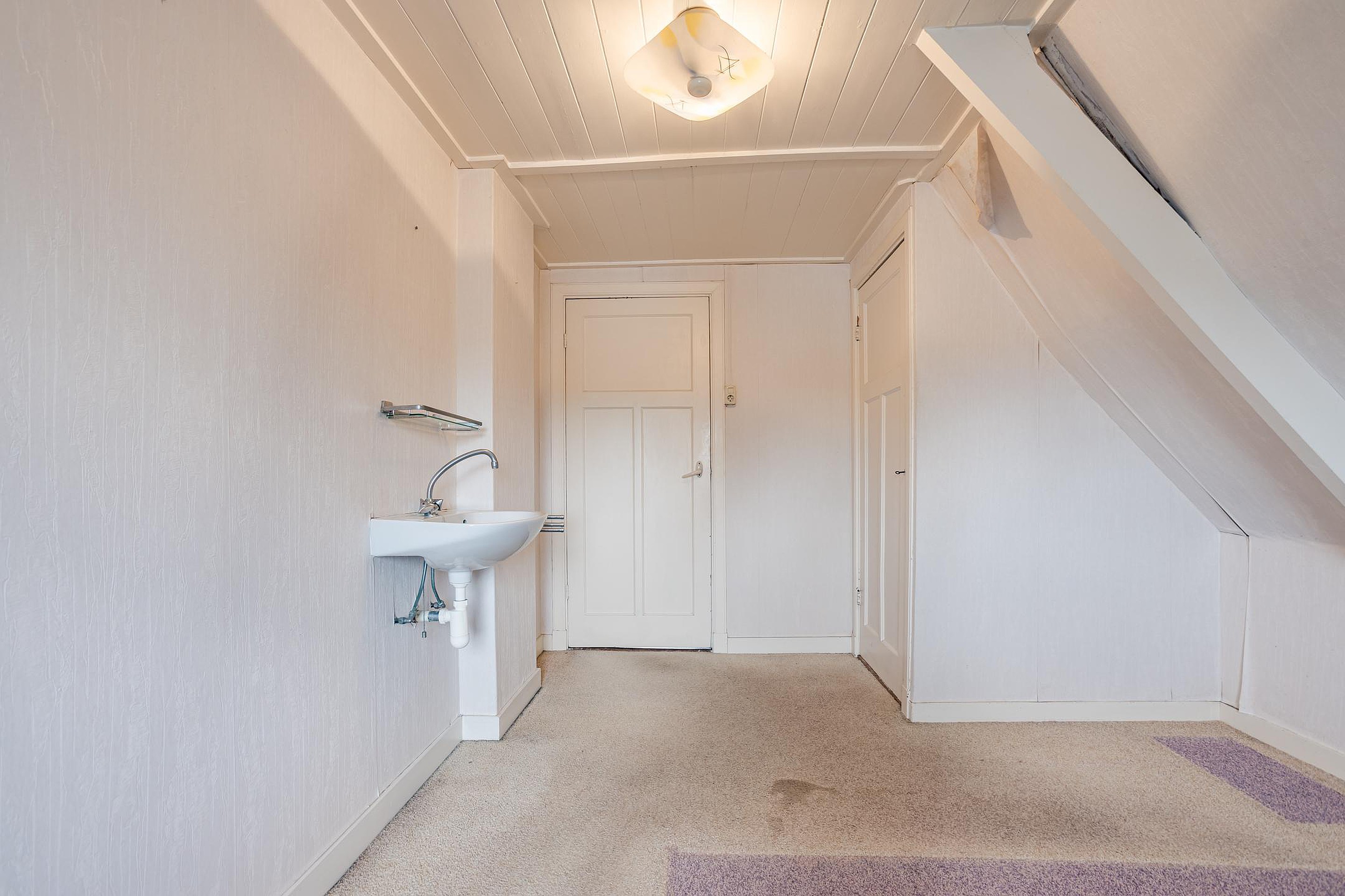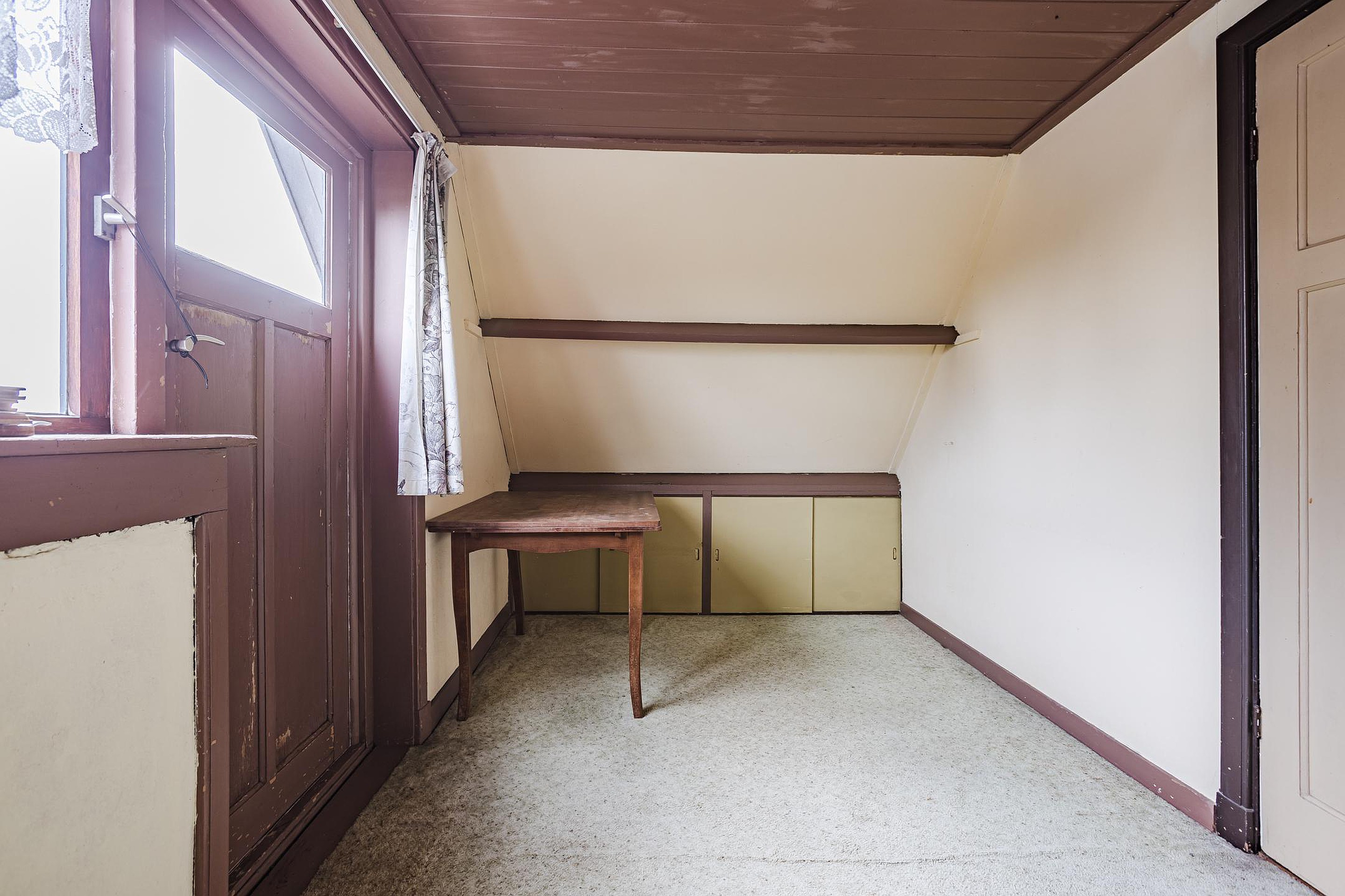Eerste verdieping Overloop met vaste kast, slaapkamer met wastafel en bergruimte achter knieschotten, slaapkamer met wastafel en vaste kast. Slaapkamer achterzijde met luik naar zolderruimte.