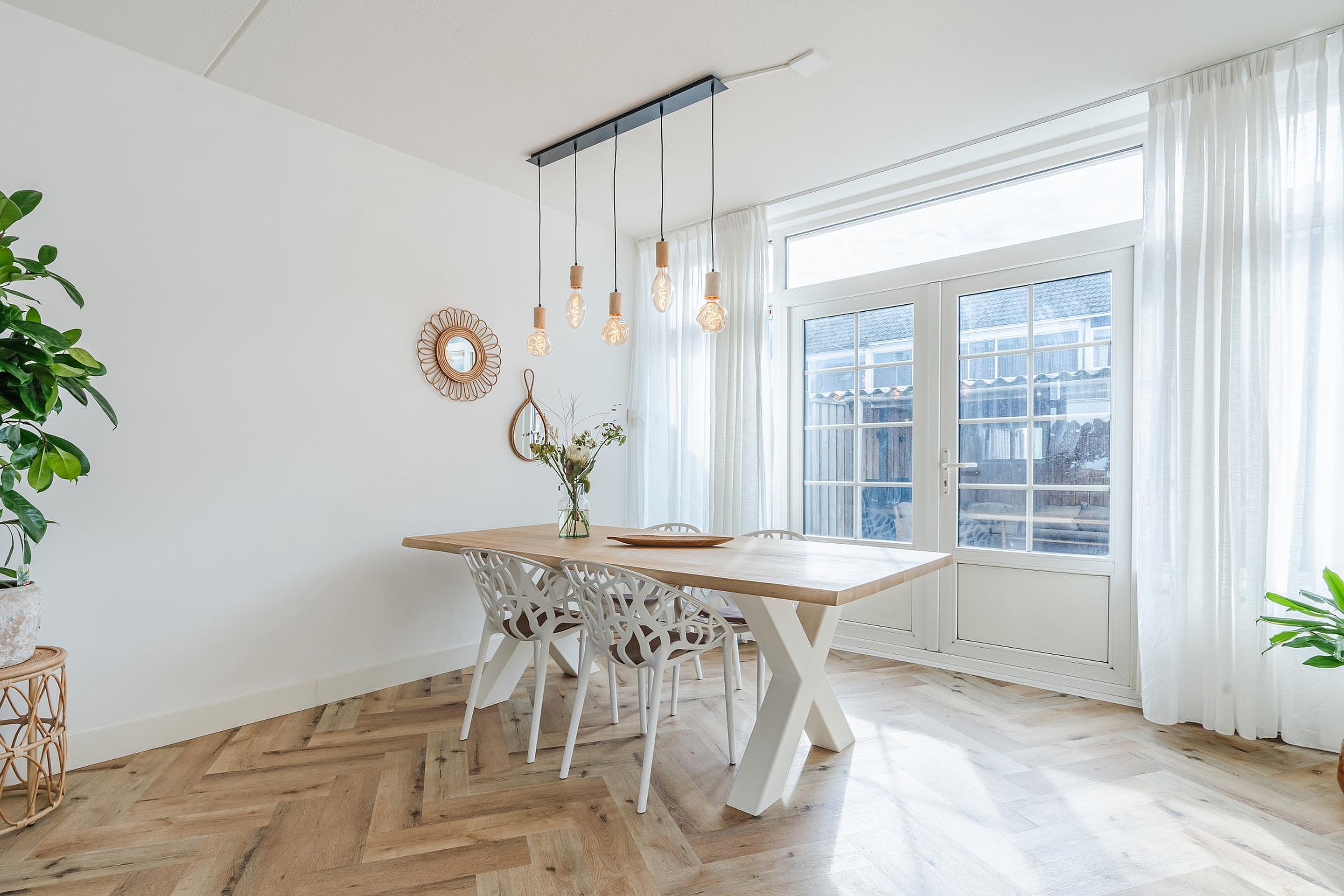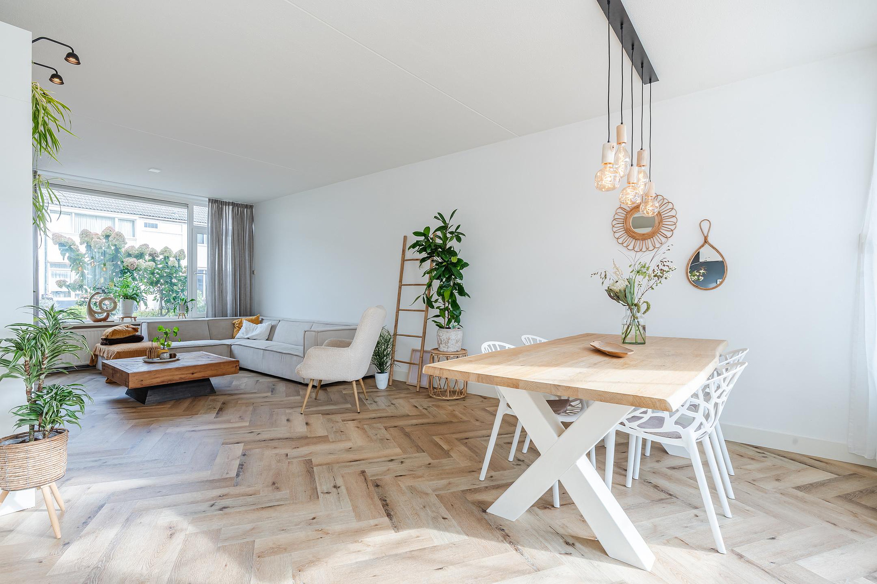 - Doorzonwoonkamer met PVC visgraatvloer en openslaande tuindeuren naar het terras;