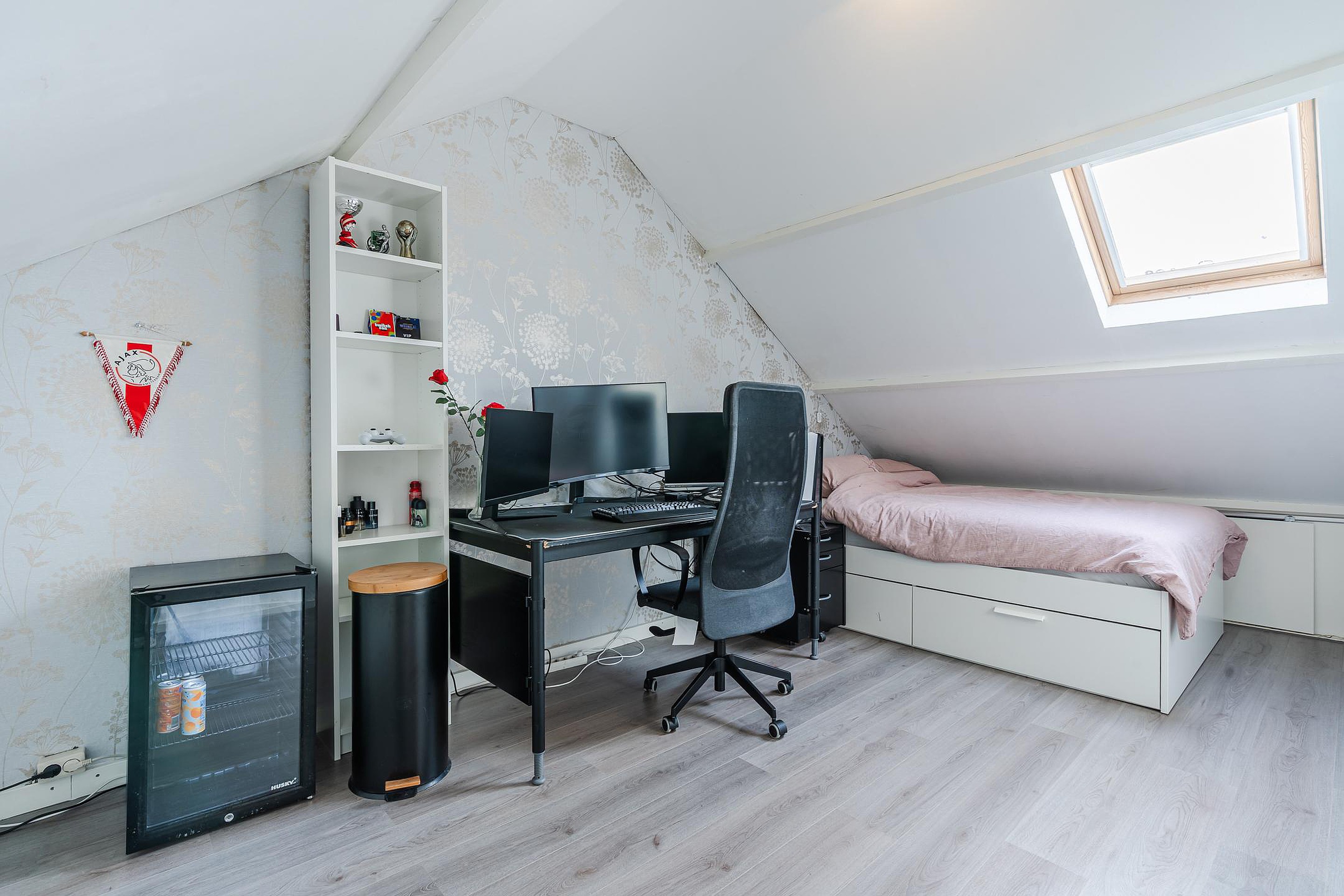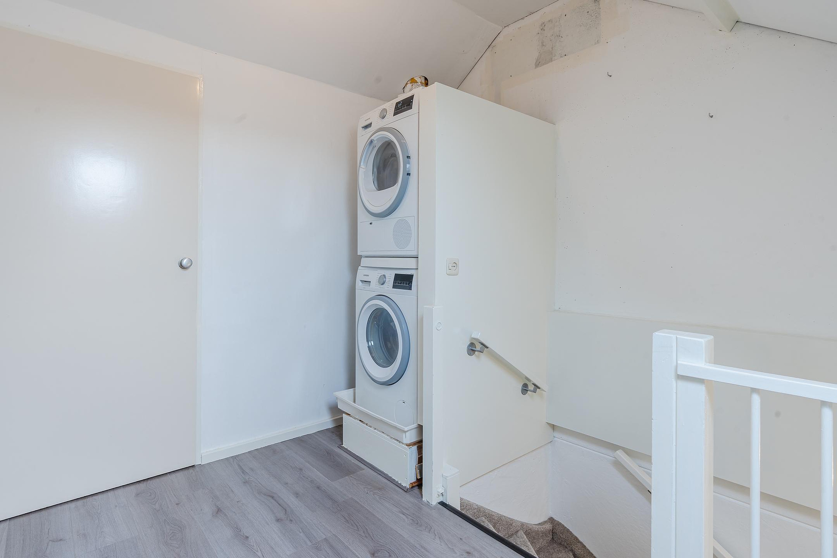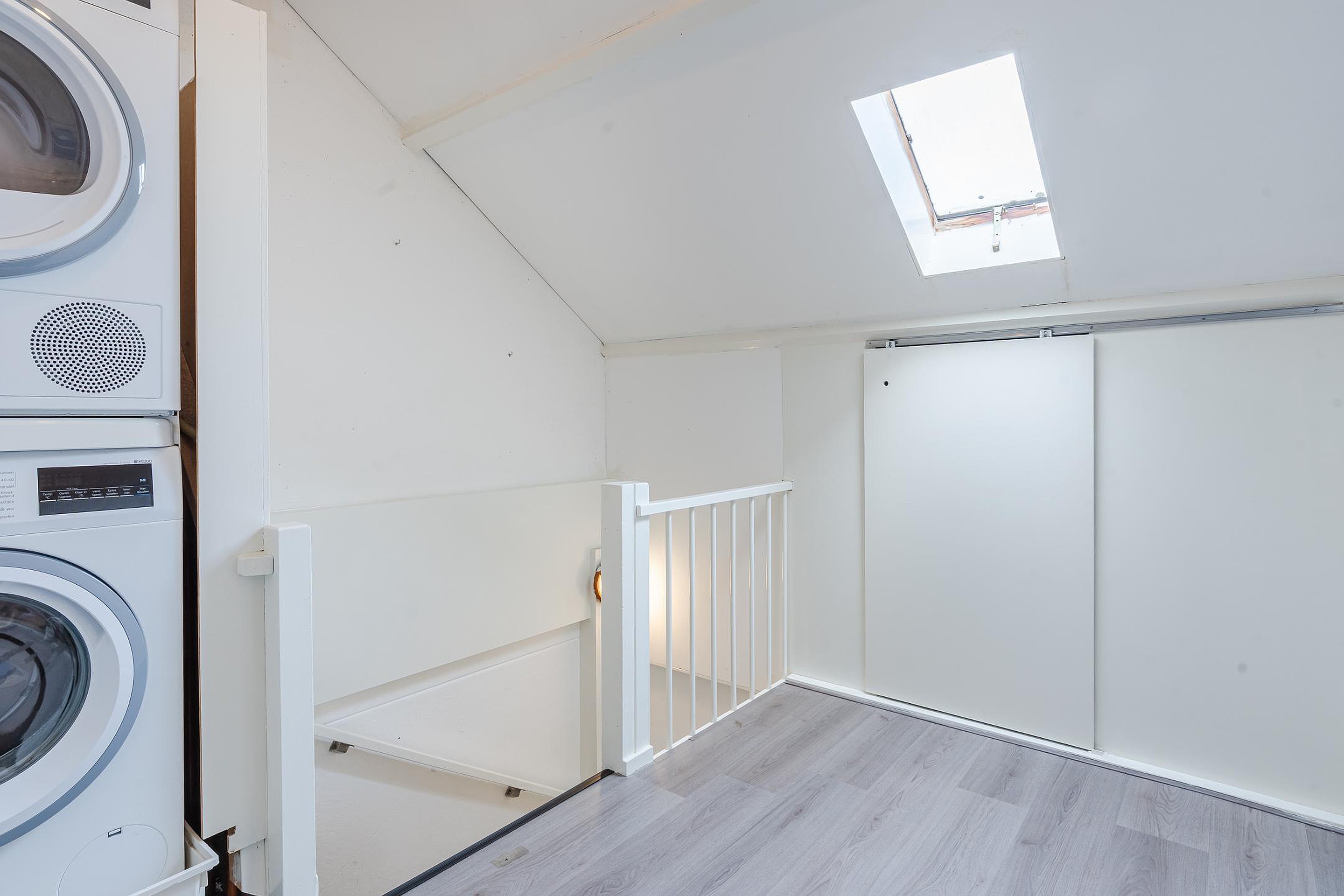 Overloop met wasmachine-aansluiting, afzonderlijke bergruimte met opstelplaats voor cv-ketel, 4e slaapkamer met dakraam en bergruimte achter de knieschotten.