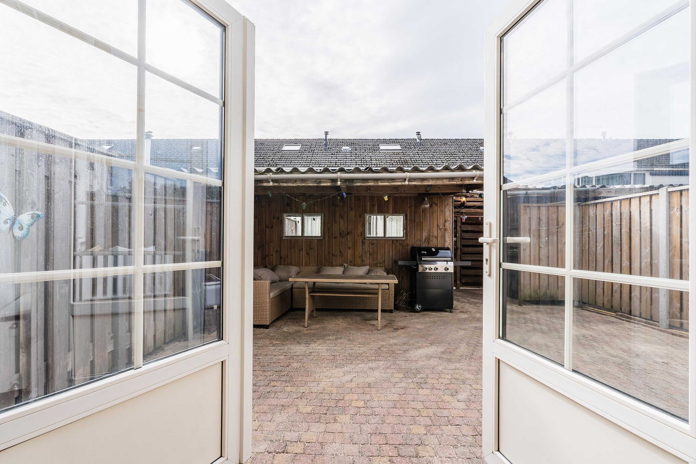 De achtertuin is gelegen op het zuiden en beschikt over een terrasoverkapping, een vrijstaande houten berging en een overdekt gedeelte. Daarnaast beschikt de woning over een praktische 'achterom'.