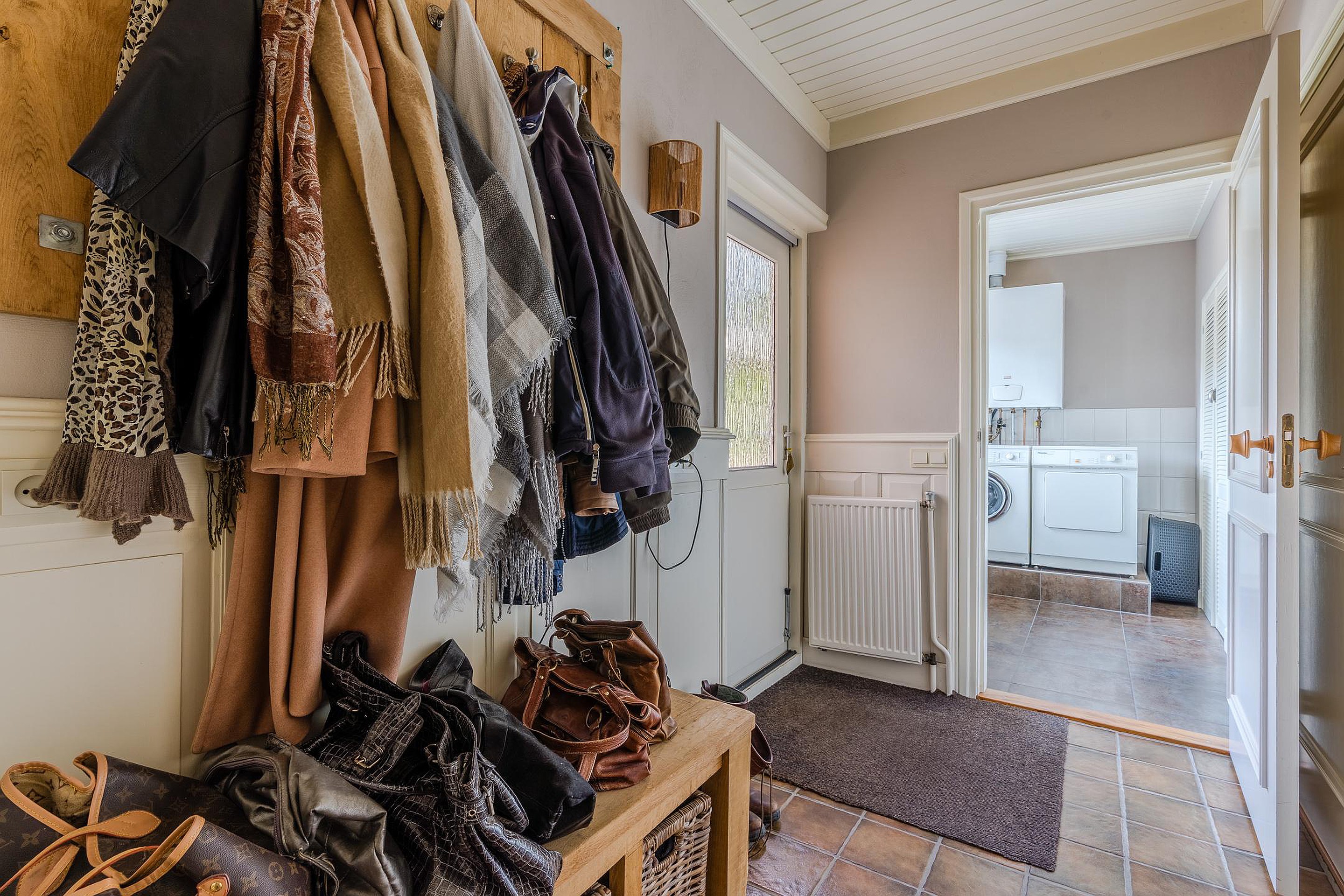 Begane grond Ruime entree, staand toilet met fontein, trapopgang naar verdieping, badkamer met ligbad, douche-inrichting in bad, wastafel, ruime slaapkamer c.q. hobbykamer met tuindeuren naar terras, royale living met erker en sfeervolle houtkachel, ruime woonkeuken met vloerverwarming en L-vormige inbouwkeuken voorzien van diverse inbouwapparatuur en tuindeuren naar terras, doorgang met garderobe, achteringang, bijkeuken met opstelplaats cv-ketel, wasmachine/droger en vaste kasten.