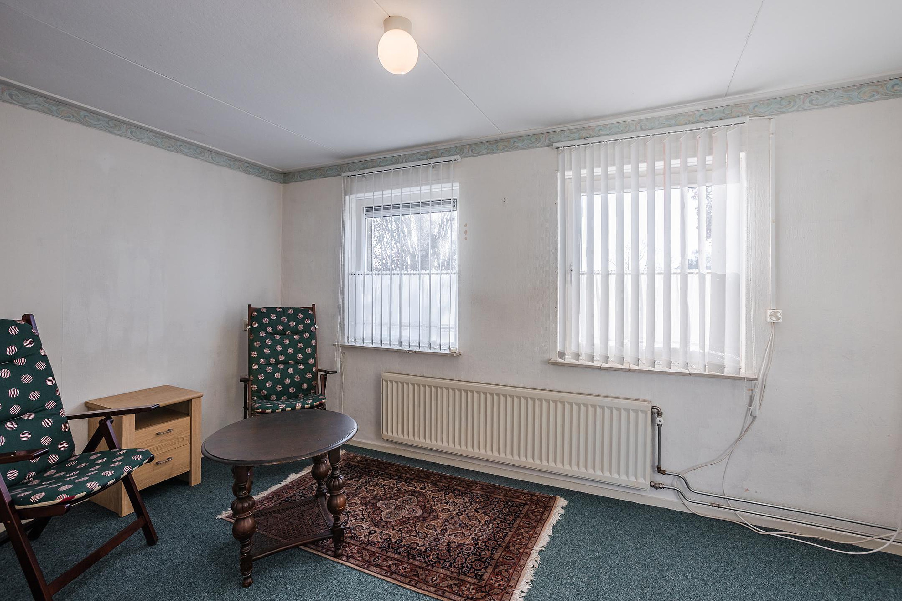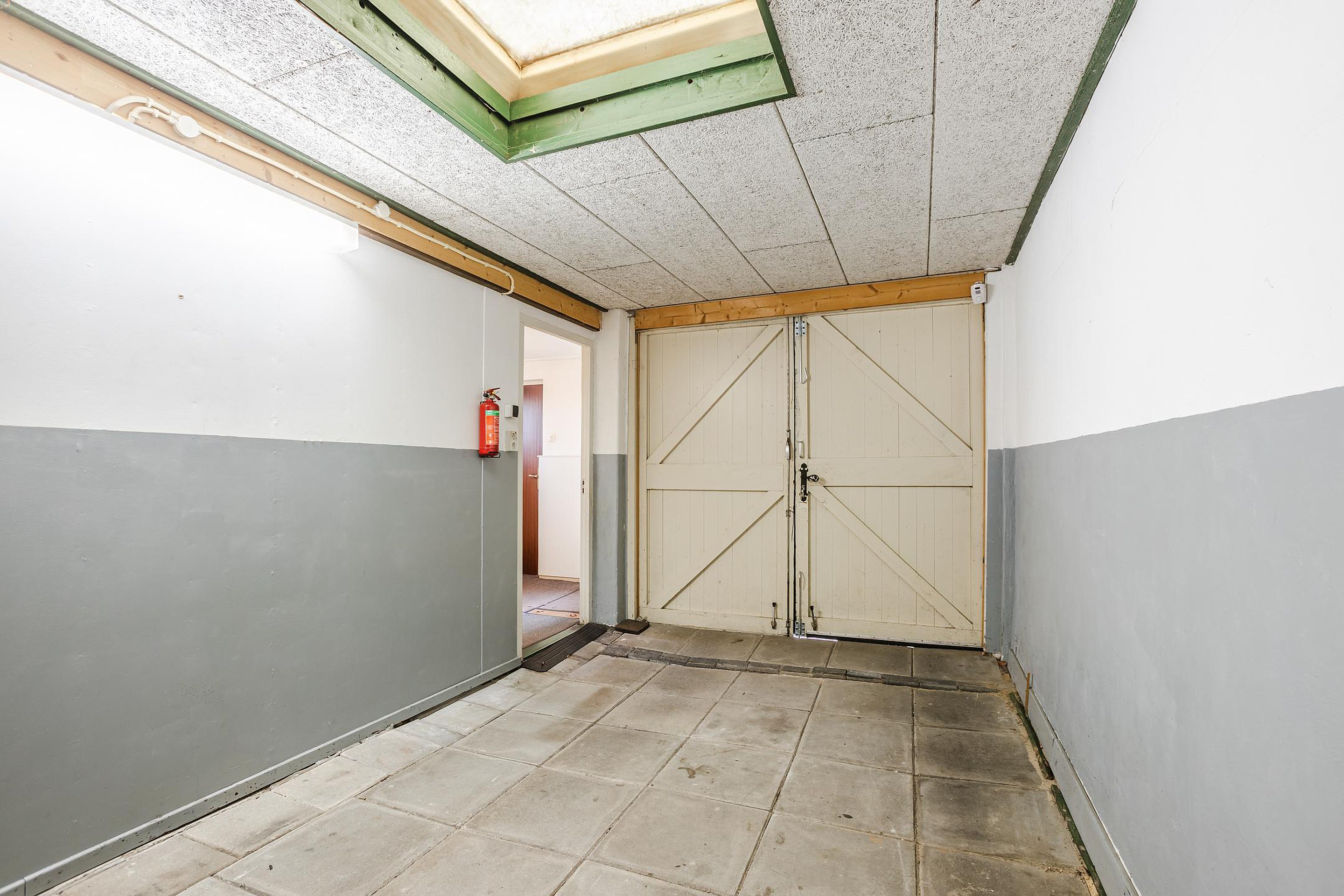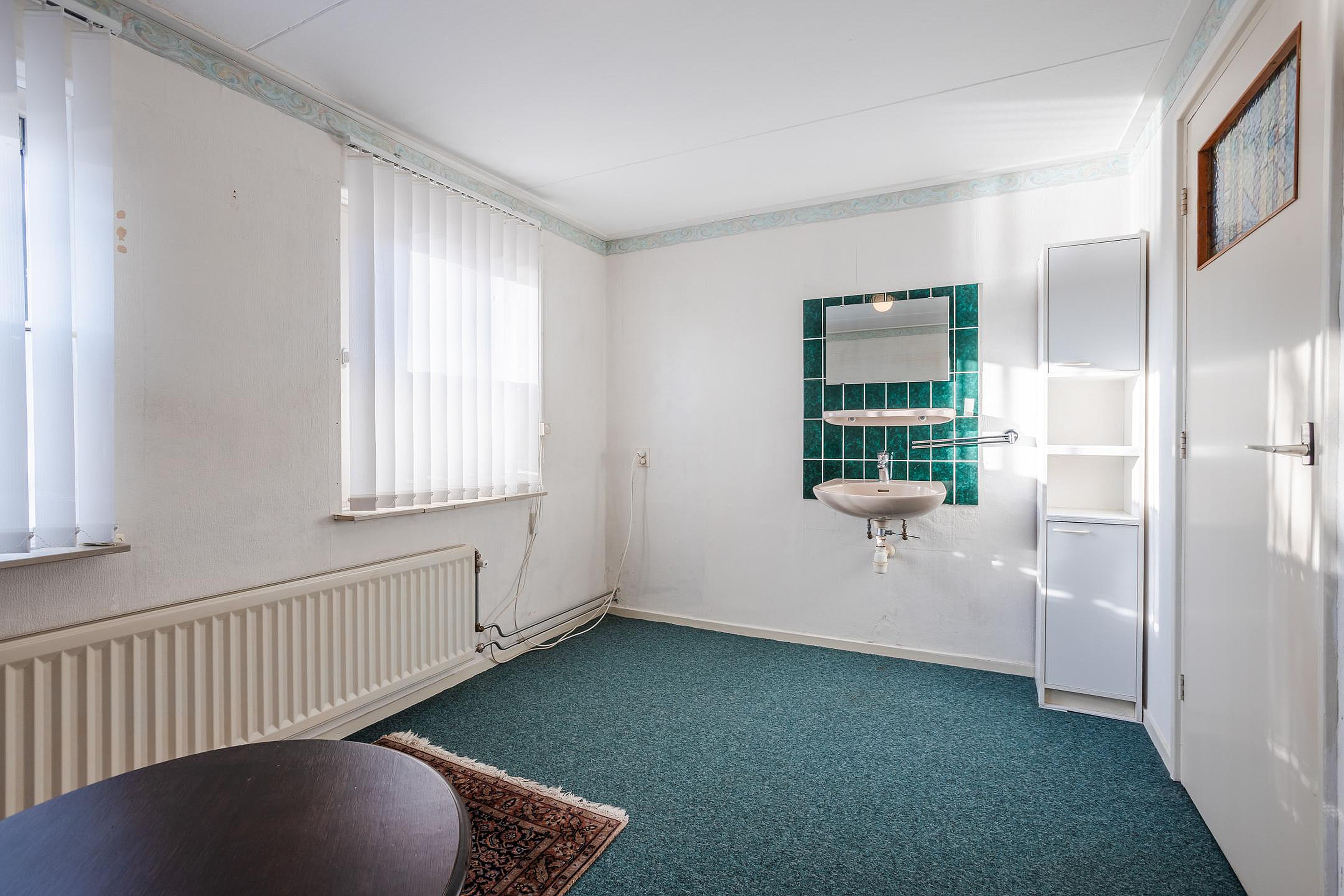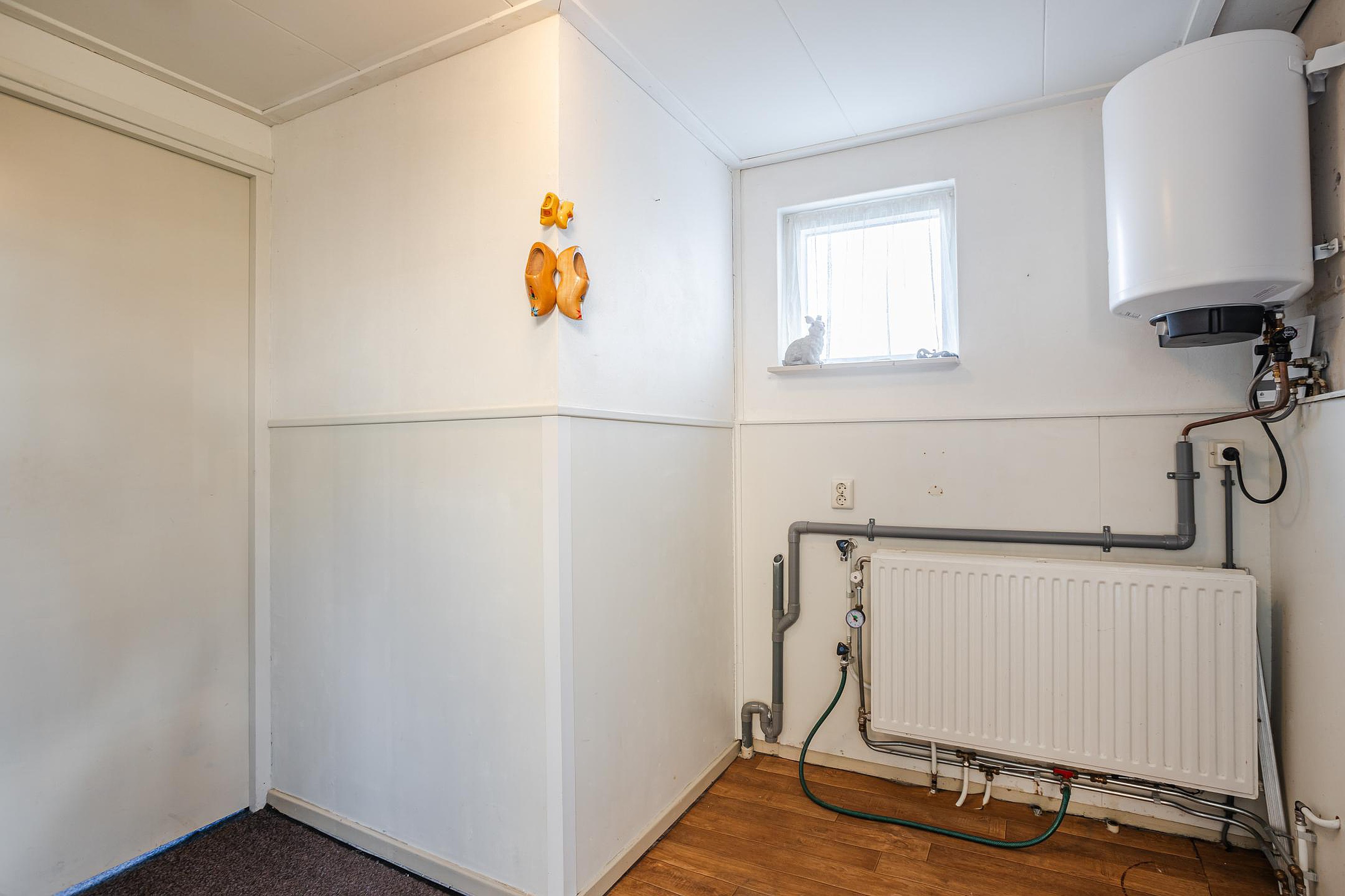 Begane grond Entree/hal, wandcloset met fontein, trapopgang met kelderkast, meterkast, rechthoekige woonkamer met parketvloer en gashaard, dichte keuken met parketvloer en standaard keukenblok voorzien van enige inbouwapparatuur, bijkeuken/achteringang met opstelplaats boiler, kantoor/slaapkamertje met aangrenzende badkamer (2016) met wastafel, designradiator en douche-inrichting, doorgang vanuit de bijkeuken naar de garage met daarachter nog een extra schuurruimte.