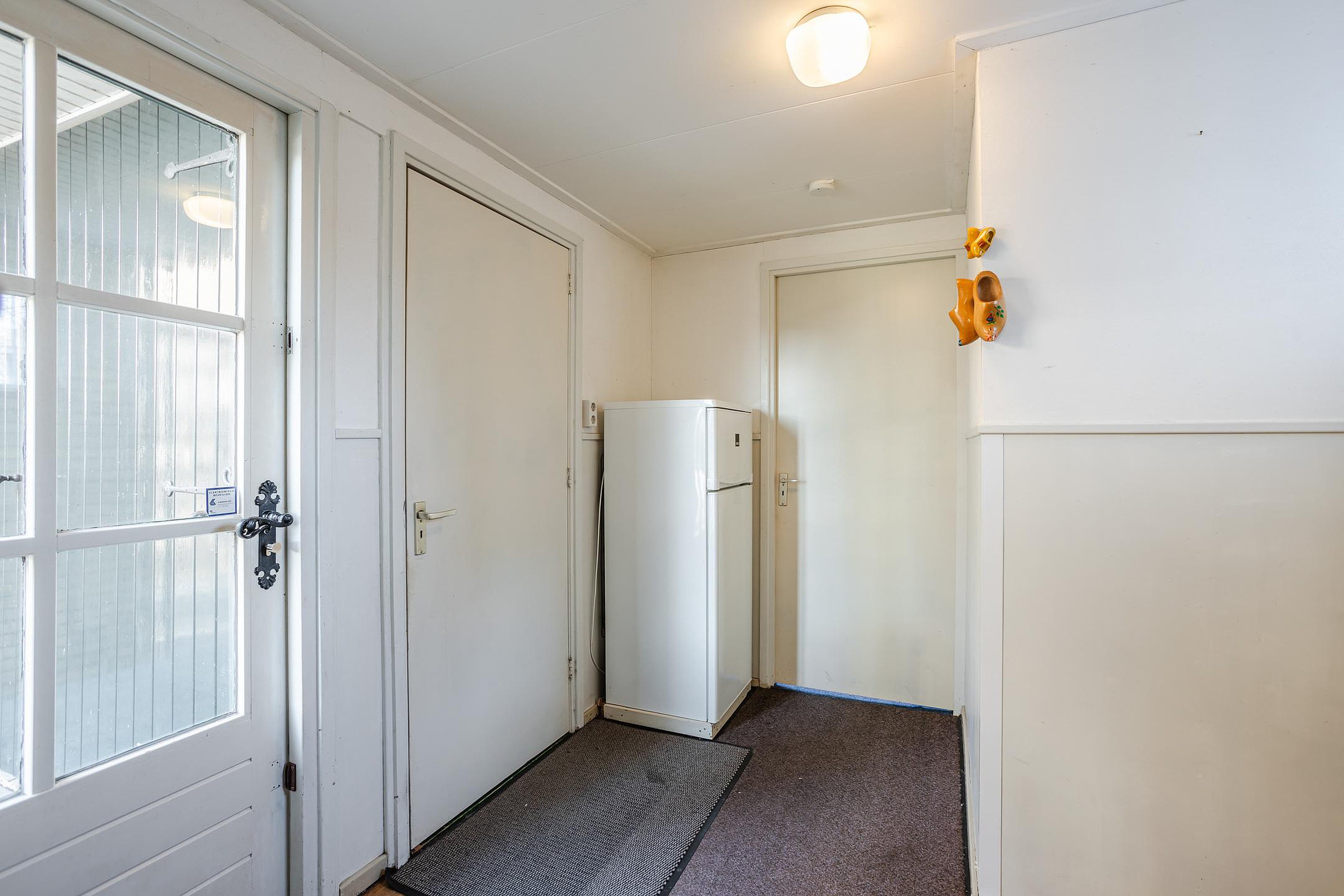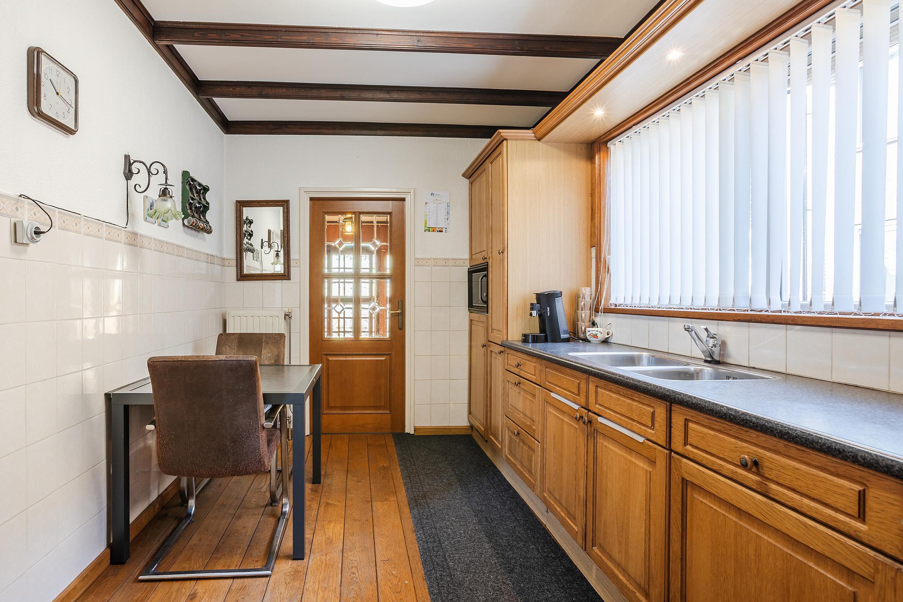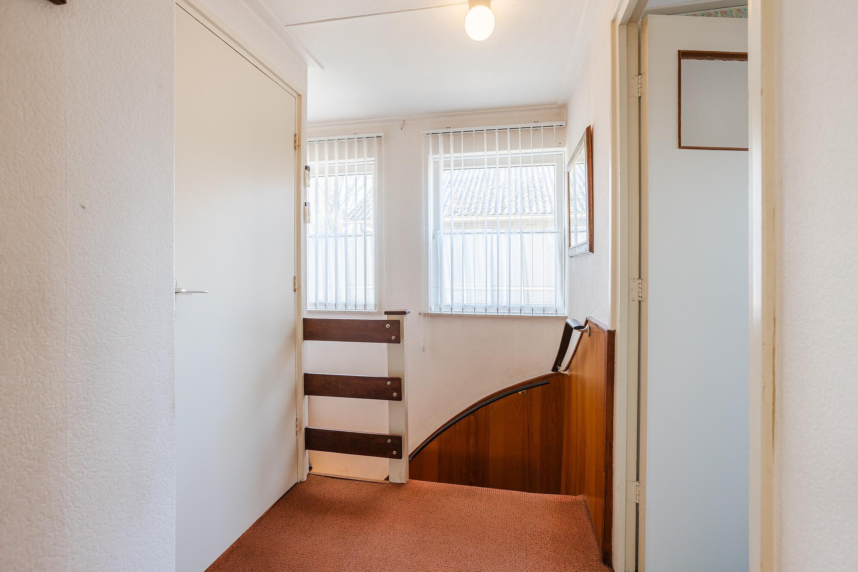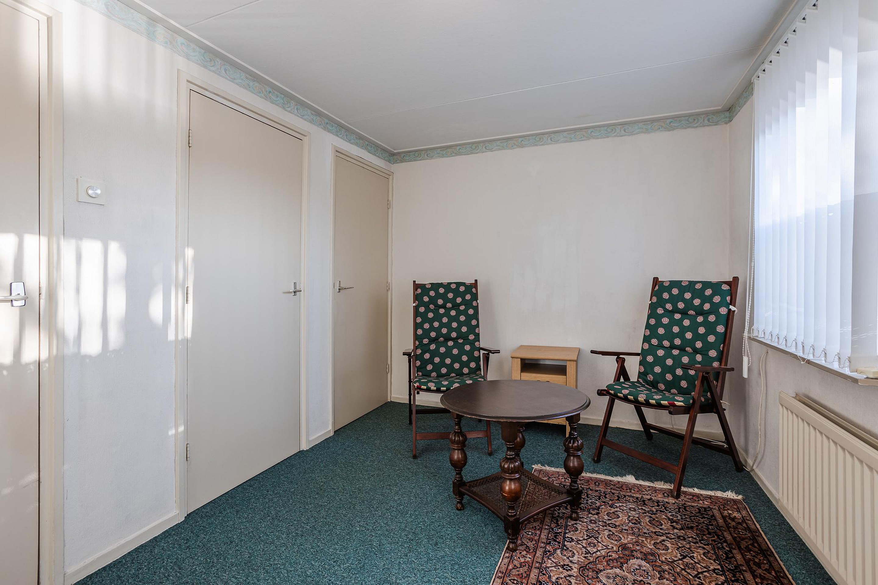 Begane grond Entree/hal, wandcloset met fontein, trapopgang met kelderkast, meterkast, rechthoekige woonkamer met parketvloer en gashaard, dichte keuken met parketvloer en standaard keukenblok voorzien van enige inbouwapparatuur, bijkeuken/achteringang met opstelplaats boiler, kantoor/slaapkamertje met aangrenzende badkamer (2016) met wastafel, designradiator en douche-inrichting, doorgang vanuit de bijkeuken naar de garage met daarachter nog een extra schuurruimte.