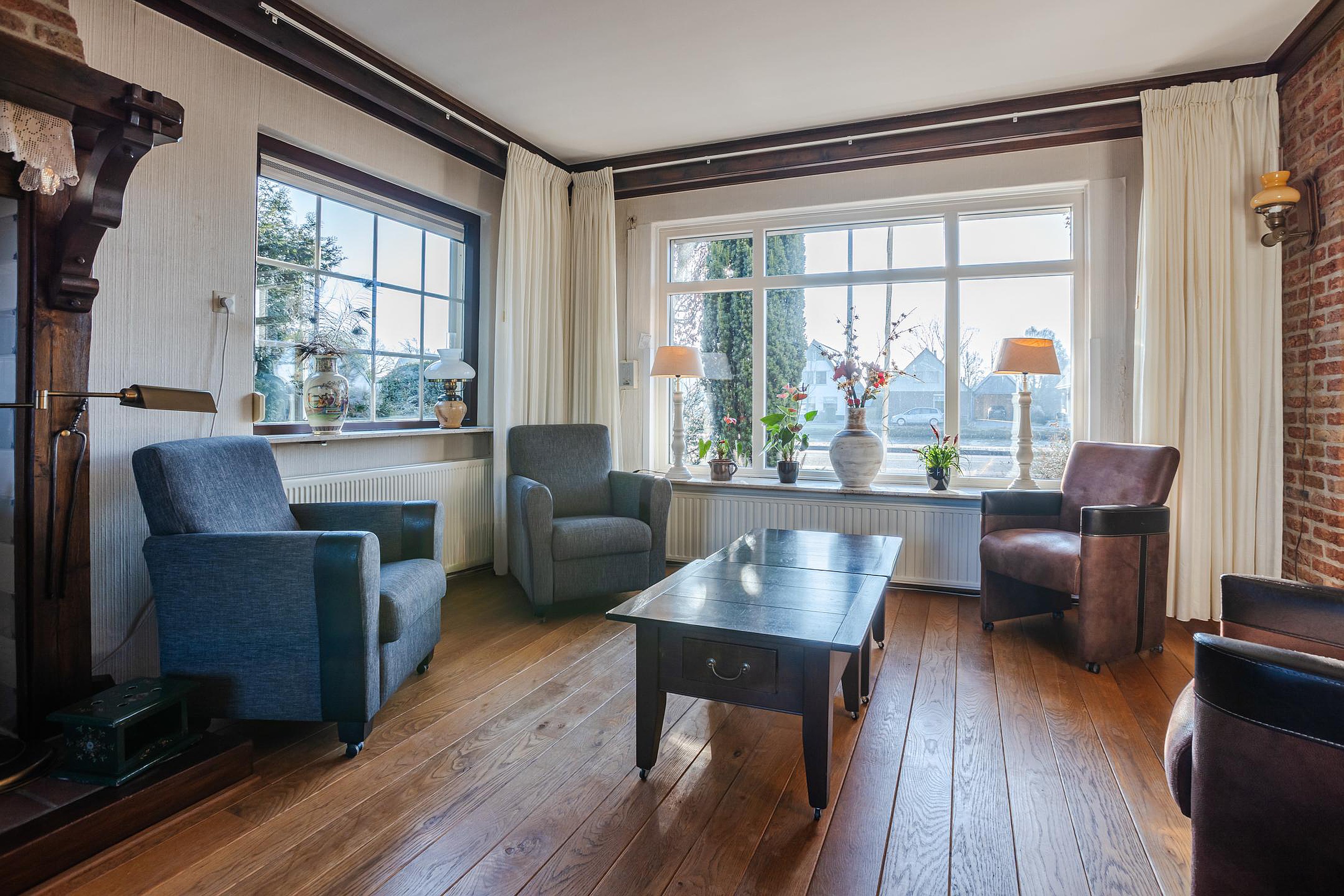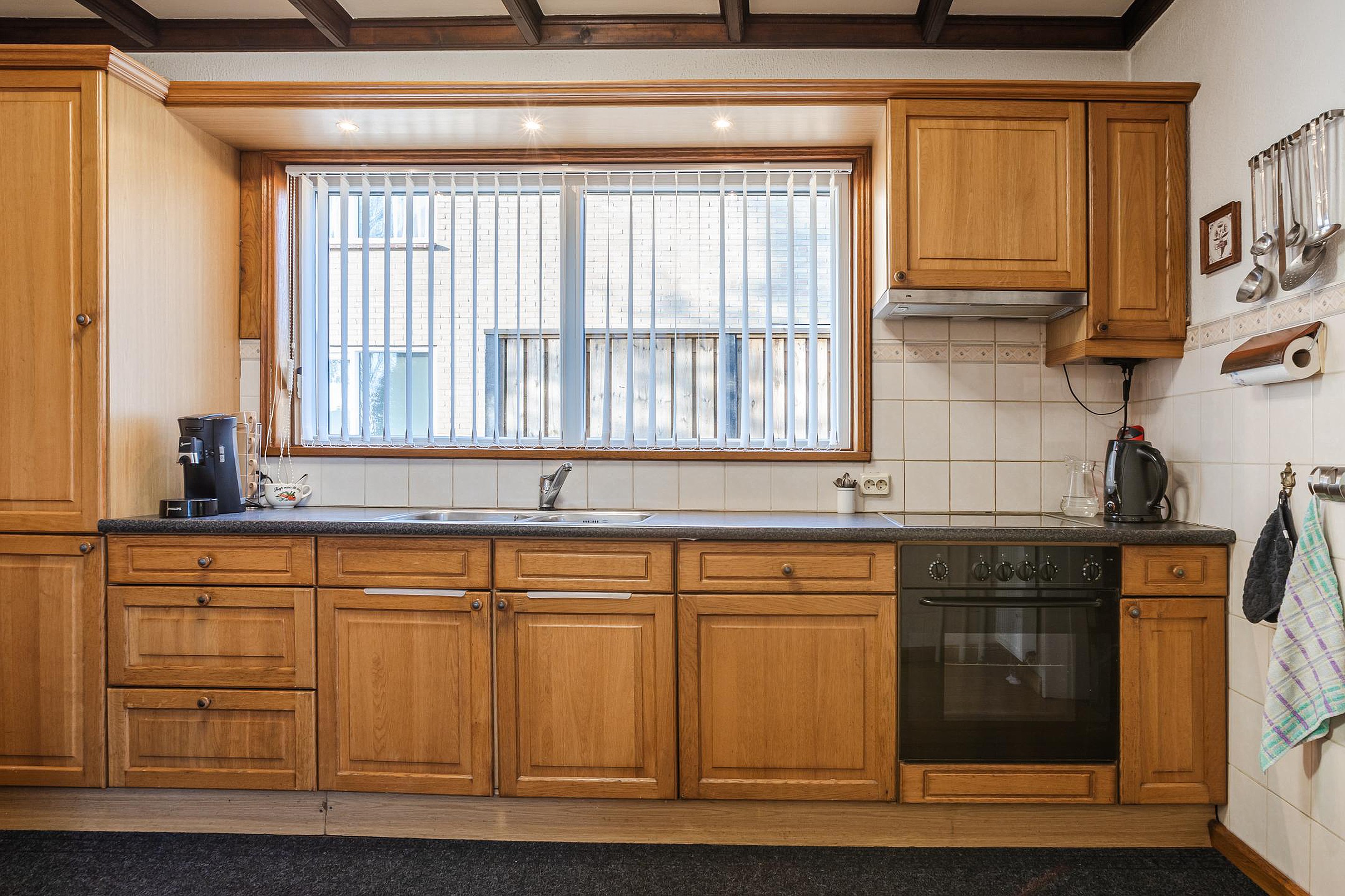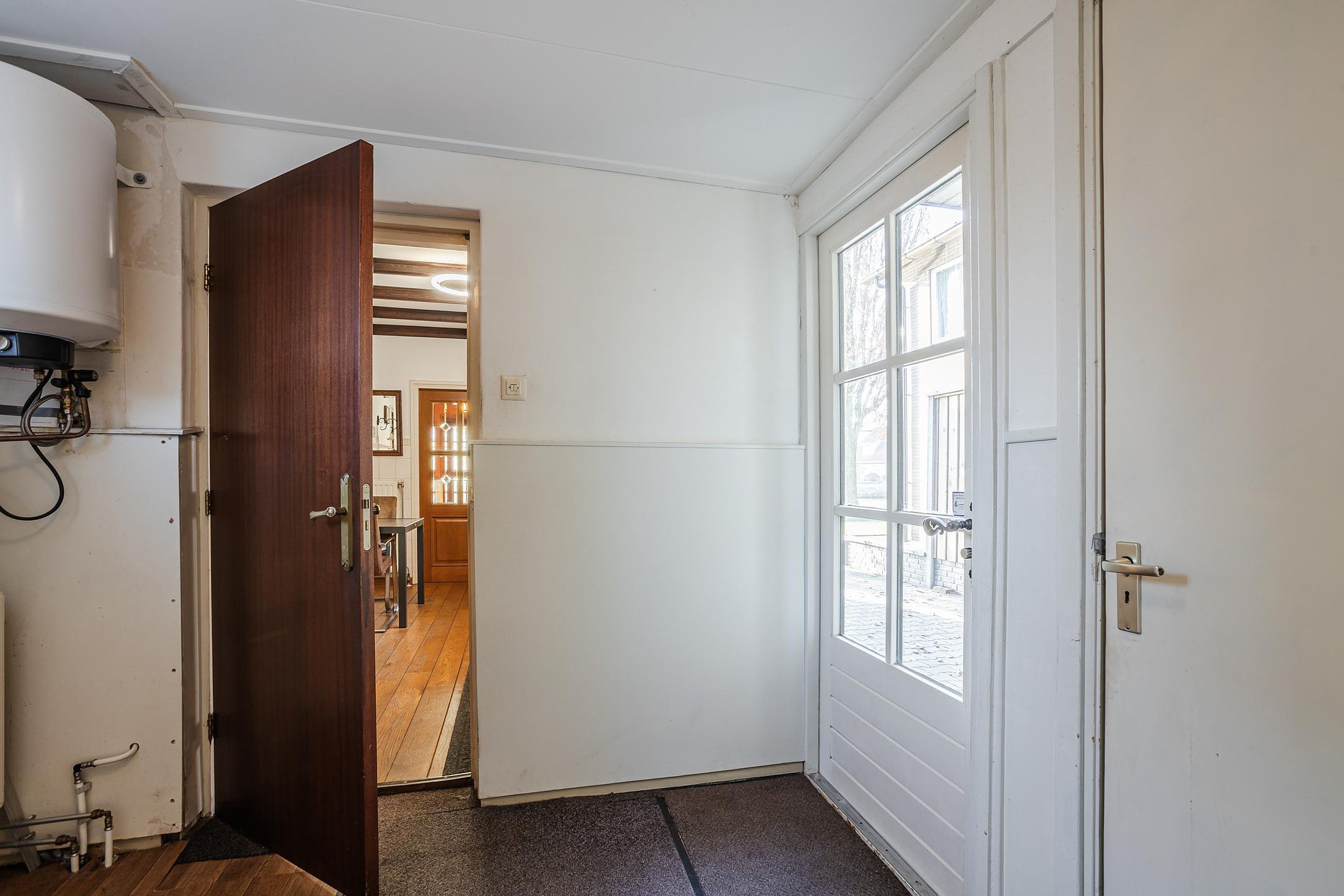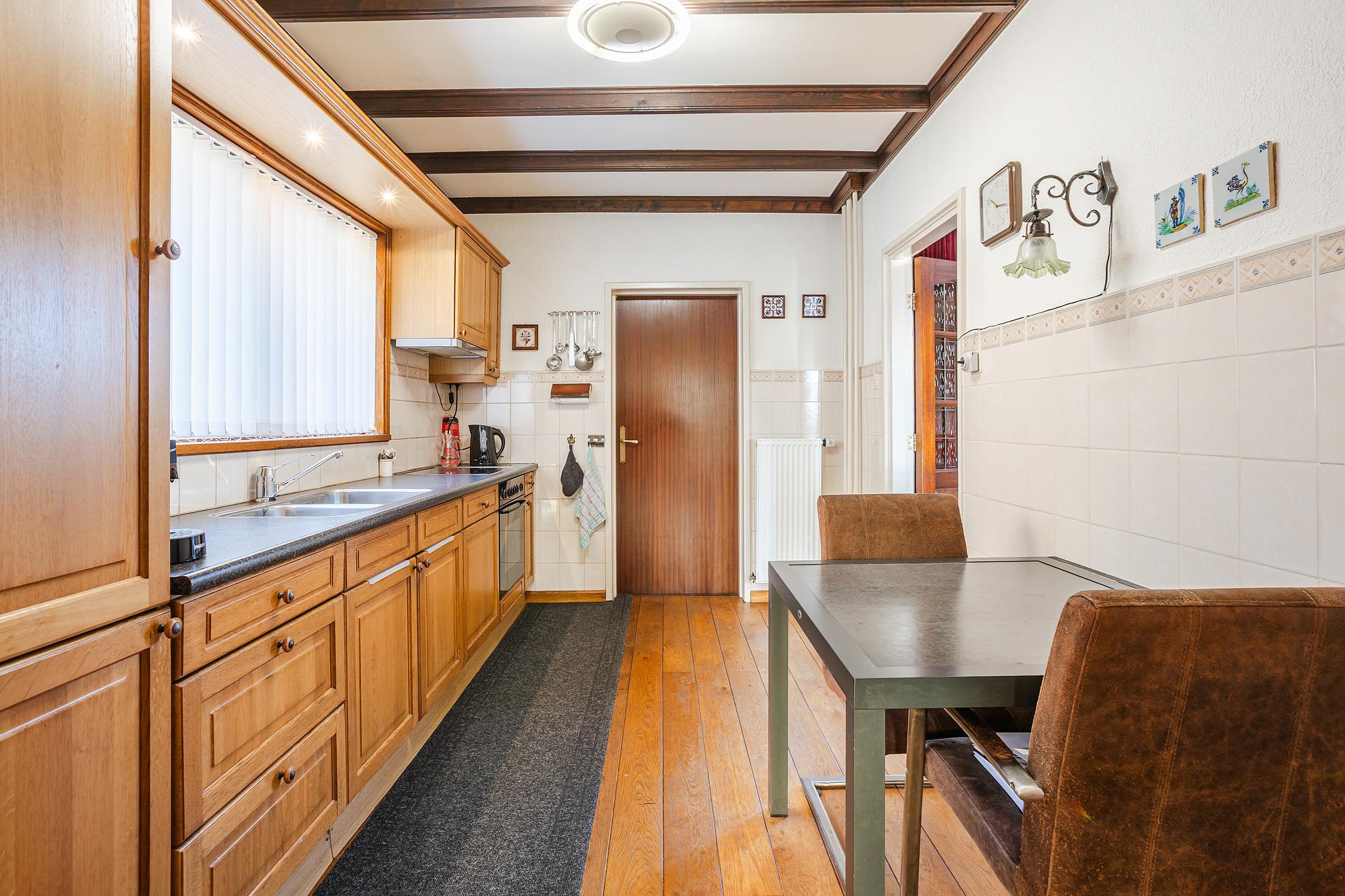 Begane grond Entree/hal, wandcloset met fontein, trapopgang met kelderkast, meterkast, rechthoekige woonkamer met parketvloer en gashaard, dichte keuken met parketvloer en standaard keukenblok voorzien van enige inbouwapparatuur, bijkeuken/achteringang met opstelplaats boiler, kantoor/slaapkamertje met aangrenzende badkamer (2016) met wastafel, designradiator en douche-inrichting, doorgang vanuit de bijkeuken naar de garage met daarachter nog een extra schuurruimte.