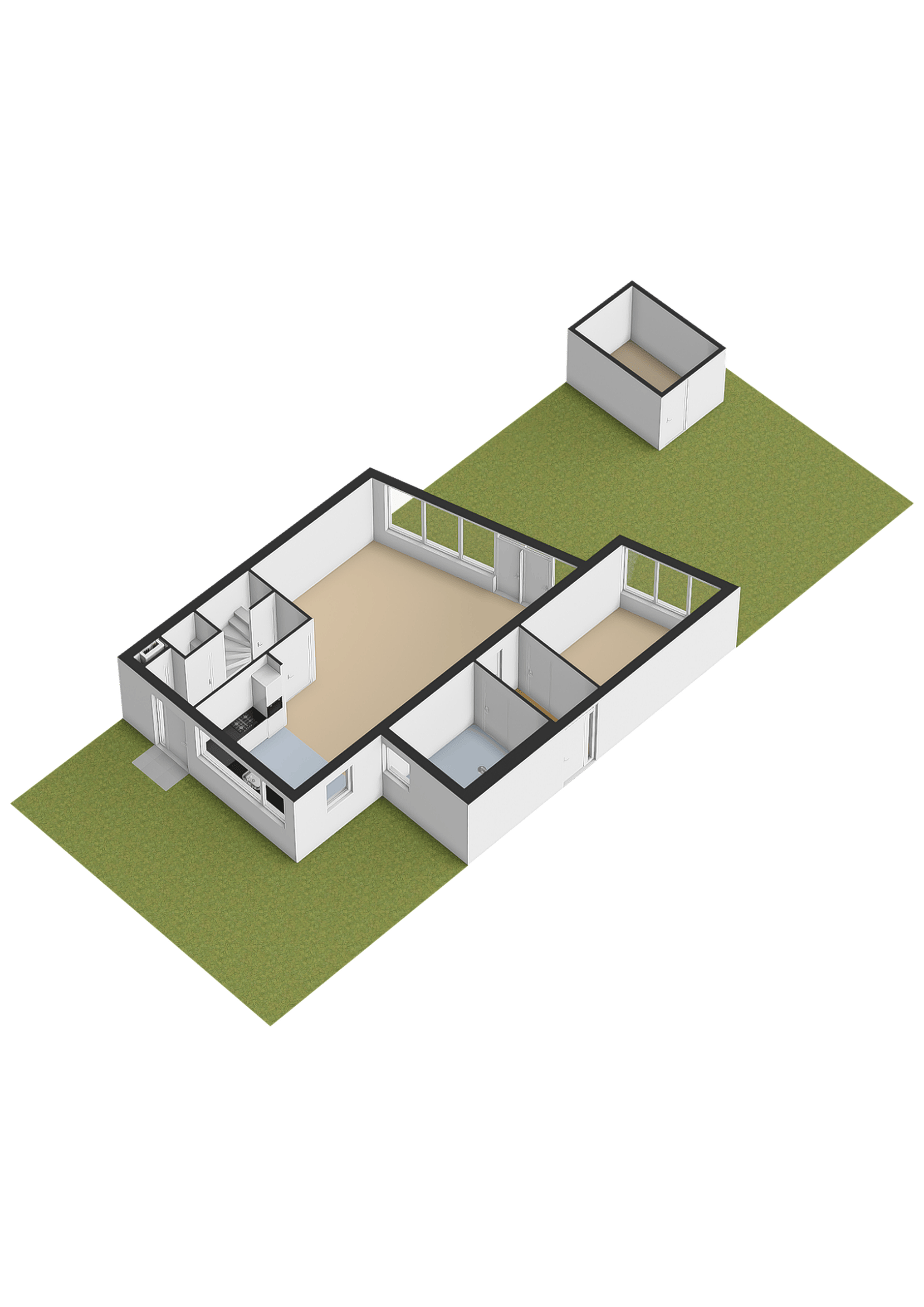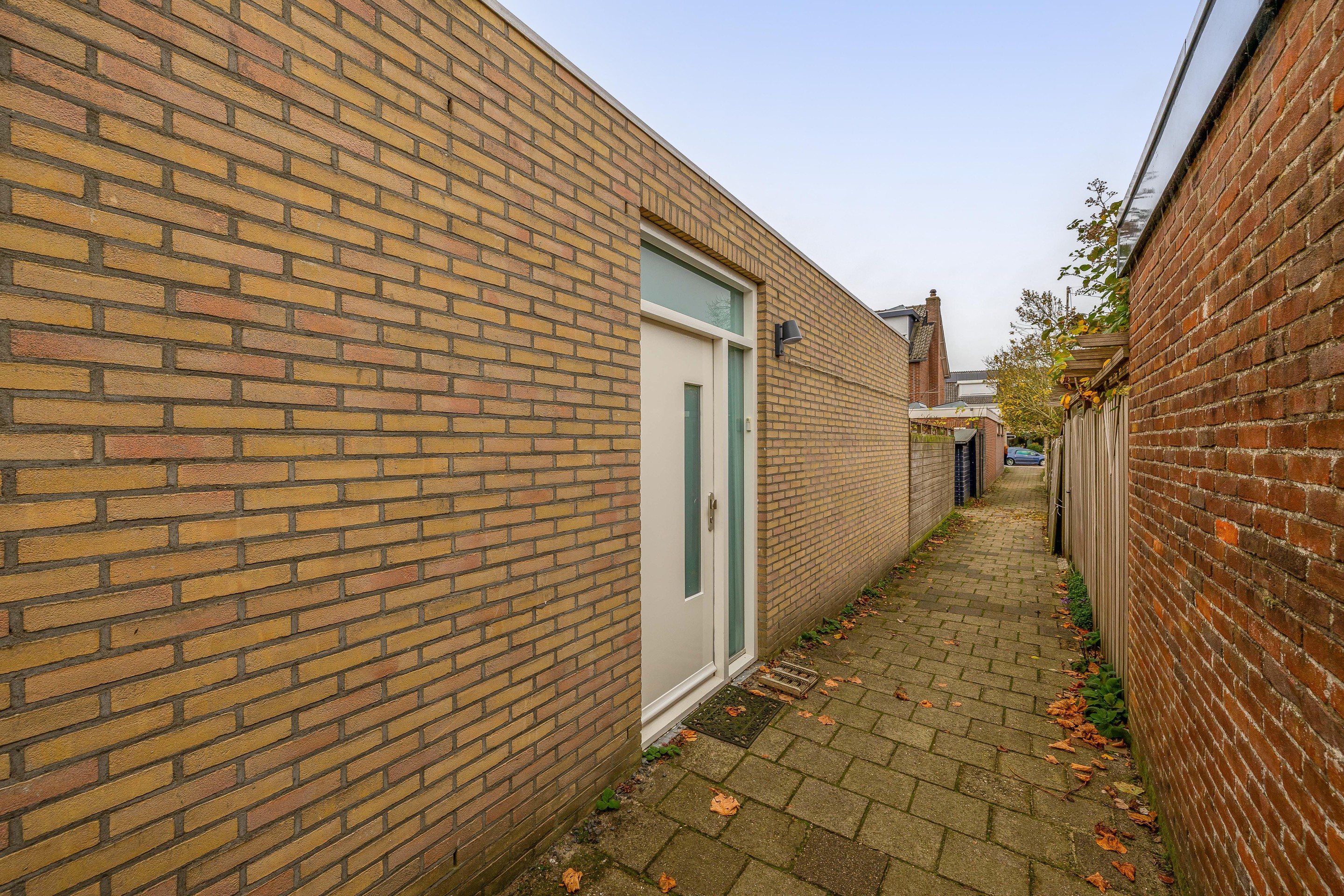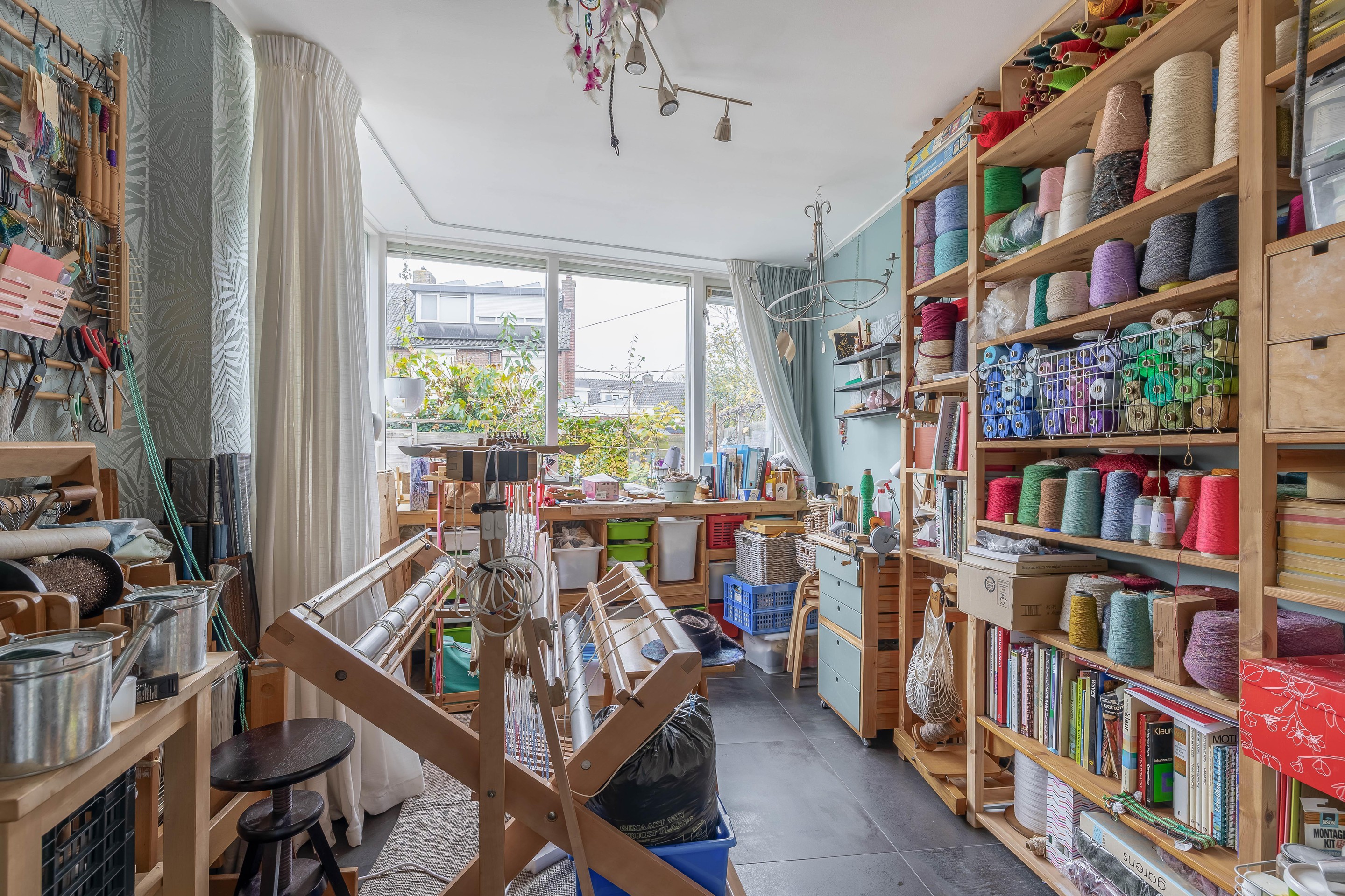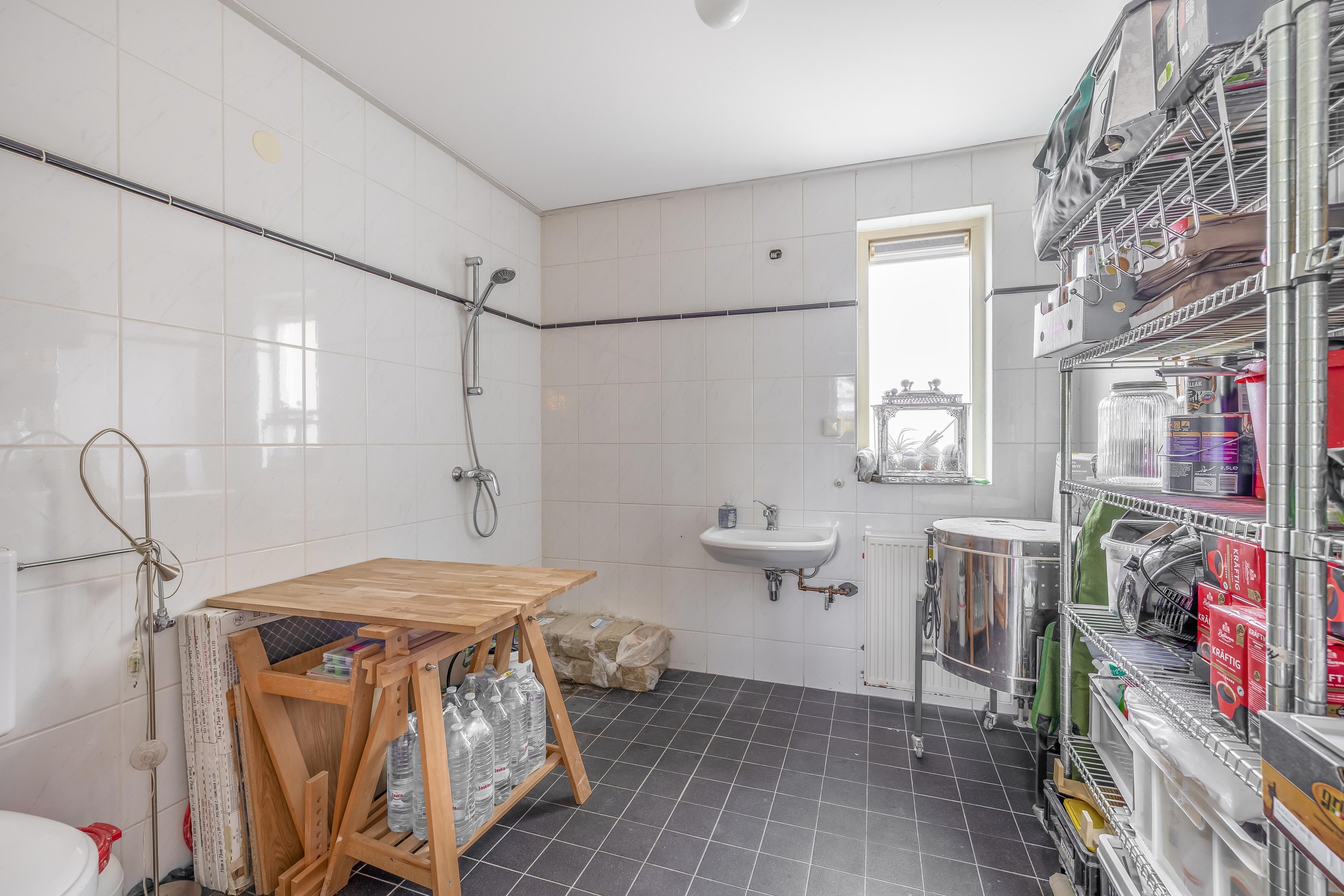 Een unieke toevoeging is het aangebouwde gedeelte aan de zijkant, toegankelijk vanuit de woonkamer. Deze uitbouw herbergt een hal met een directe buitendeur, een ideale werk- of slaapkamer, en een royale, geheel betegelde badkamer compleet met douchehoek, wastafel en toilet. Dit biedt uitstekende mogelijkheden voor gelijkvloers wonen.