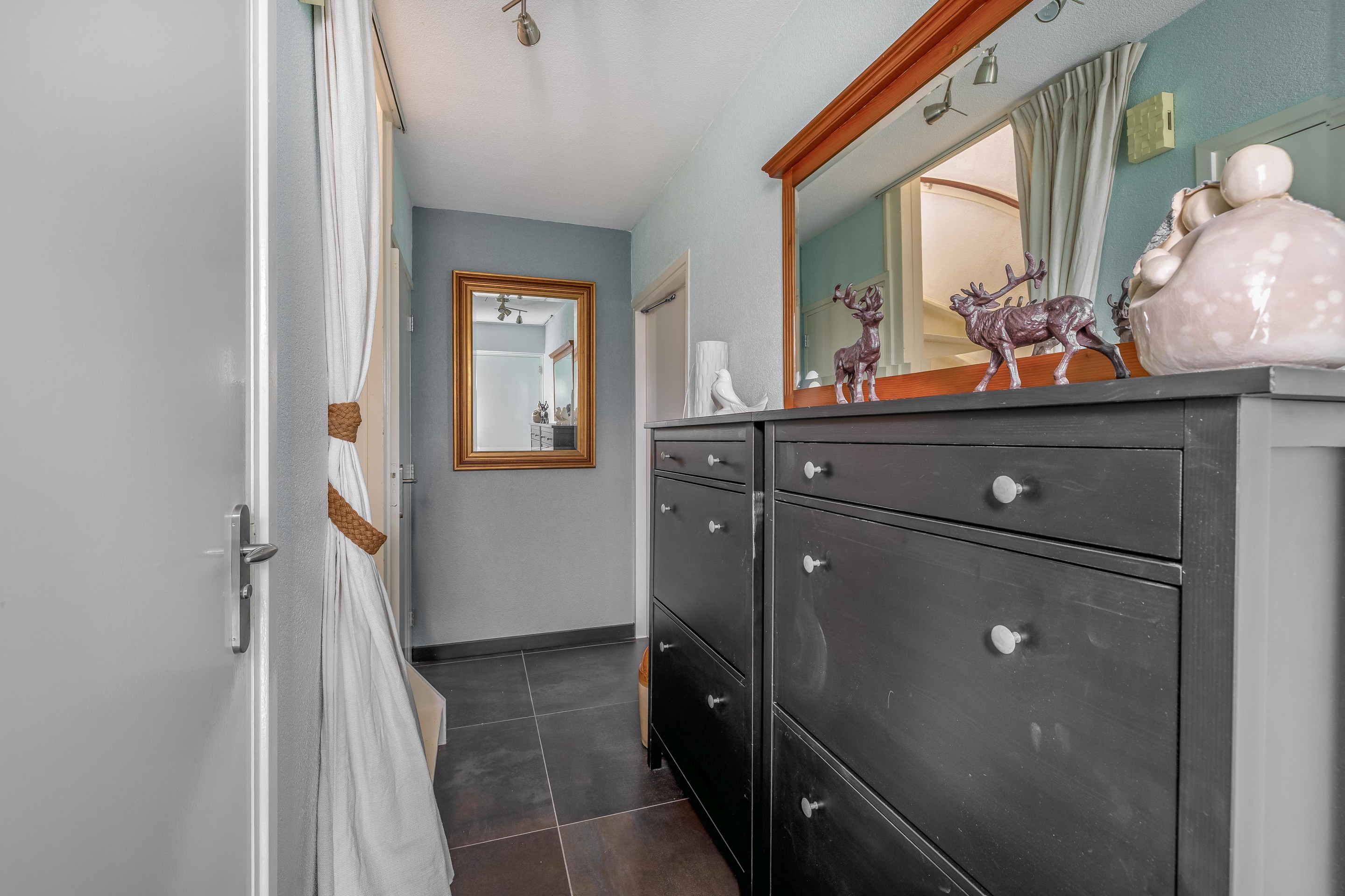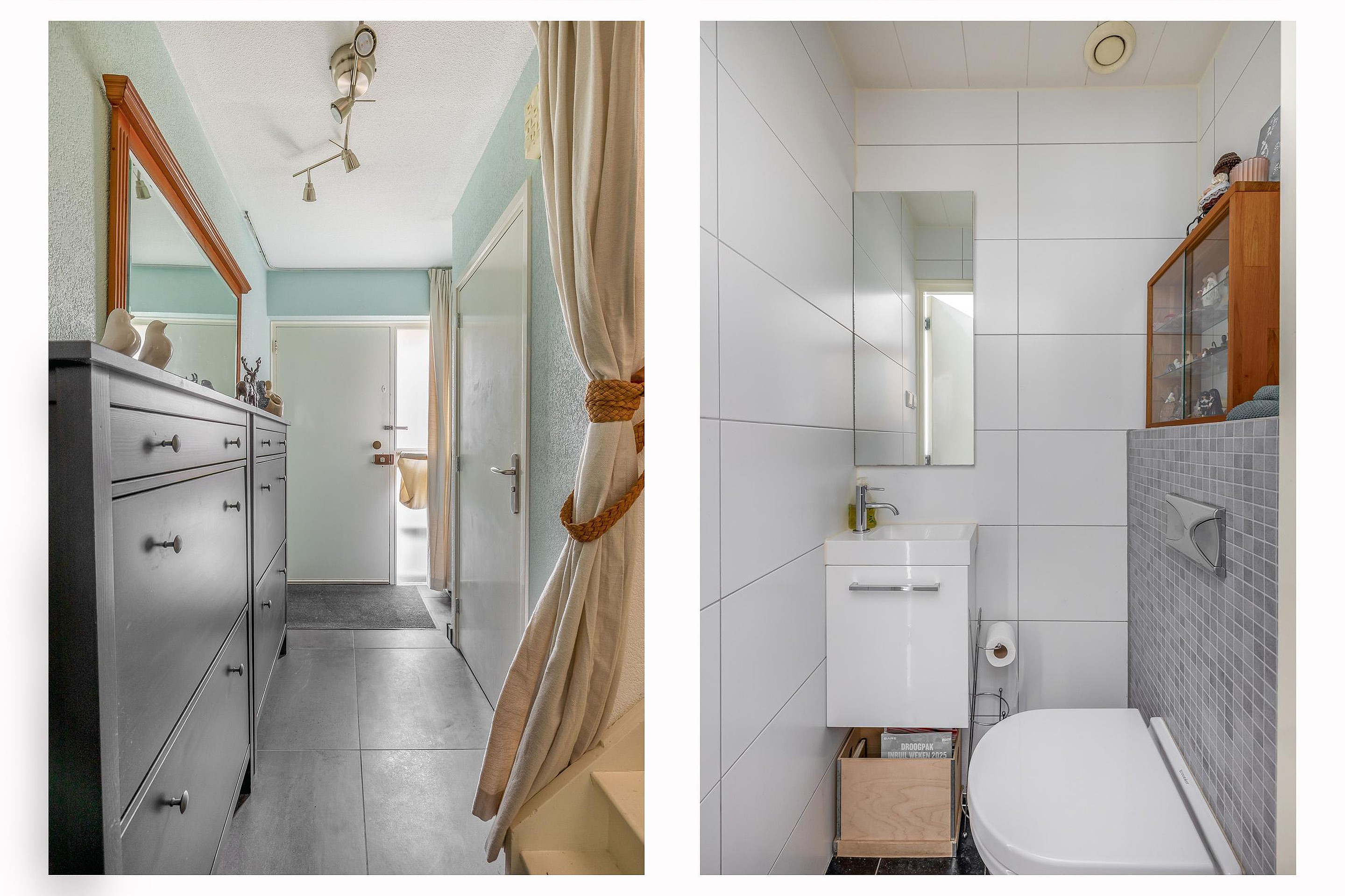 Begane grond Begane Grond: U betreedt de woning via een ruime en lichte ontvangsthal. Hier vindt u de meterkast (met 8 groepen en 2 aardlekschakelaars), een praktische trapkast, het geheel betegelde gastentoilet met vrij hangend closet, fontein, mechanische afzuiging en inbouwverlichting, en de trap naar de eerste verdieping.