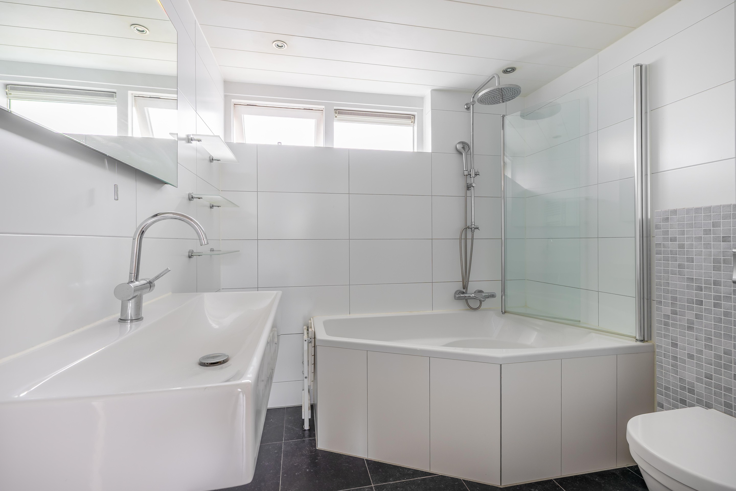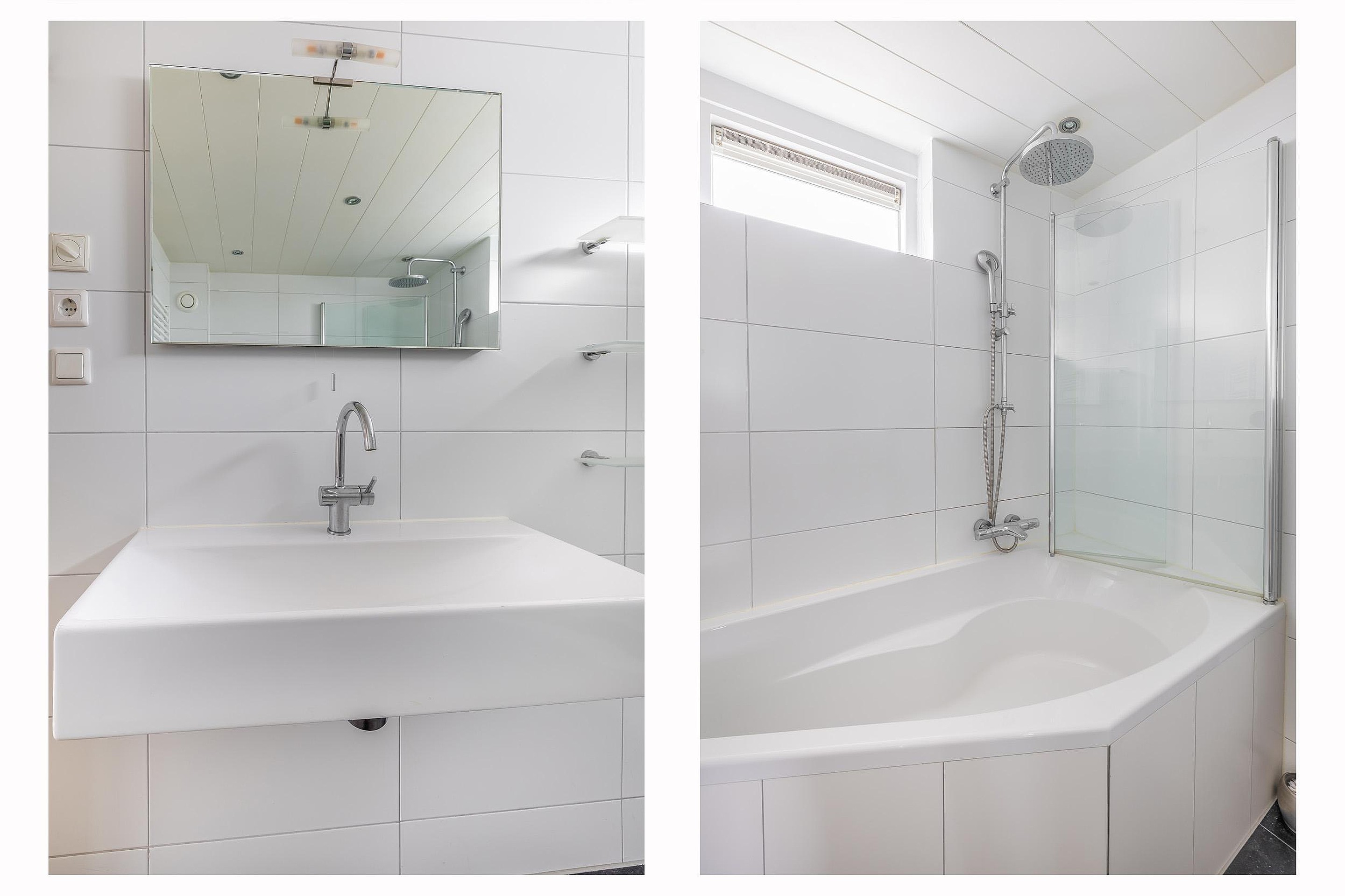 Op de overloop is bovendien een handige vaste kast te vinden. De geheel betegelde badkamer is compleet uitgerust met een ligbad met douchemogelijkheid en douchescherm, een vrij hangend toilet en een wastafel. In het plafond zijn inbouwspots aanwezig.