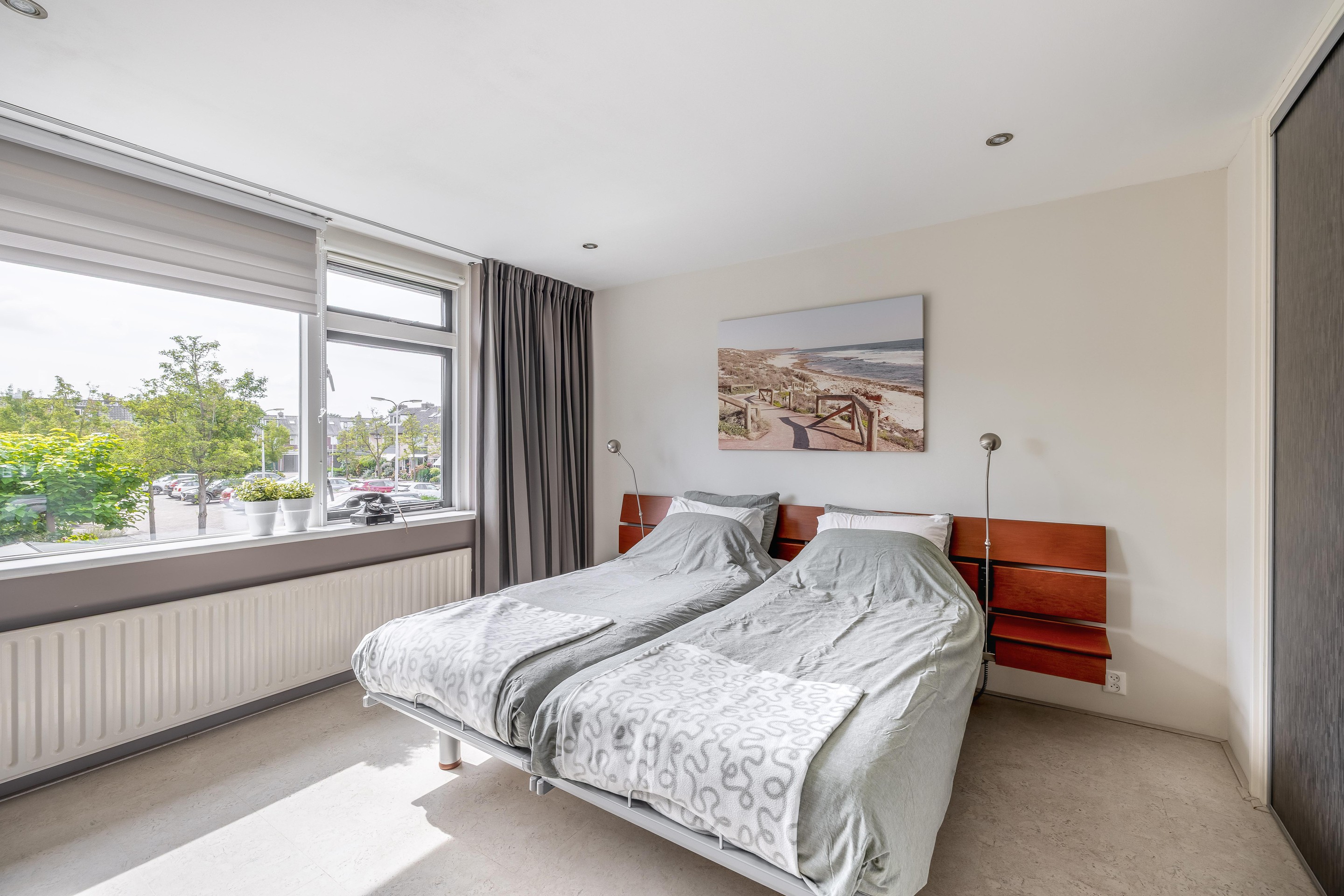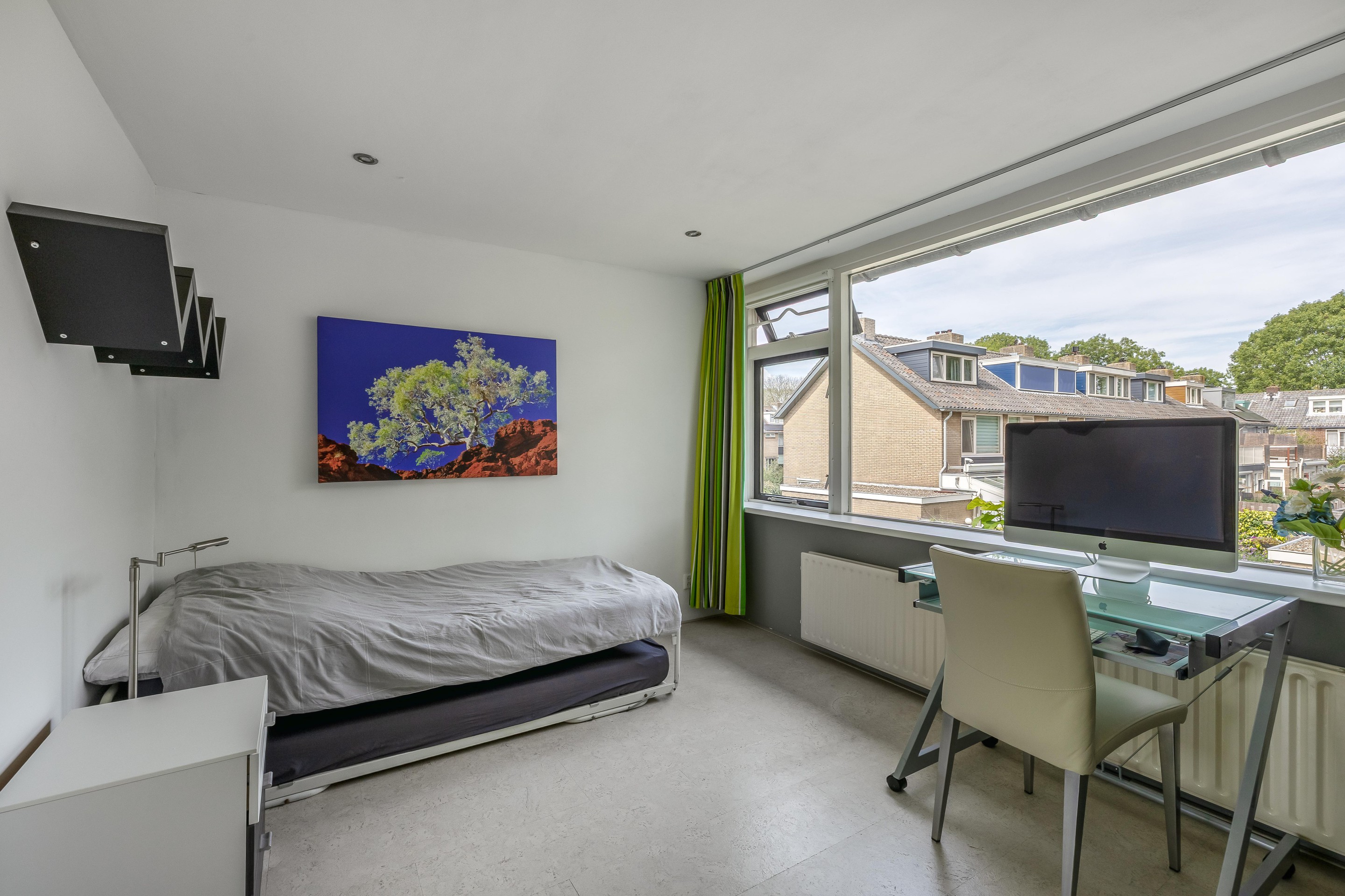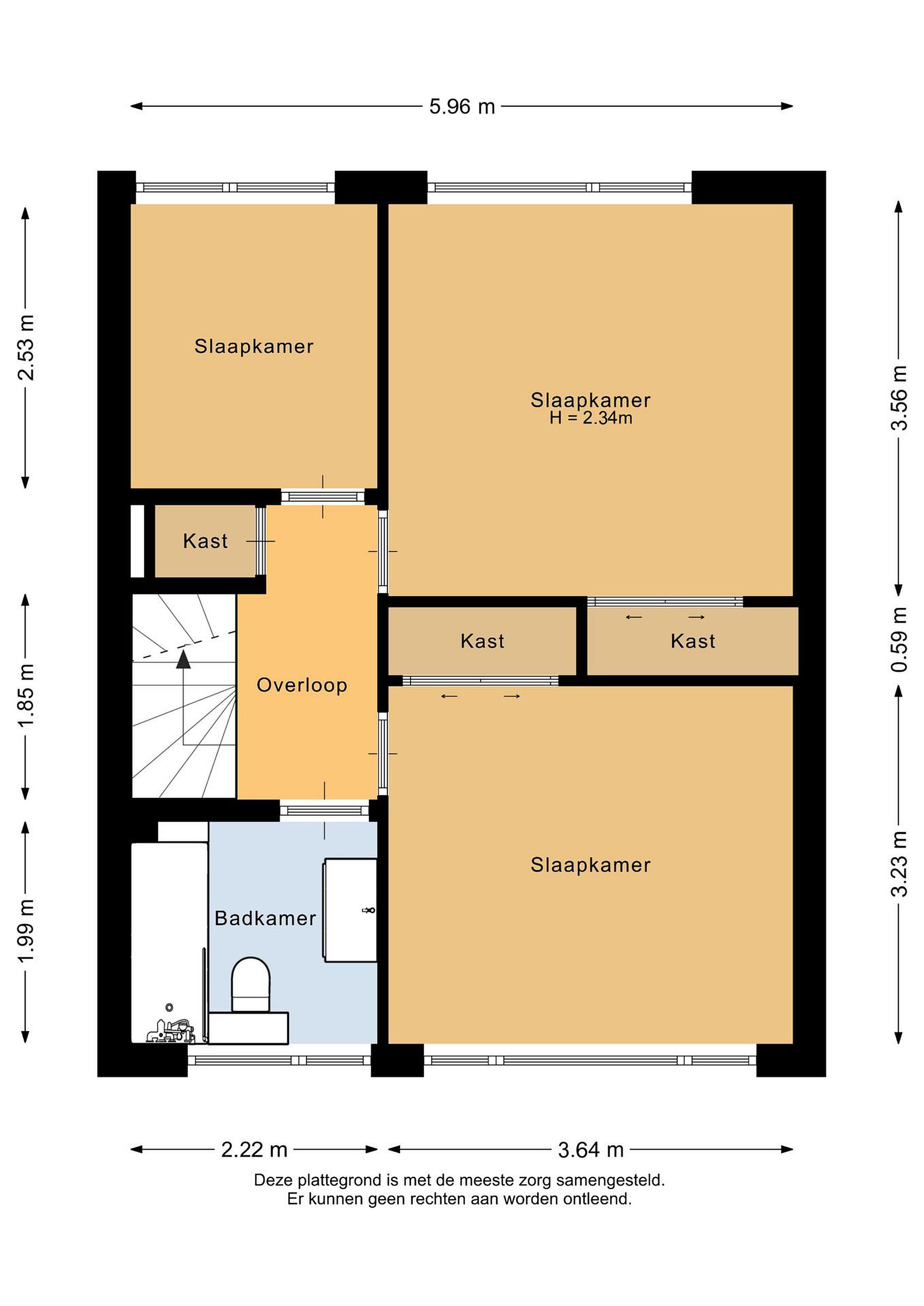 Eerste verdieping De overloop geeft toegang tot drie slaapkamers, een badkamer en een opbergkast. Aan de achterzijde ligt een compacte kamer van 2,22 bij 2,53 meter, die zich uitstekend leent als kinder- of werkkamer. Daarnaast vind je de ruime master bedroom van 3,64 bij 3,56 meter, voorzien van een vaste kast (met schuifdeuren) in de tussenmuur. Beide kamers aan de achterzijde zijn voorzien van rolluiken. Aan de voorzijde ligt de derde slaapkamer van 3,64 bij 3,23 meter, die eveneens beschikt over een vaste kast met schuifdeuren.