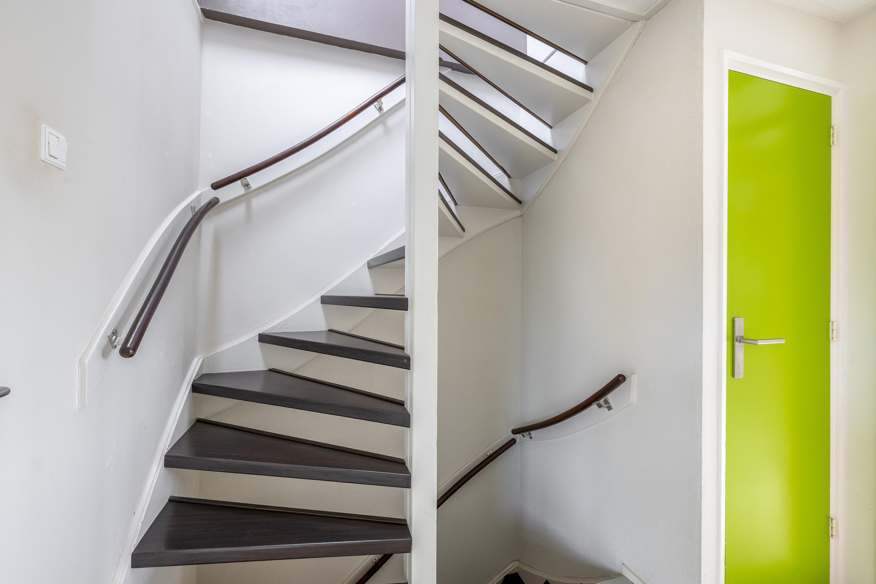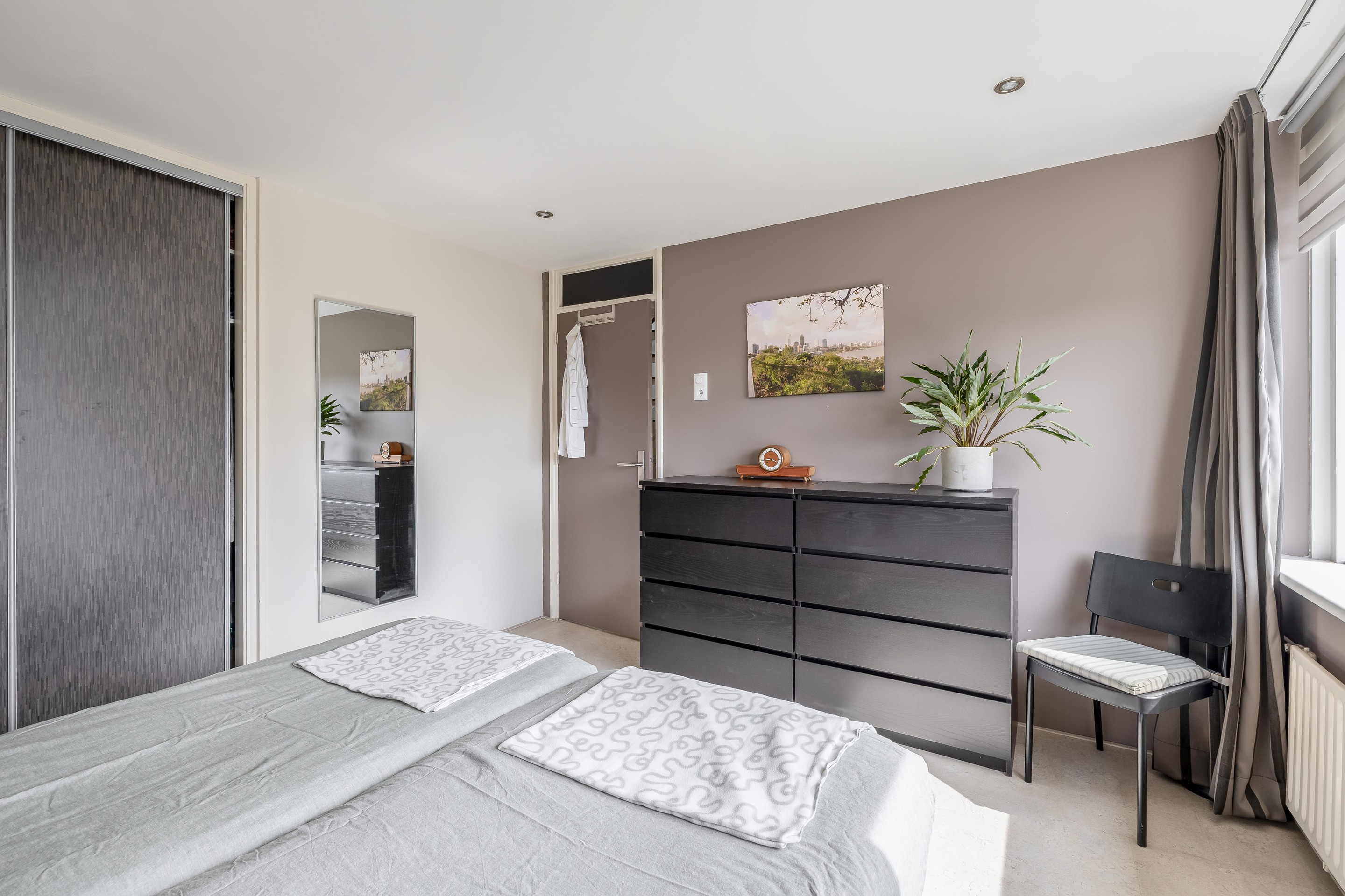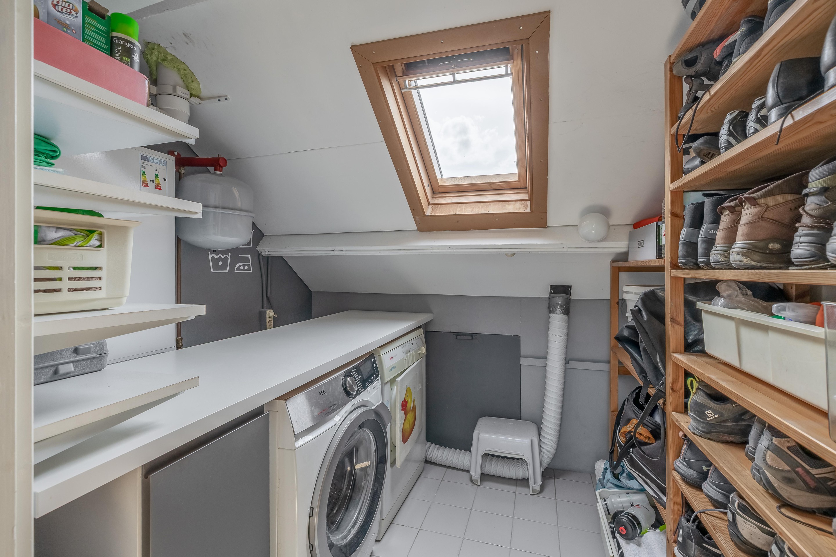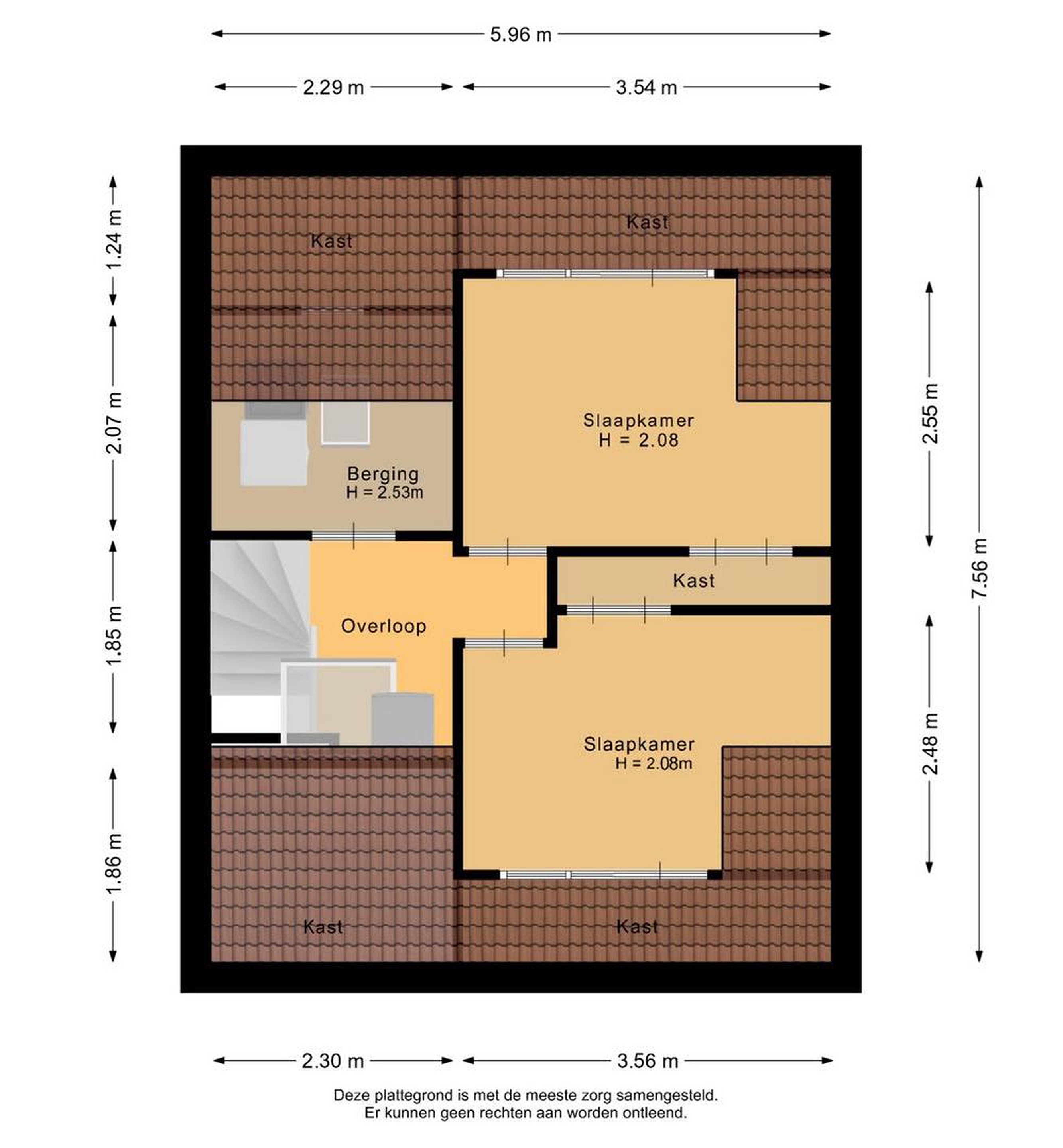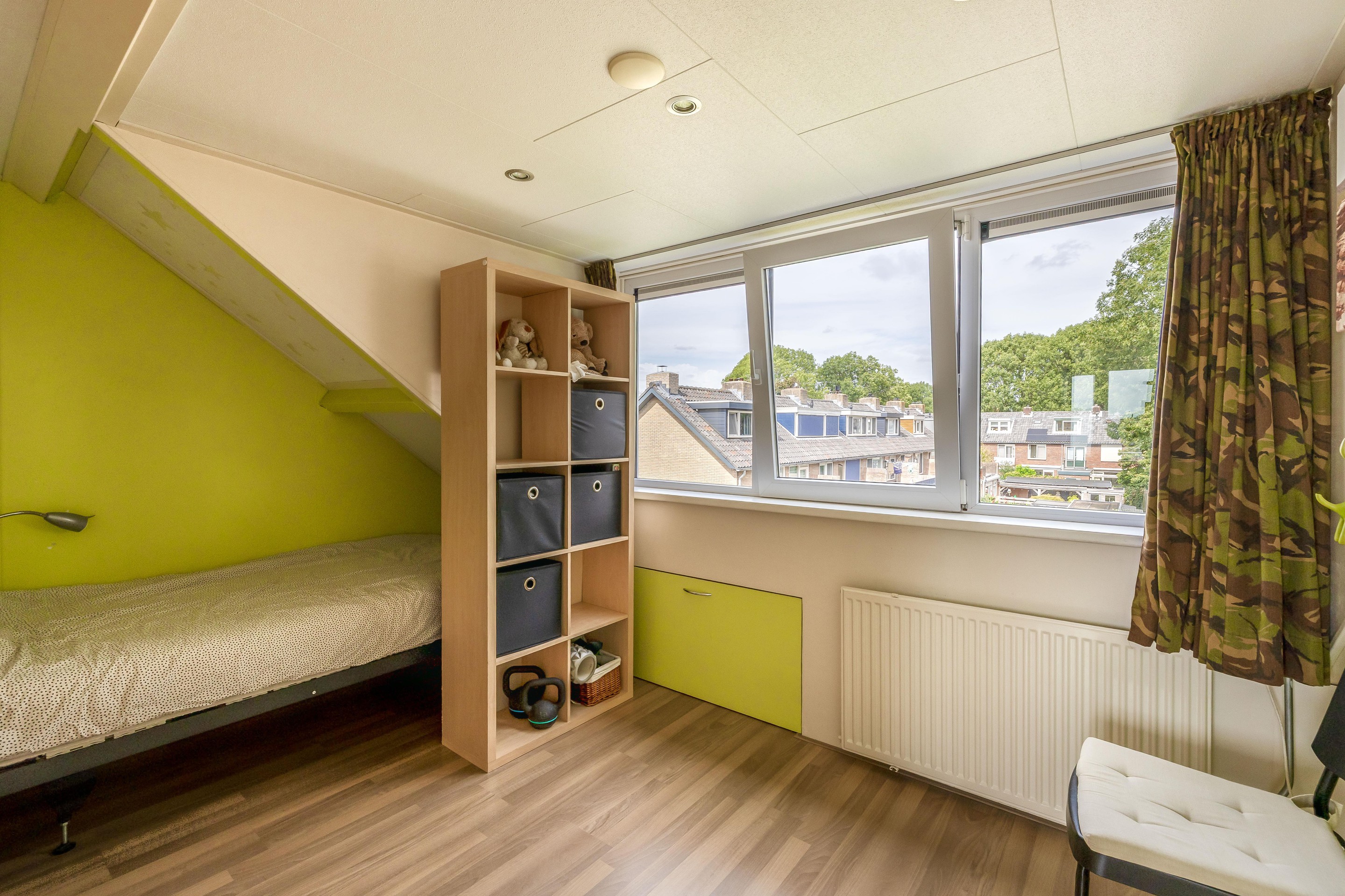 Tweede verdieping De zolderverdieping is verdeeld in drie delen. Op de voorzolder is een afgesloten wasruimte ingericht met plek voor de cv-ketel, wasmachine, droger en de omvormer van de zonnepanelen die op het dak liggen. Het andere deel van de voorzolder bestaat uit een (deels) afgesloten bergruimte. Vanuit hier bereik je twee slaapkamers, beide gesitueerd onder een dakkapel en voorzien van een laminaatvloer en inbouwspots in het plafond. De kamer aan de achterzijde meet circa 3,54 bij 2,55 meter en geeft toegang tot een kleine bergzolder. De slaapkamer aan de voorzijde is 3,56 bij 2,48 meter groot. De kozijnen zijn uitgevoerd in kunststof en uitgerust met draaikiepramen. Alle ruimtes op zolder onder het dak zijn afgetimmerd en kunnen worden gebruikt als opbergruimte.