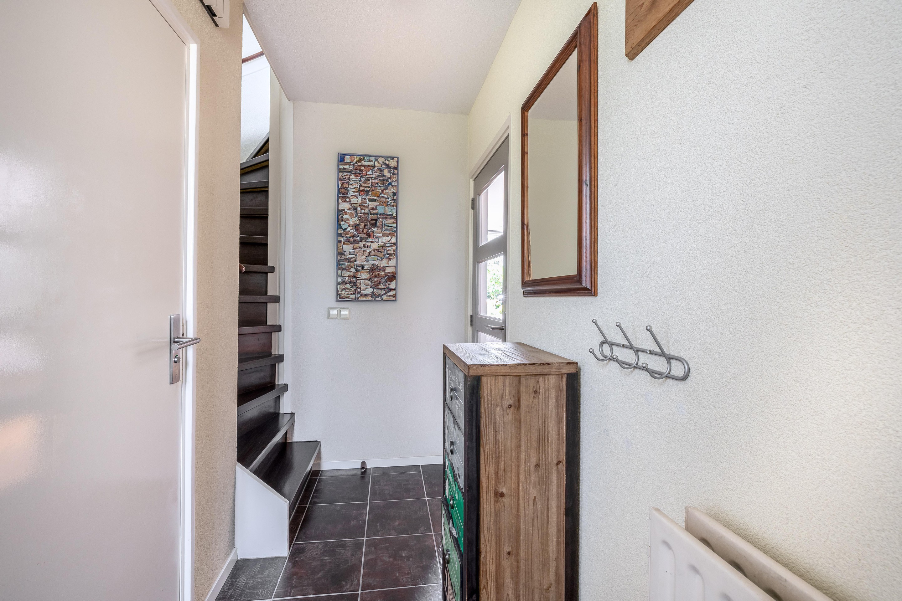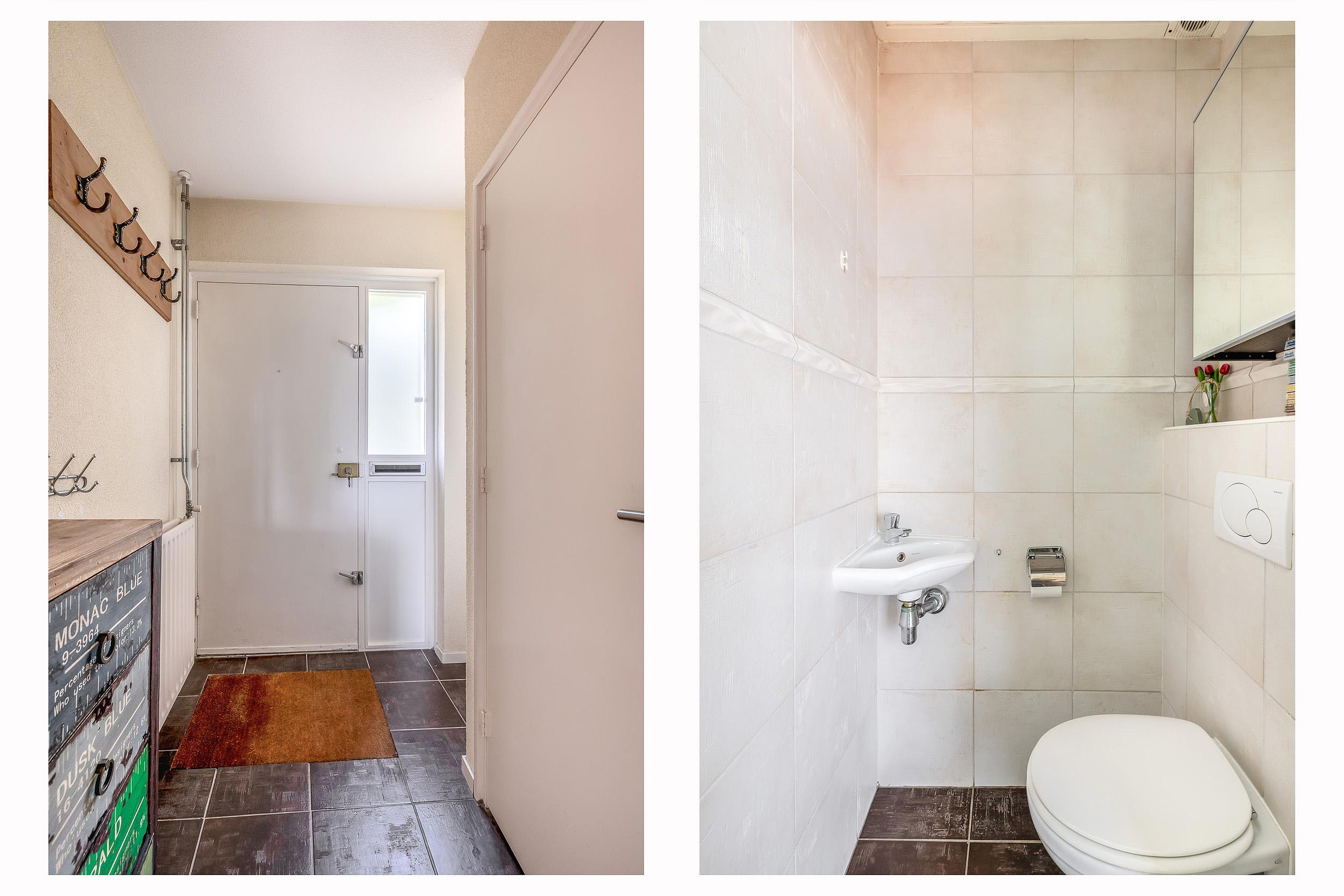Achter de voordeur kom je in de hal met garderobe, meterkast en een modern toilet (beide voorzien van een tegelvloer). De meterkast is uitgebreid naar 10 groepen, een kookgroep en 3 aardlekschakelaars. Vanuit de hal bereik je de woonkamer met halfopen keuken en de trap naar de eerste verdieping.