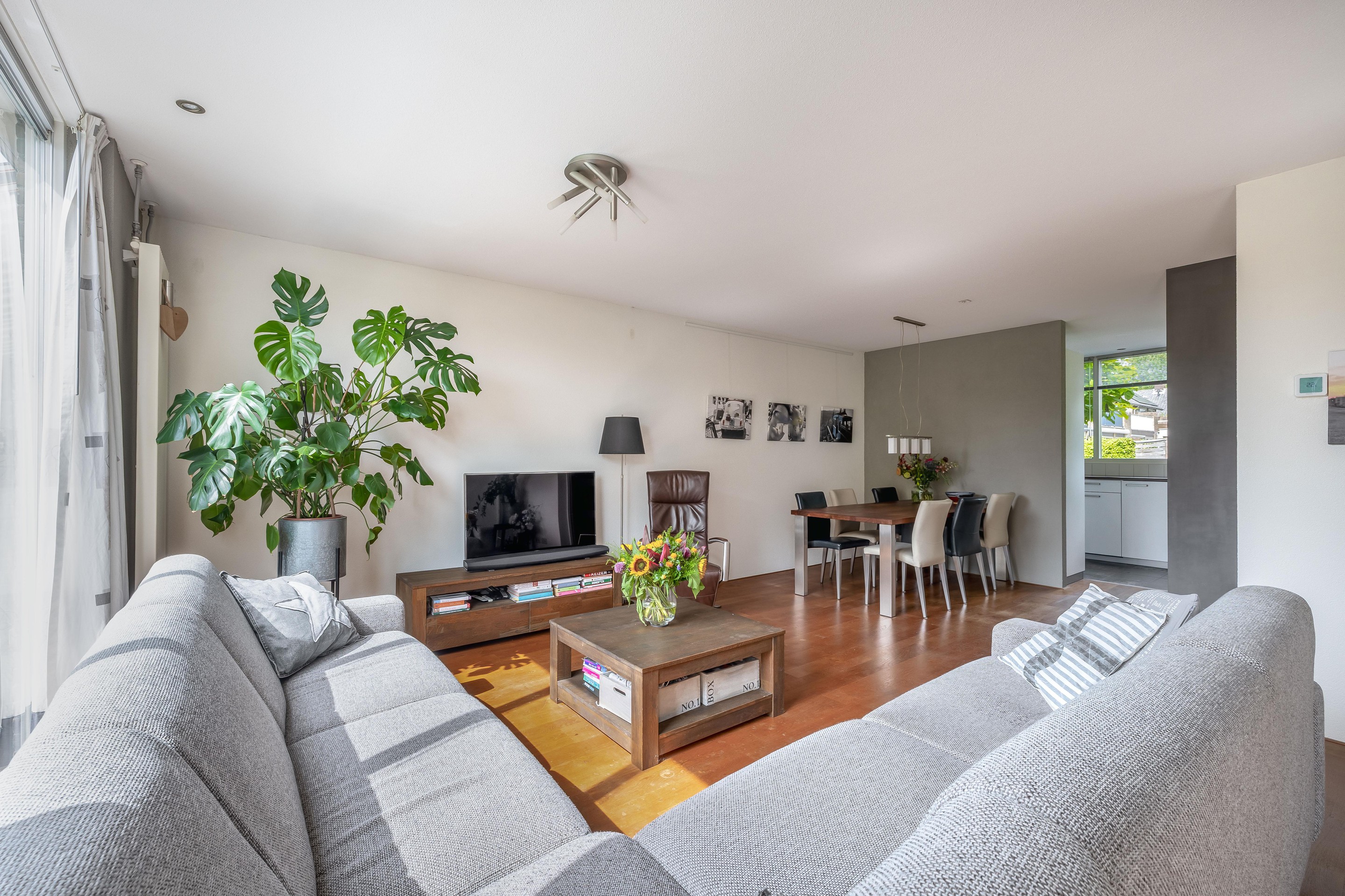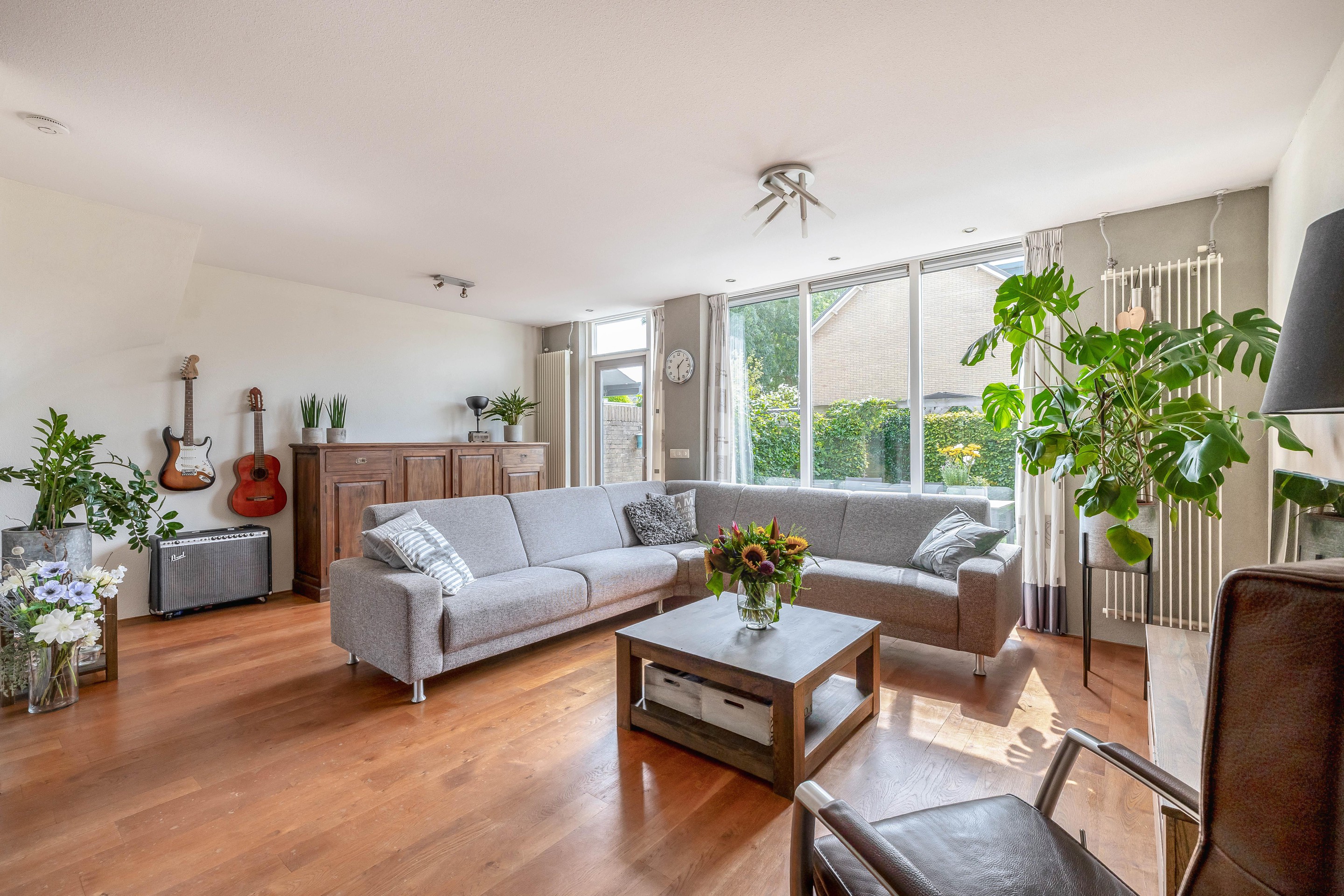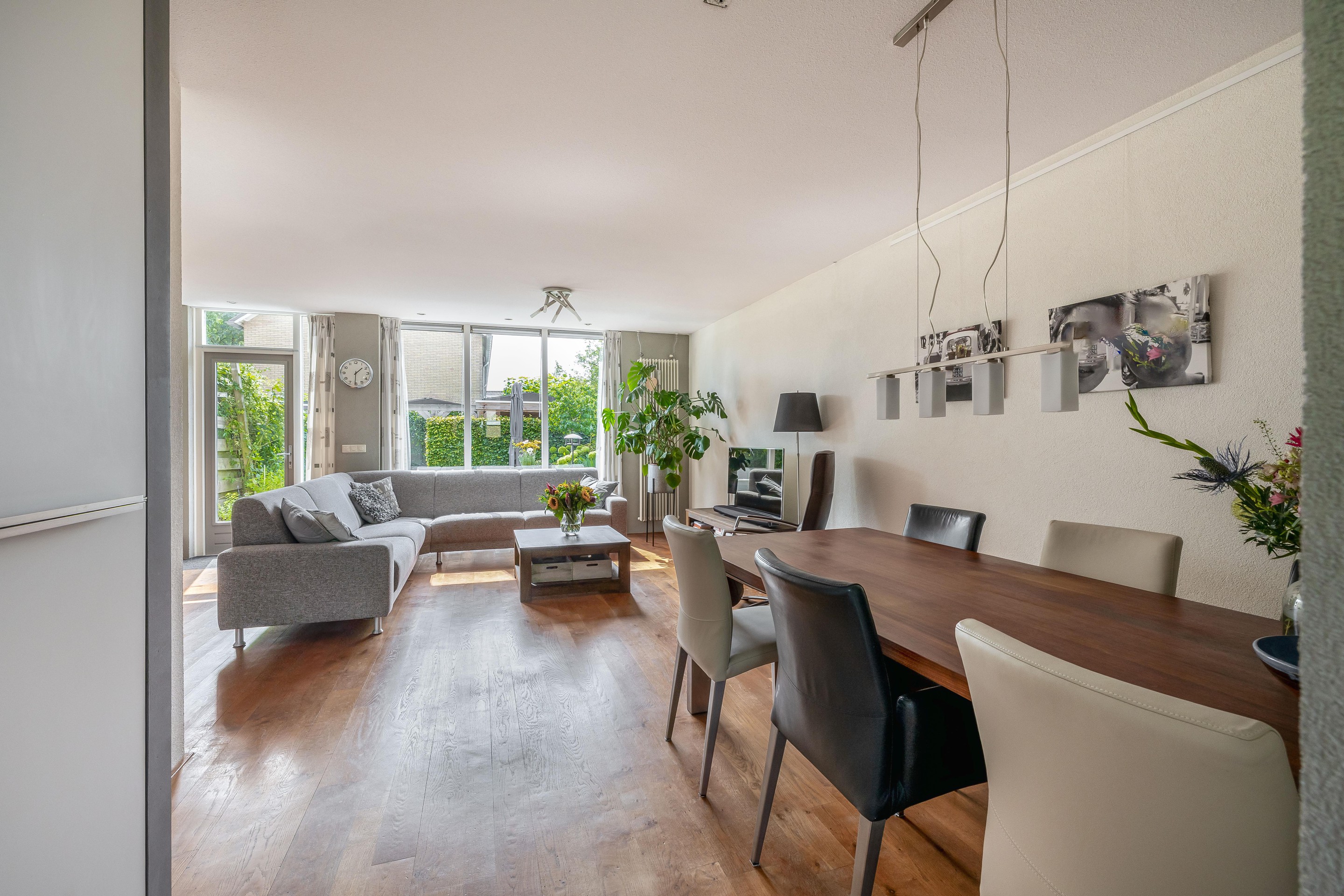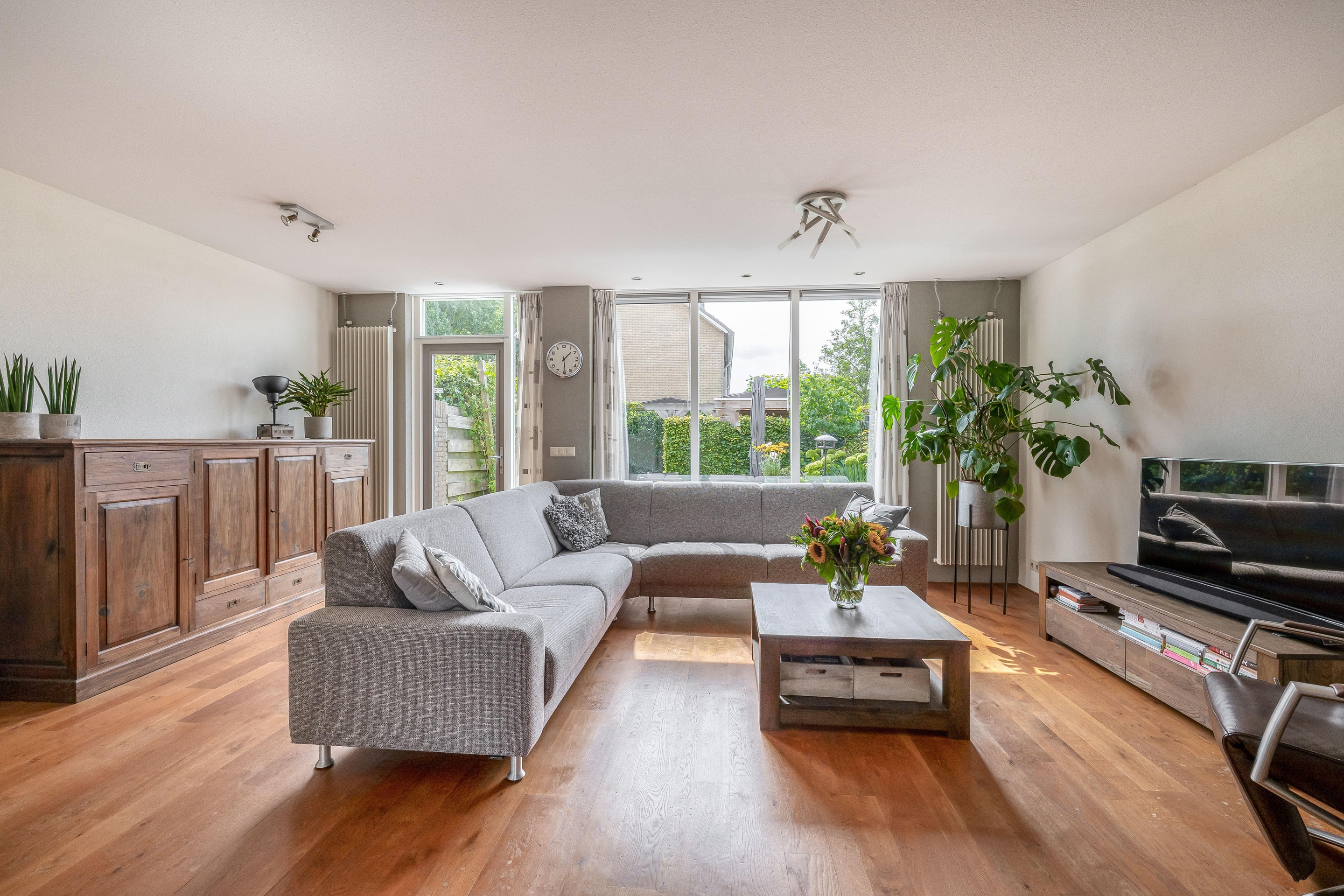 De woonkamer is van het type tuinkamer, wat betekent dat hij volledig aan de tuinzijde ligt en daardoor veel daglicht krijgt. De achterpui is vernieuwd en voorzien van grote glaspanelen, wat zorgt voor extra lichtinval. De woonkamer is afgewerkt met een hardhouten vloer (van 21 mm en volledig te schuren), spachtelputz op de wanden en inbouwspots in het plafond.