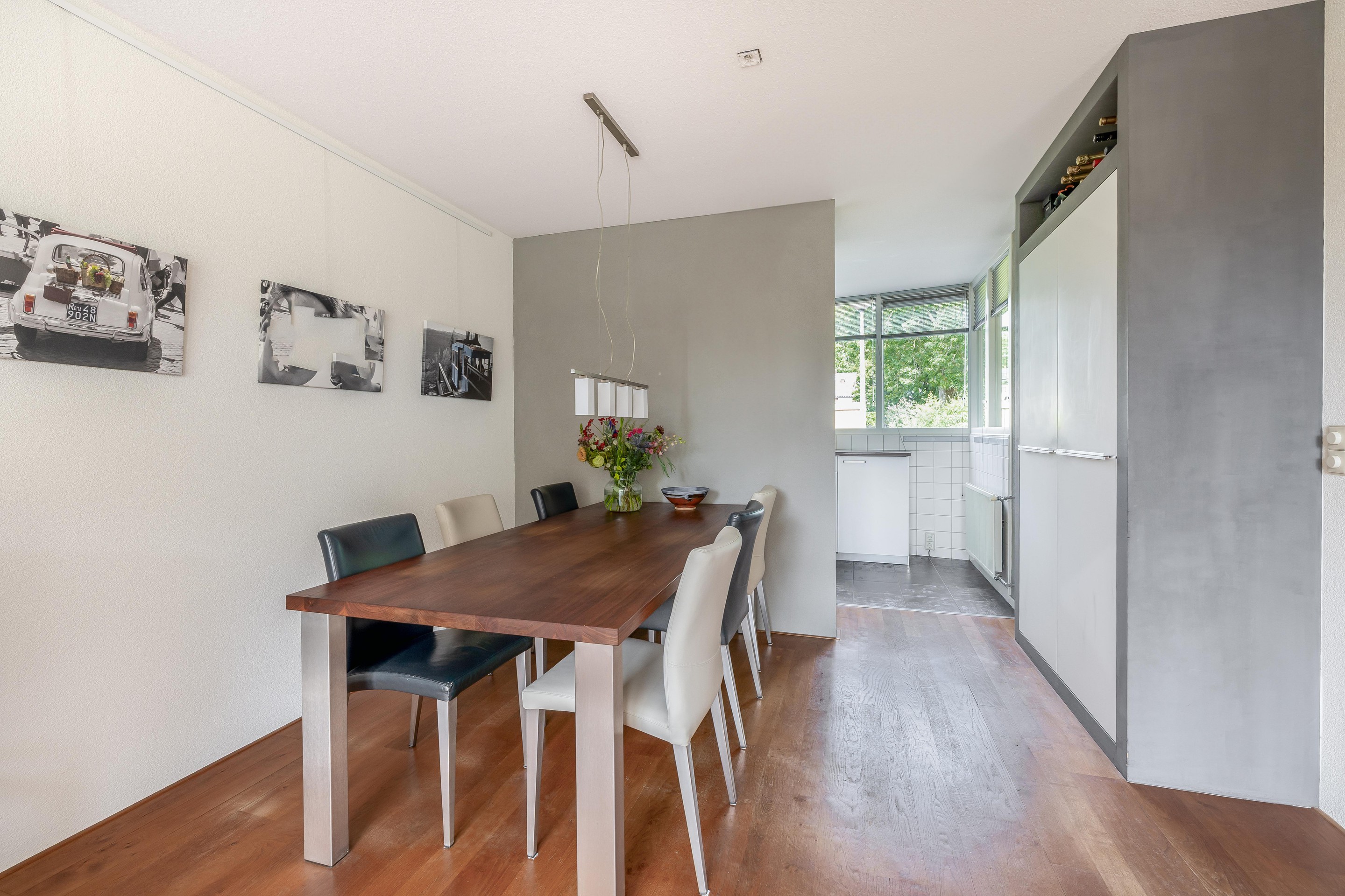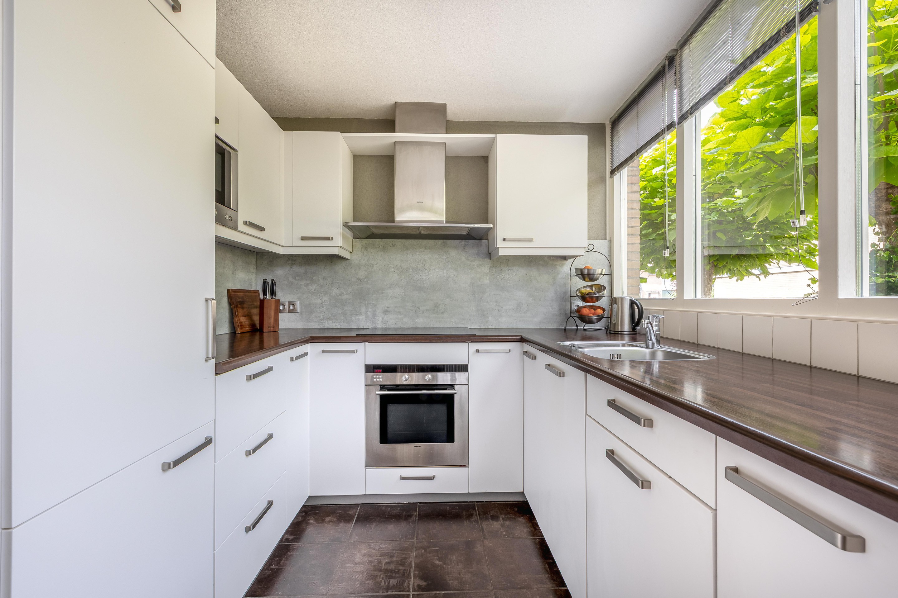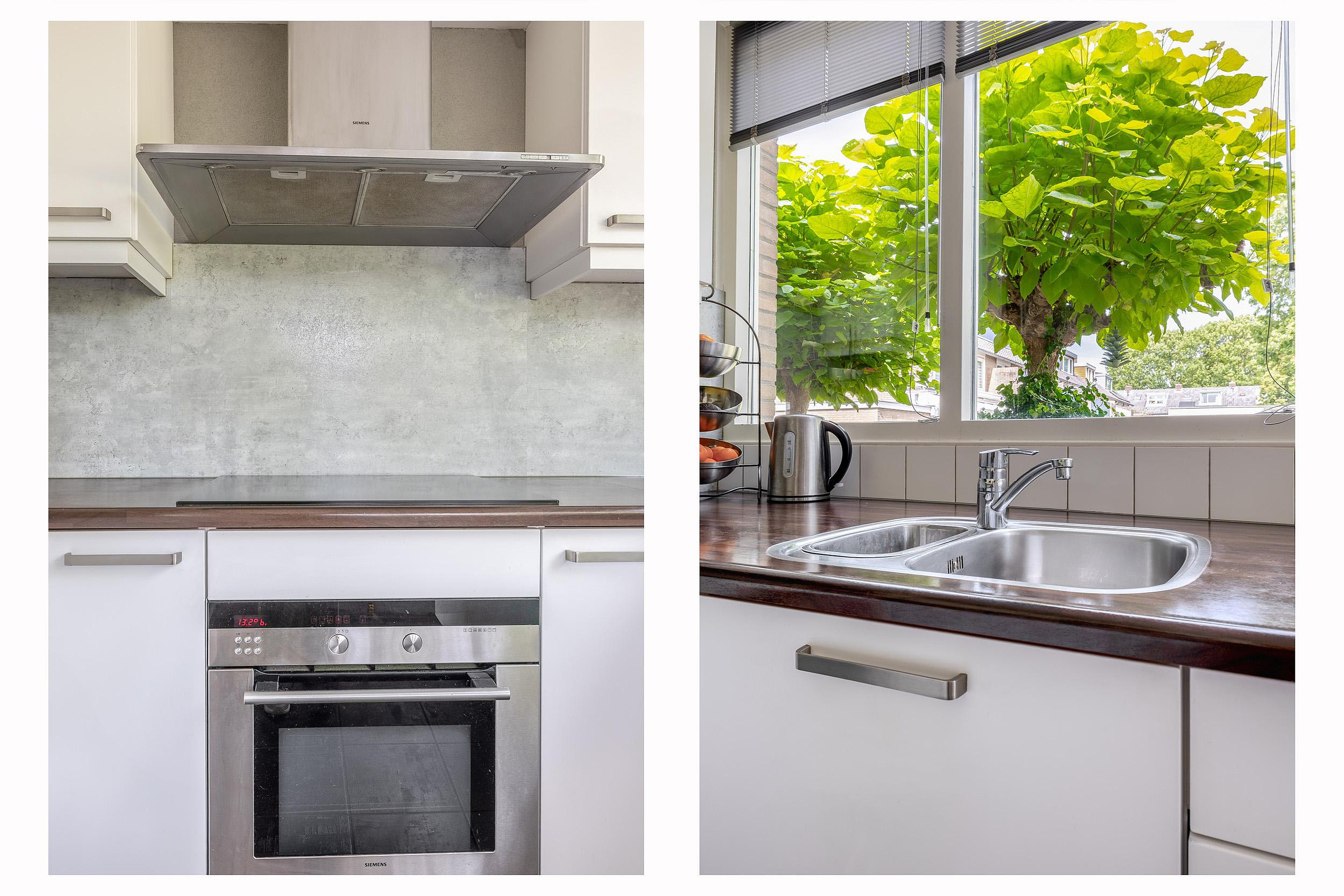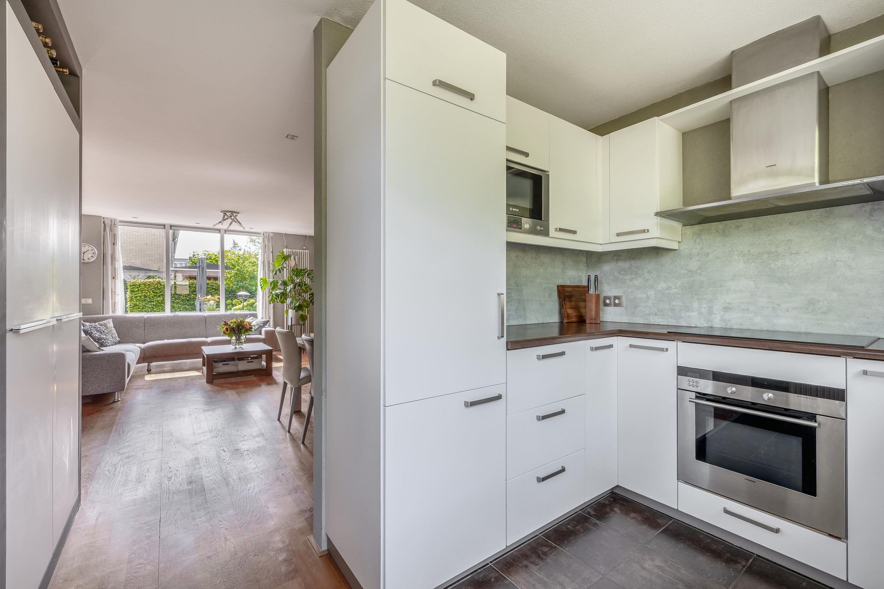 De keuken ligt aan de voorzijde en is bereikbaar via een doorgang met vaste kasten. Dankzij de uitbouw is hier een ruime U-opstelling ontstaan. Je vindt er een brede inductiekookplaat, afzuigkap, vaatwasser, oven, magnetron en een koel-vriescombinatie. De vloer is afgewerkt met identieke tegels als in de hal en het toilet.
