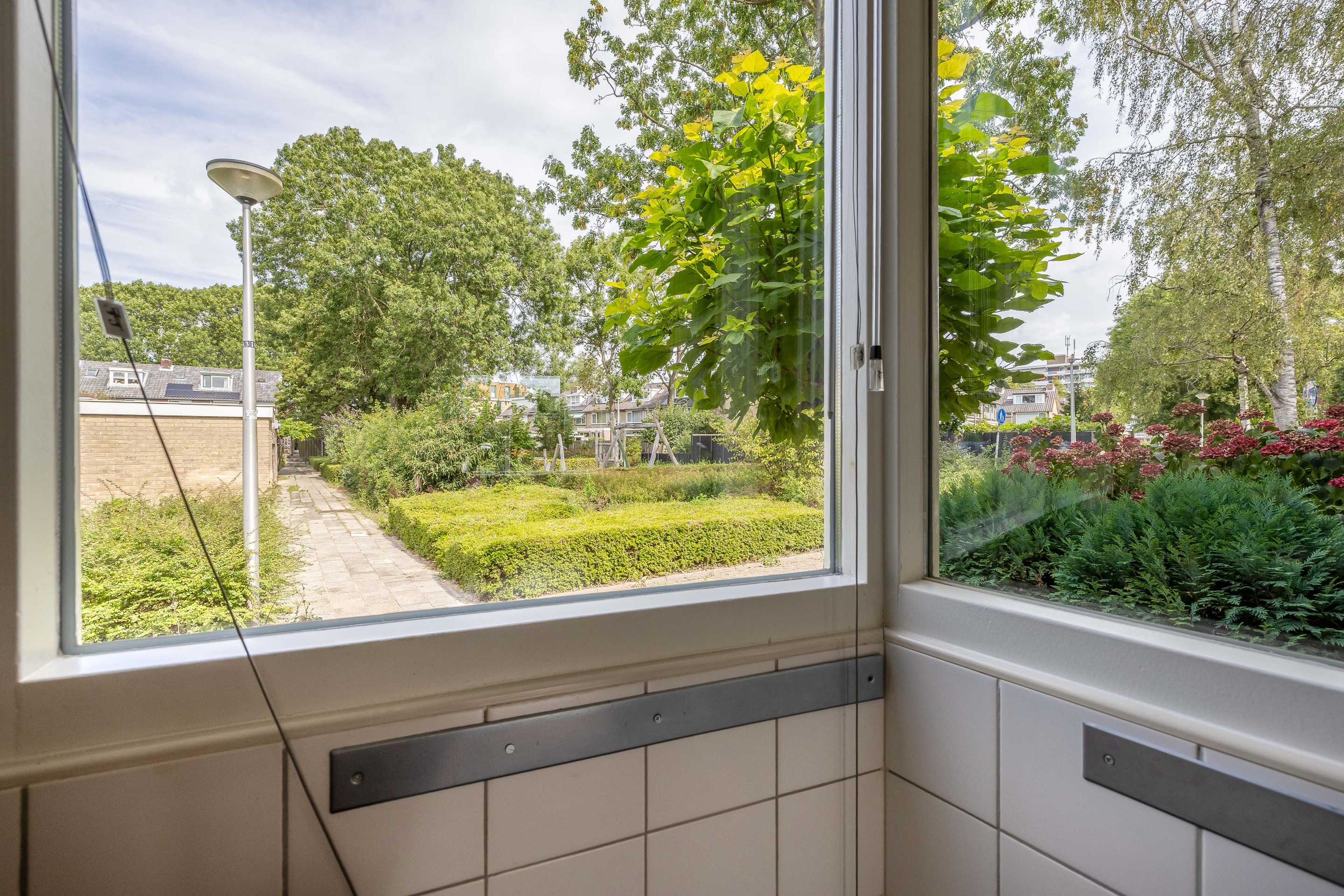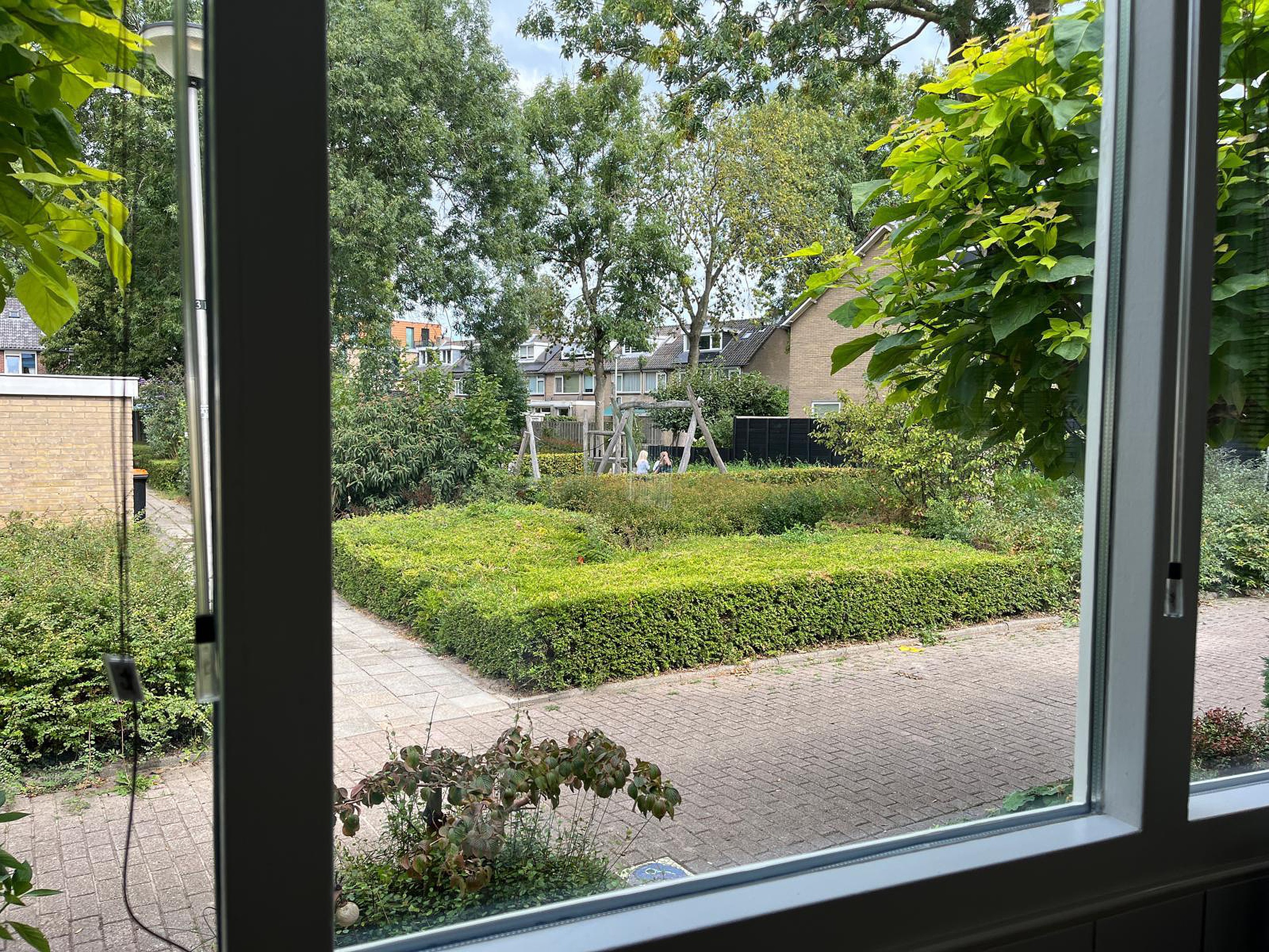 Begane grond Bij aankomst valt direct de uitbouw met het afdakje bij de voordeur op. De voortuin is netjes aangelegd met siergrind en vaste beplanting. Voor het huis ligt een brede groenstrook waardoor je vrij uitzicht hebt op de omgeving en de speeltuin.