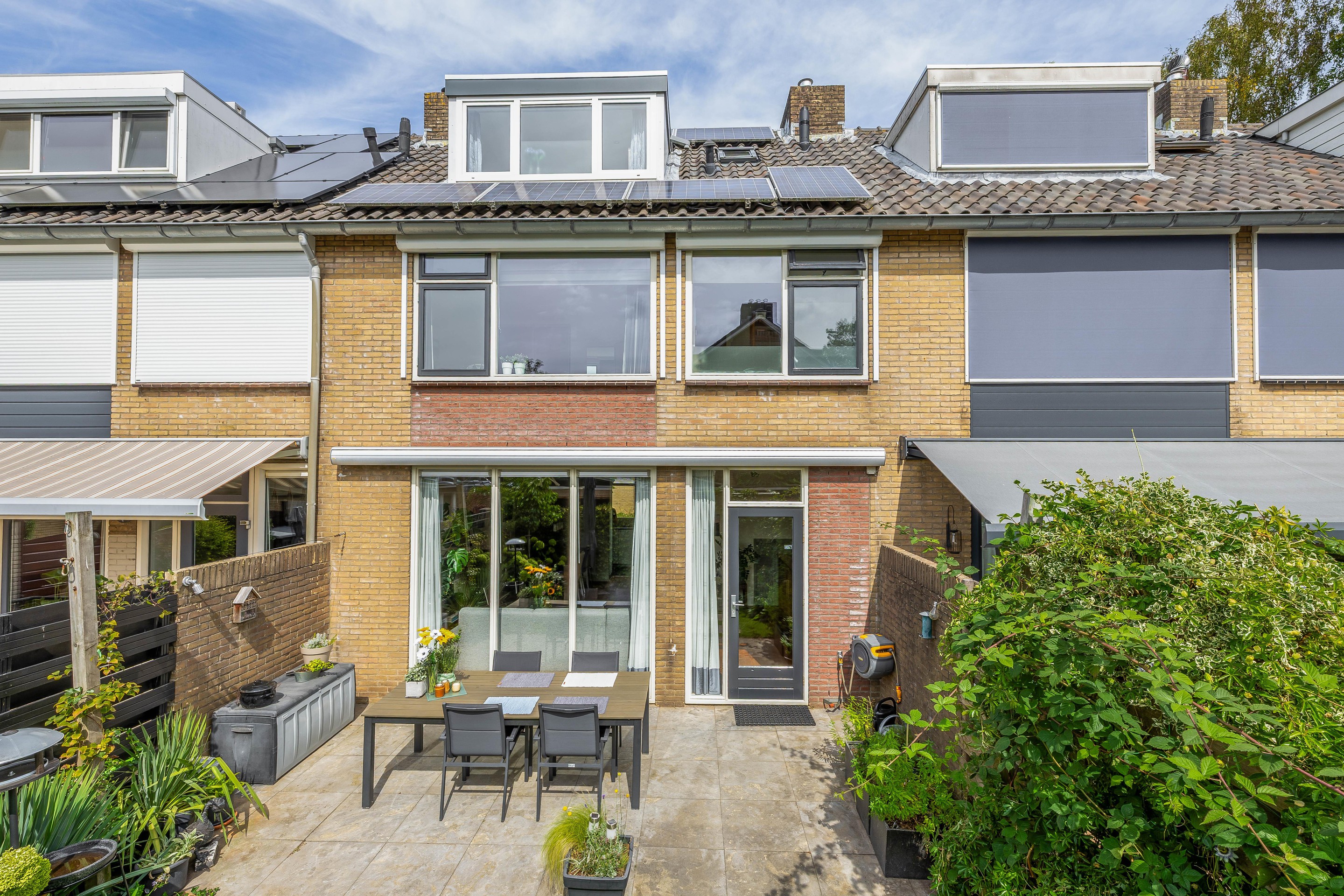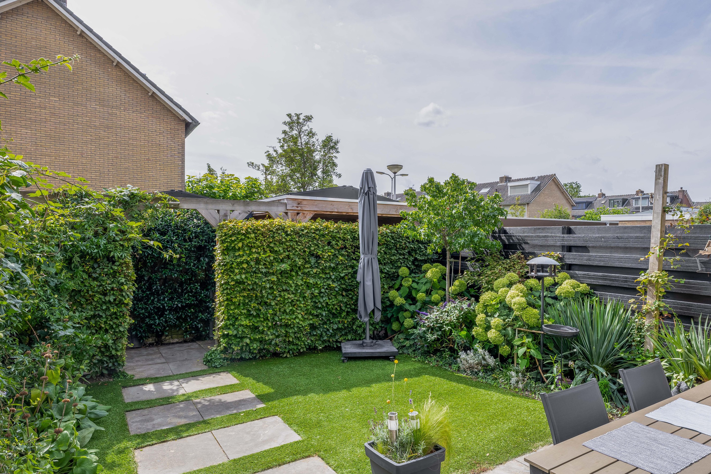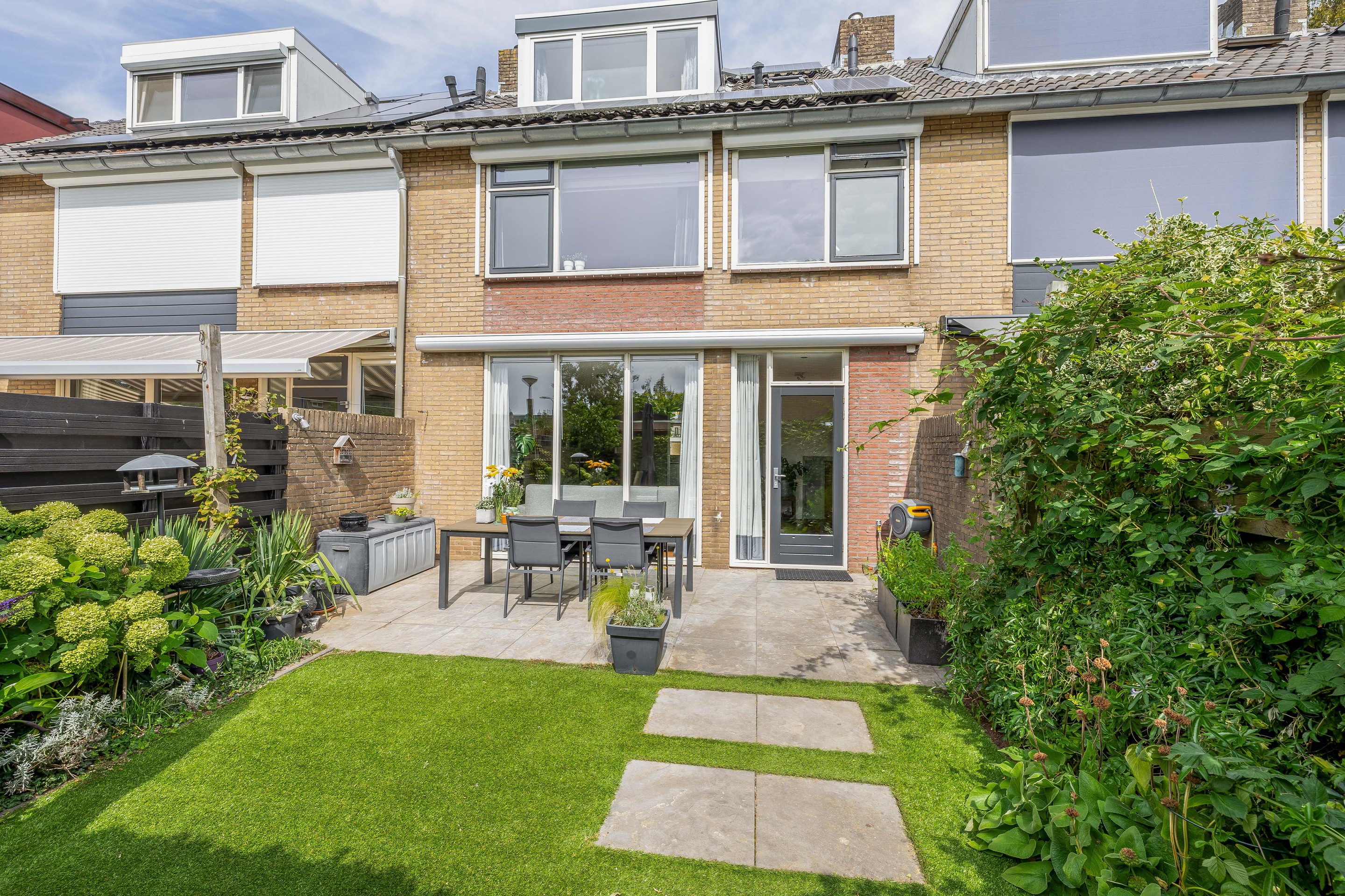 Zowel de voor- als achtertuin zijn netjes aangelegd en onderhouden. De achtertuin ligt op het zuiden en heeft een fijn terras, een kunstgrasveld, een watertappunt en biedt bovendien veel privacy. Aan de achtergevel hangt een groot zonnescherm. Naast de schuur (7,3 m2) is een overkapping gebouwd en rondom de berging staat een pergola. Via de poort aan de achterzijde zijn de parkeerplaatsen goed bereikbaar.
