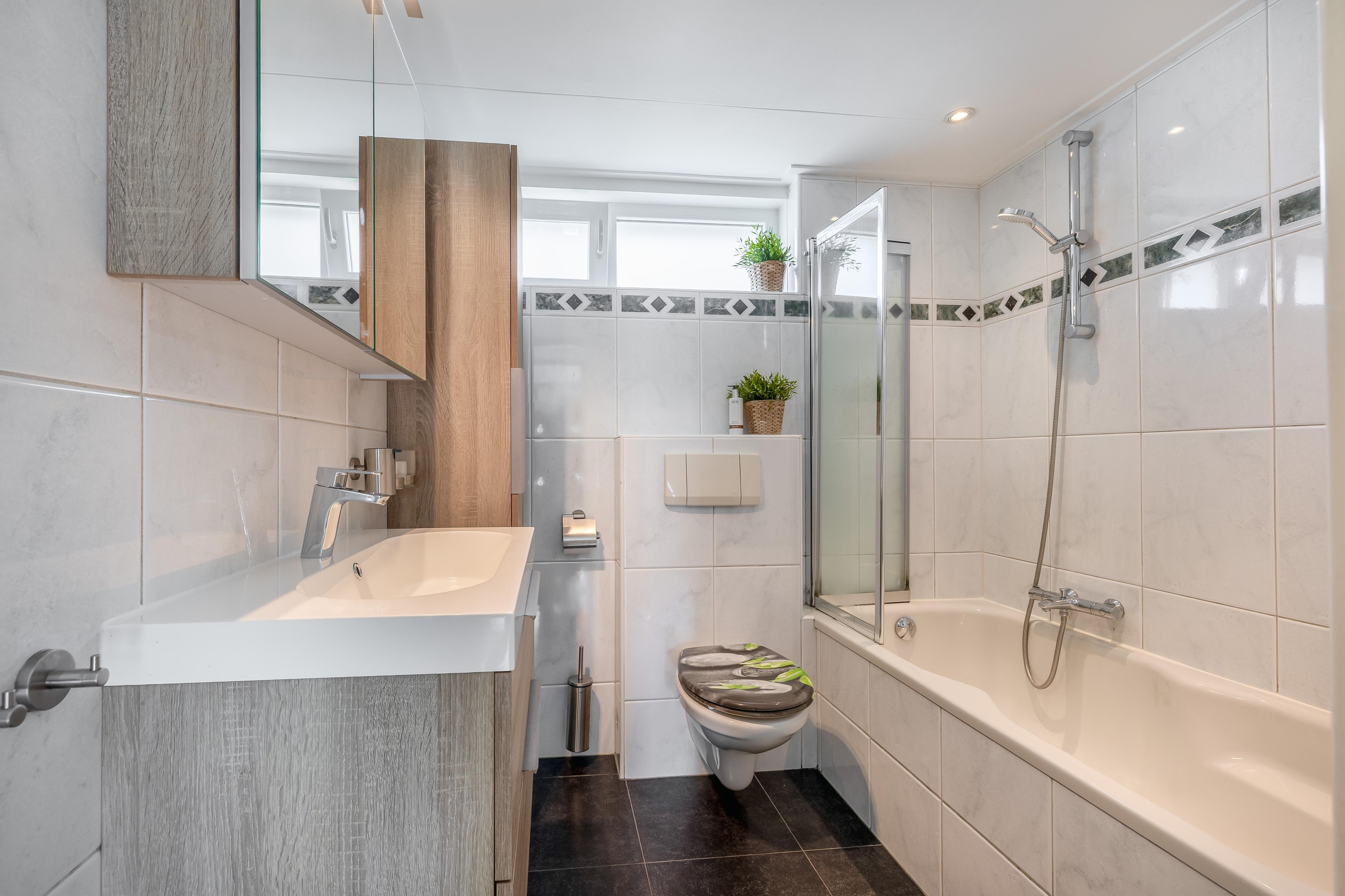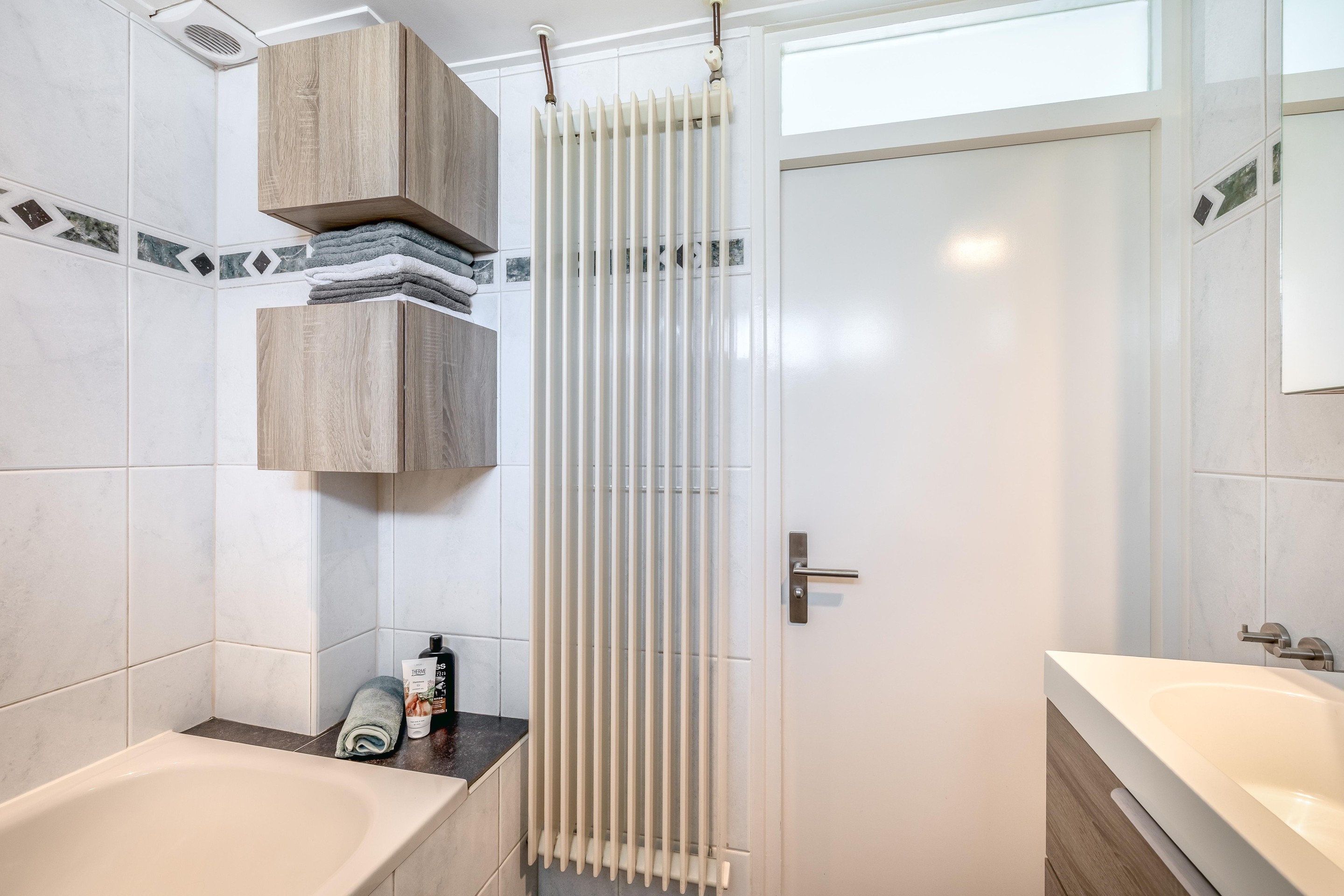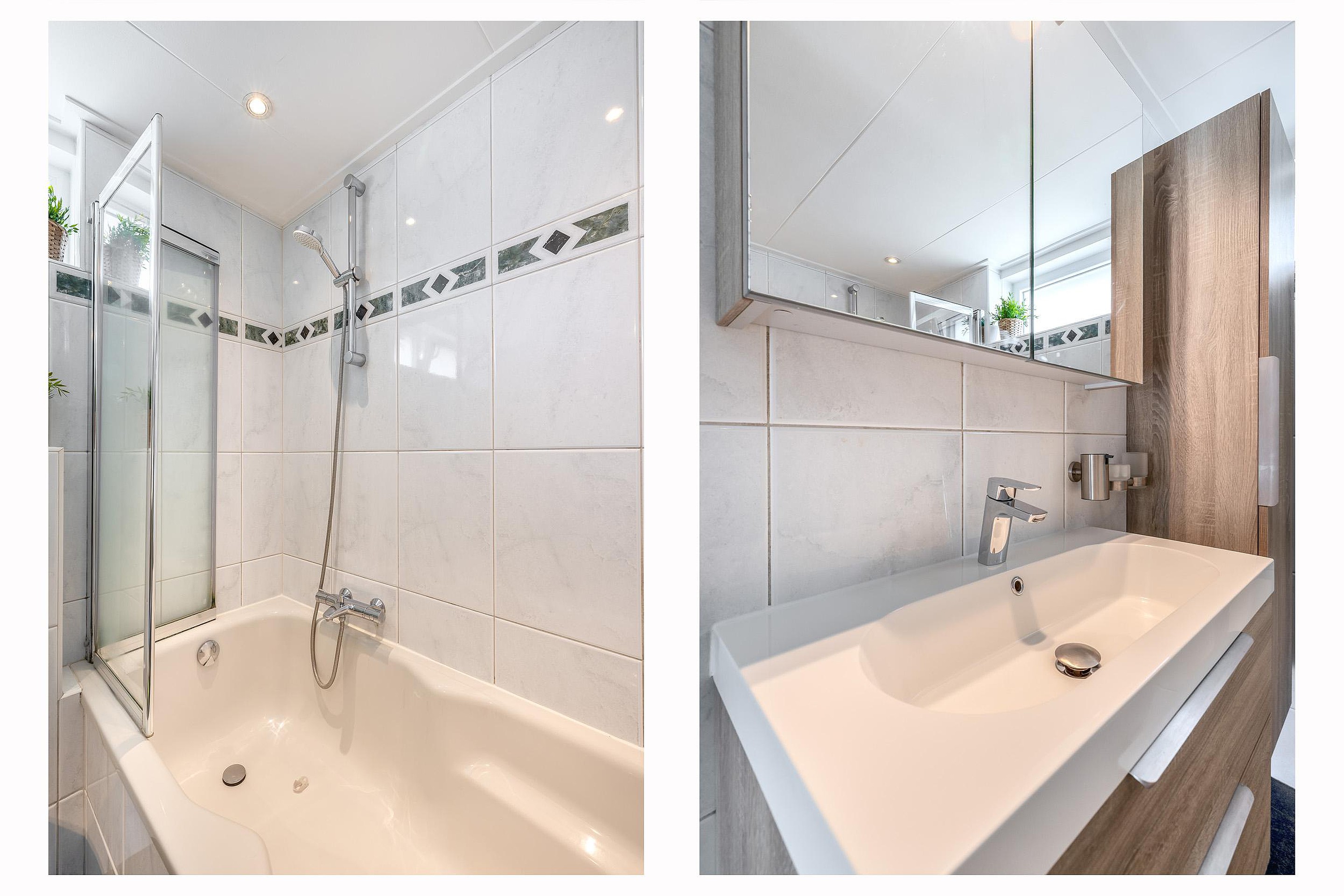 De badkamer is uitgevoerd met een ligbad, een toilet, een breed wastafelmeubel met bergkast, twee kleinere kasten, een designradiator en mechanische ventilatie. Dankzij het draaikiepraam van kunststof, kun je de ruimte ook eenvoudig natuurlijk ventileren.