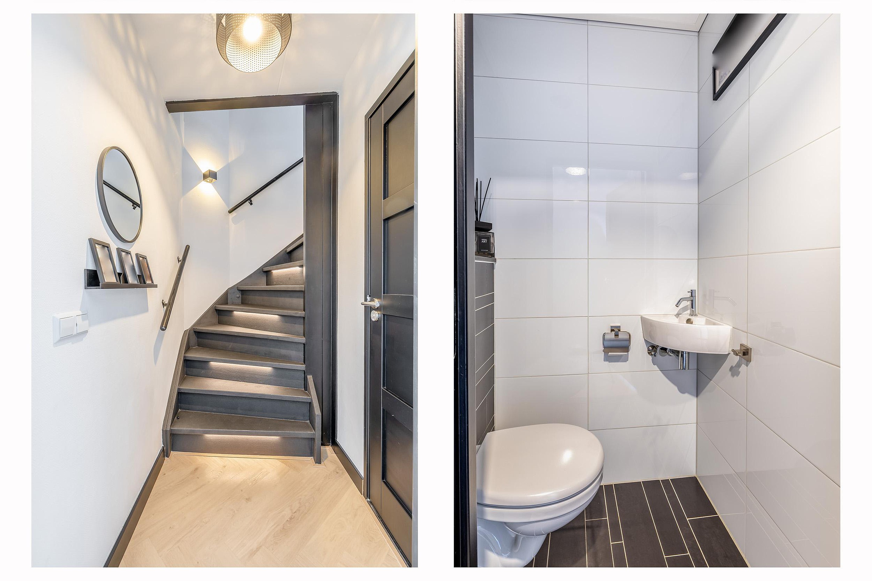 De woonkamer loopt vloeiend over in de eetkamer aan de achterzijde, waar alle plek is voor een grote eettafel. Centraal in de woning bevindt zich een tweede hal die toegang geeft tot het moderne toilet met hangcloset en de trap naar boven. Deze trap is niet alleen voorzien van een duurzame, beschermende coating, maar beschikt ook over verlichte traptreden. Dit ziet er niet alleen super strak uit, maar is ’s avonds ook nog eens erg praktisch.