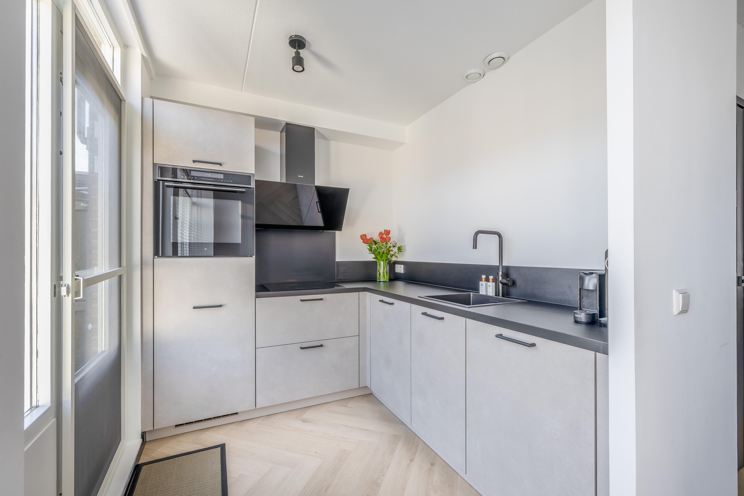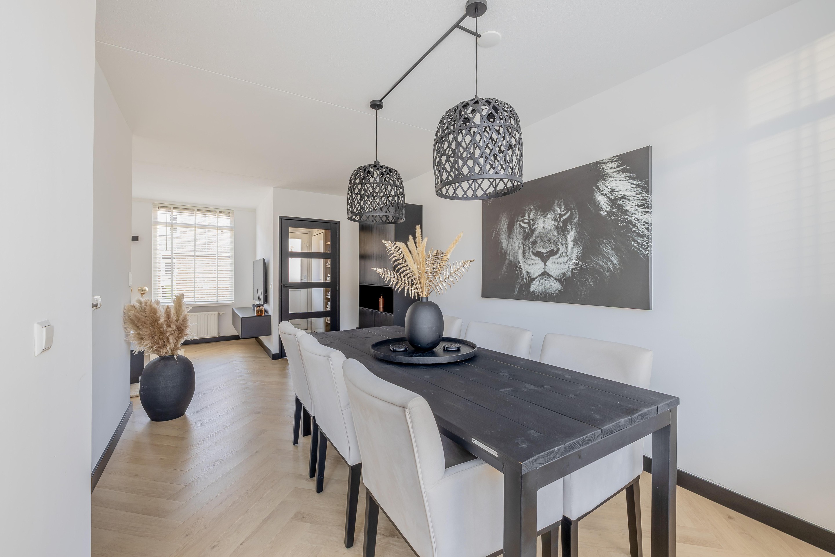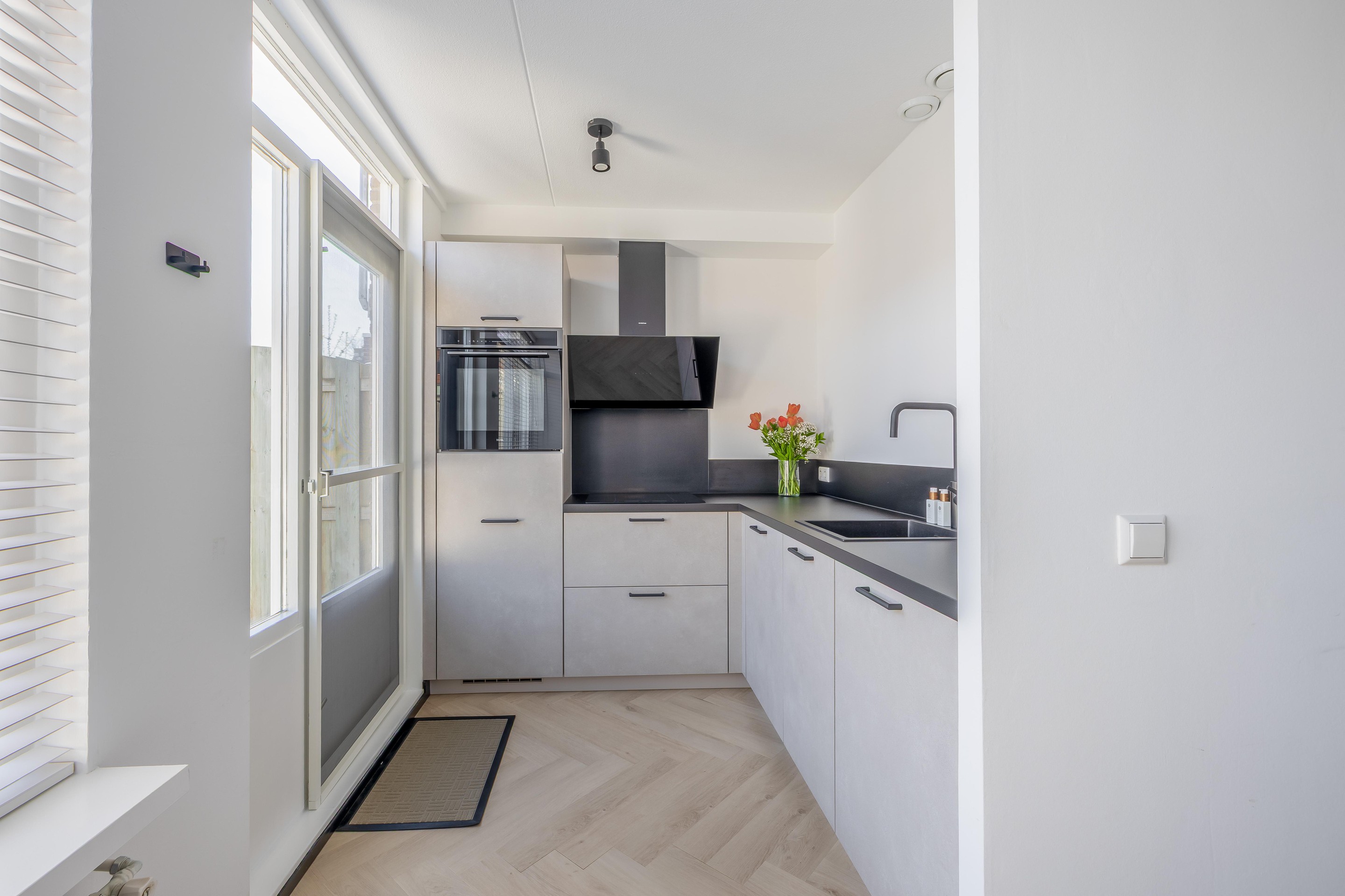 Bij deze woning is over de routing echt nagedacht. Je komt binnen in de entree, waar je alle ruimte hebt voor de jassen en de meterkast vindt. Deze meterkast is modern uitgevoerd en volledig voorbereid op de toekomst met extra groepen voor de 10 zonnepanelen en de inductiekookplaat. Via de entree stap je de lichte woonkamer binnen, waar de prachtige PVC-kliklaminaatvloer in visgraatmotief direct opvalt. Samen met de strakke wanden zorgt dit voor een moderne en luxe uitstraling.