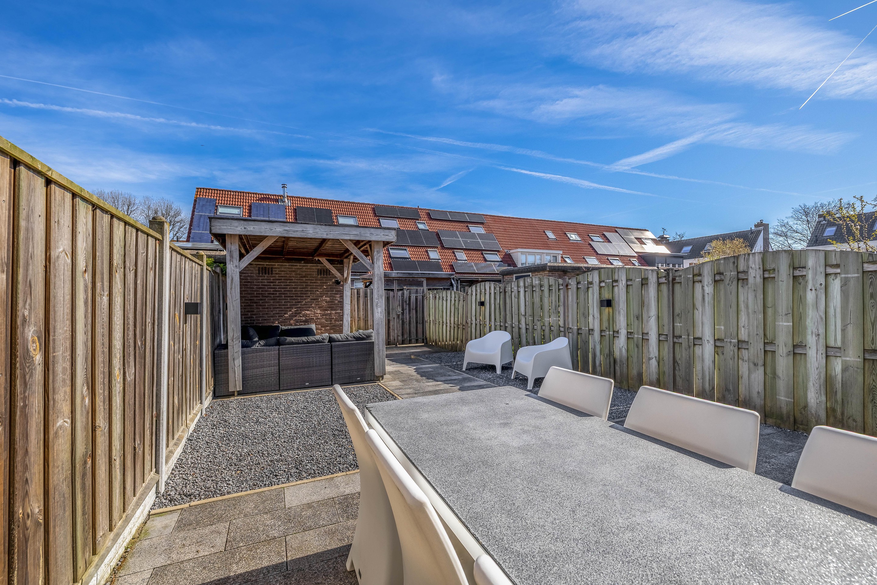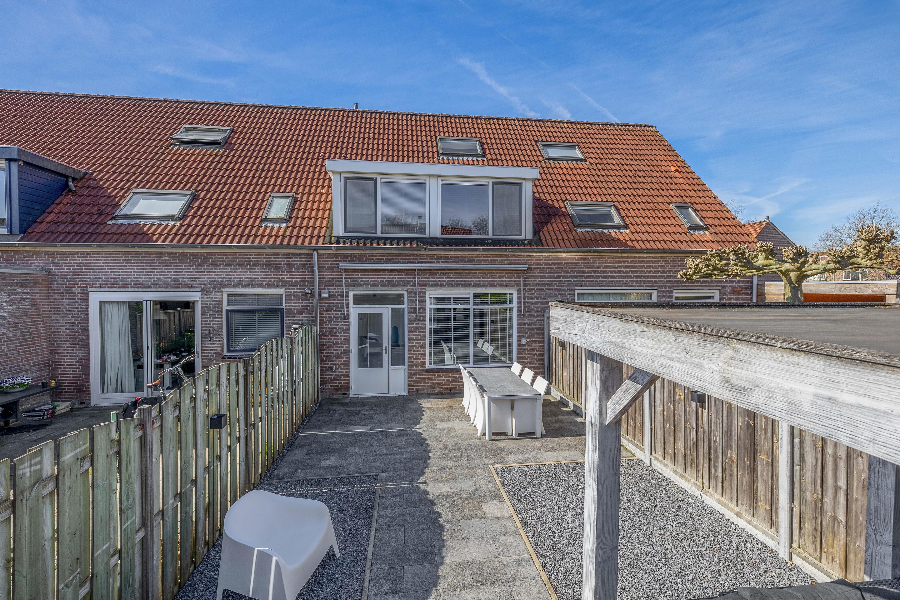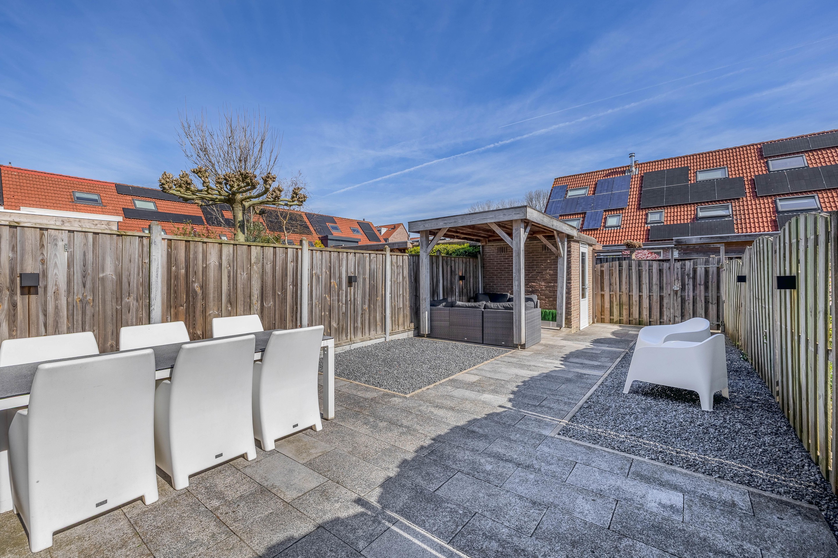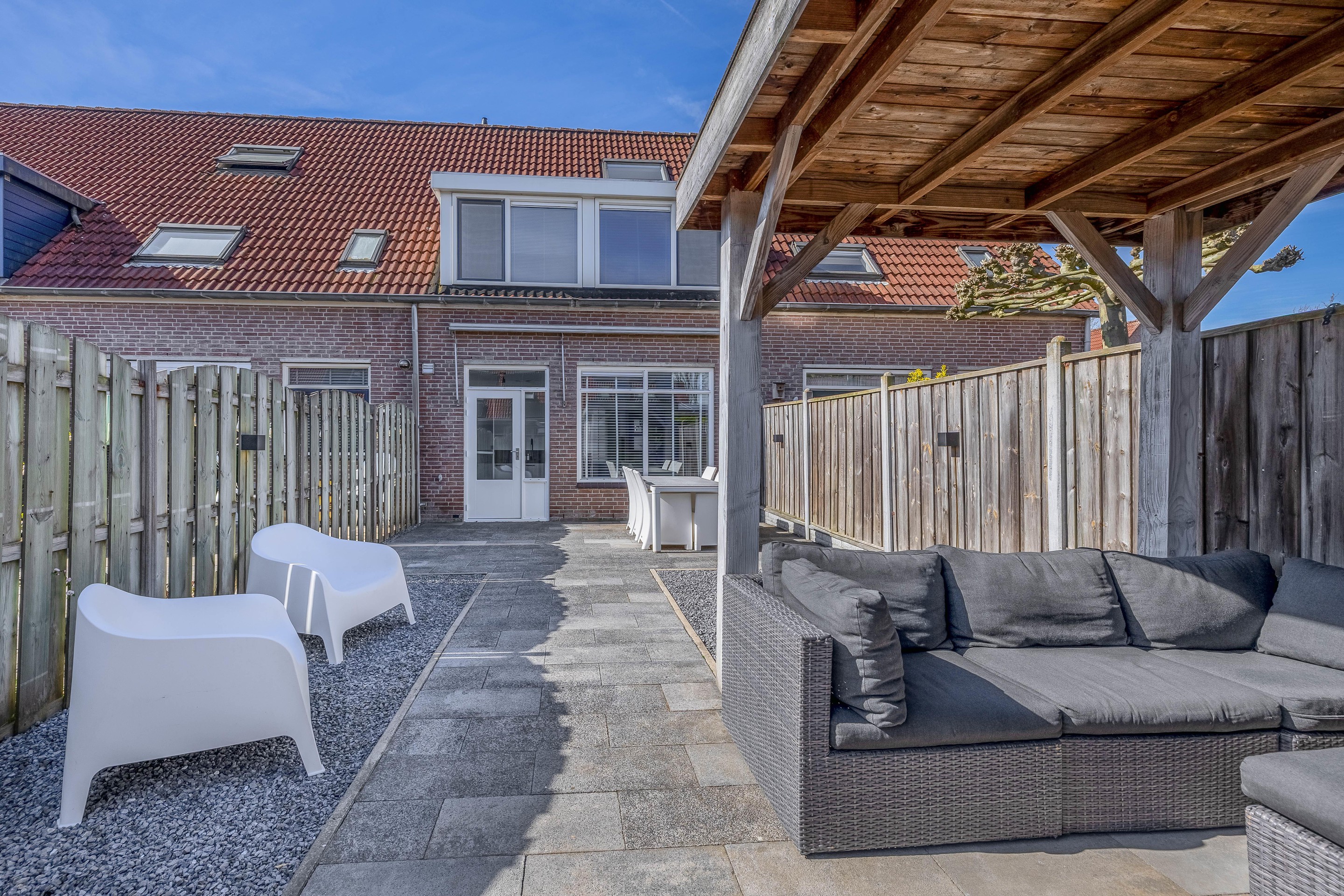 Vanuit de keuken heb je direct toegang tot de achtertuin, die gunstig is gelegen op het noordoosten. De tuin is onderhoudsvrij ingericht, waardoor je alle ruimte hebt voor een riant terras zonder dat je elk weekend hoeft te tuinieren. Er is een stenen berging met elektra aanwezig en een handige achterom. En als het net even geen mooi weer is, of juist een dag te warm, dan biedt de veranda aan de schuur een heerlijke plek om even helemaal tot rust te komen.