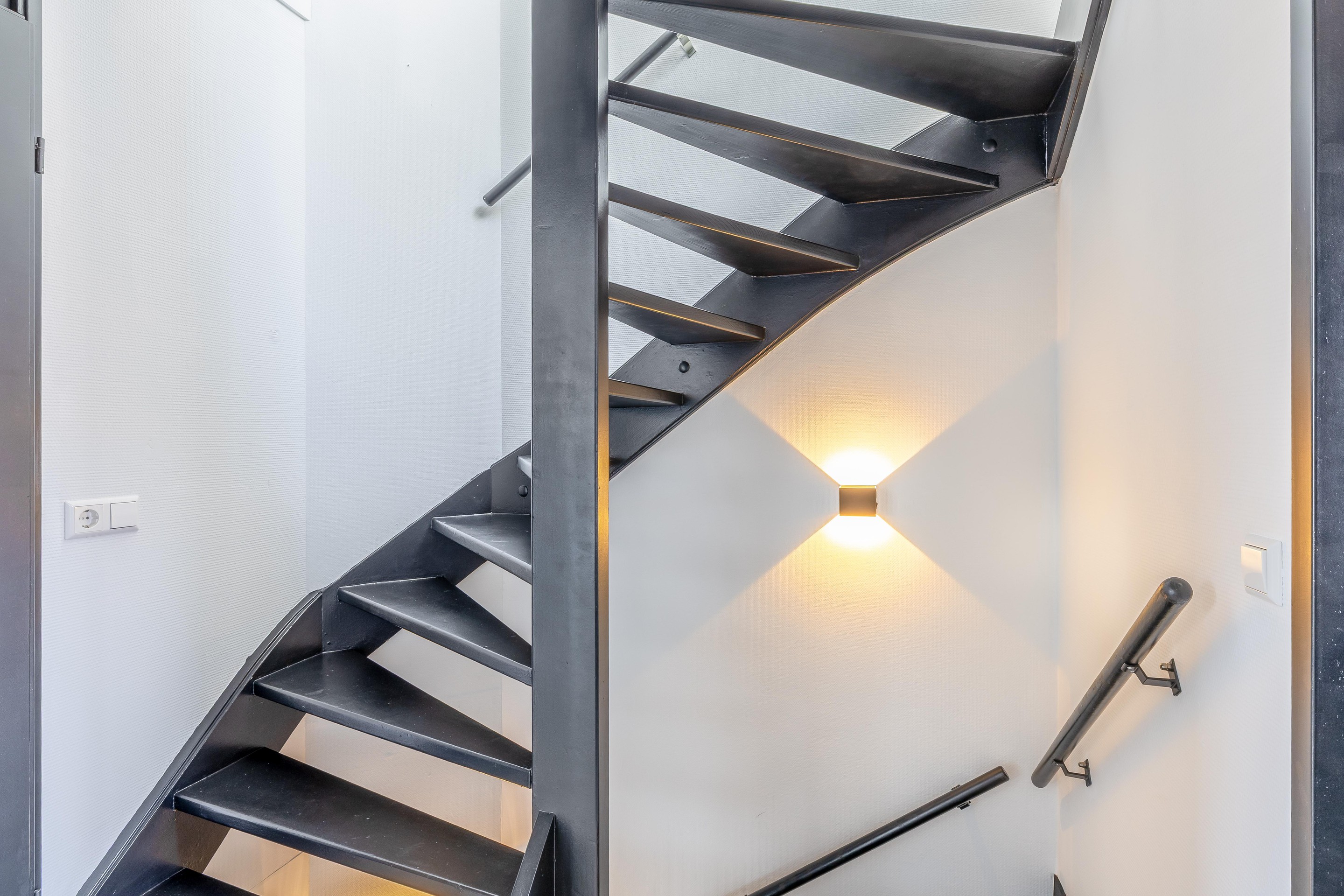 Via de verlichte trap bereik je de overloop van de eerste verdieping, die toegang biedt tot drie slaapkamers en de badkamer. Wat hier direct opvalt is de consequent doorgevoerde moderne stijl: alle kamers zijn keurig afgewerkt en hebben een krachtige uitstraling door de zwarte details in de plinten, kozijnen en deuren.