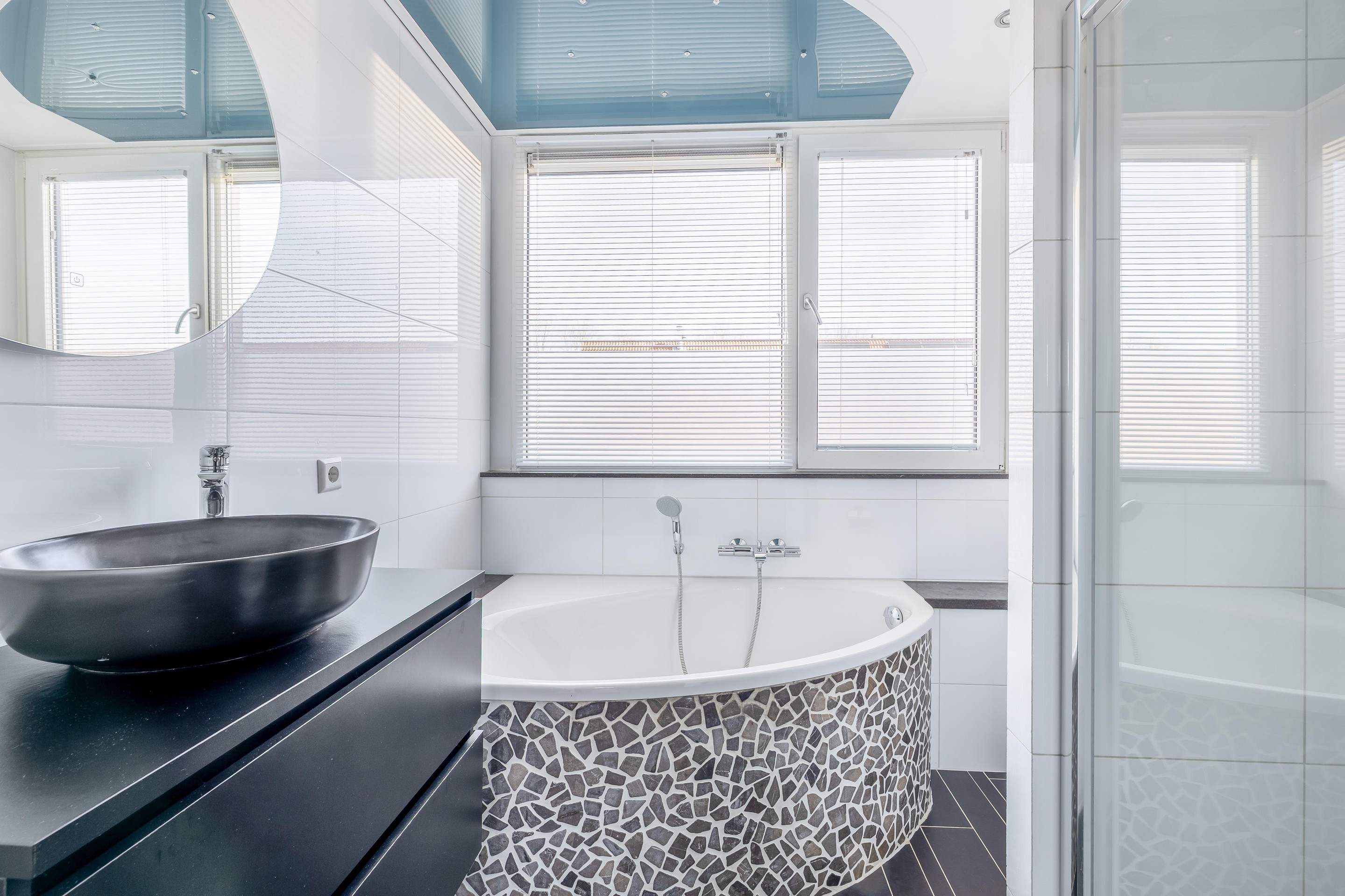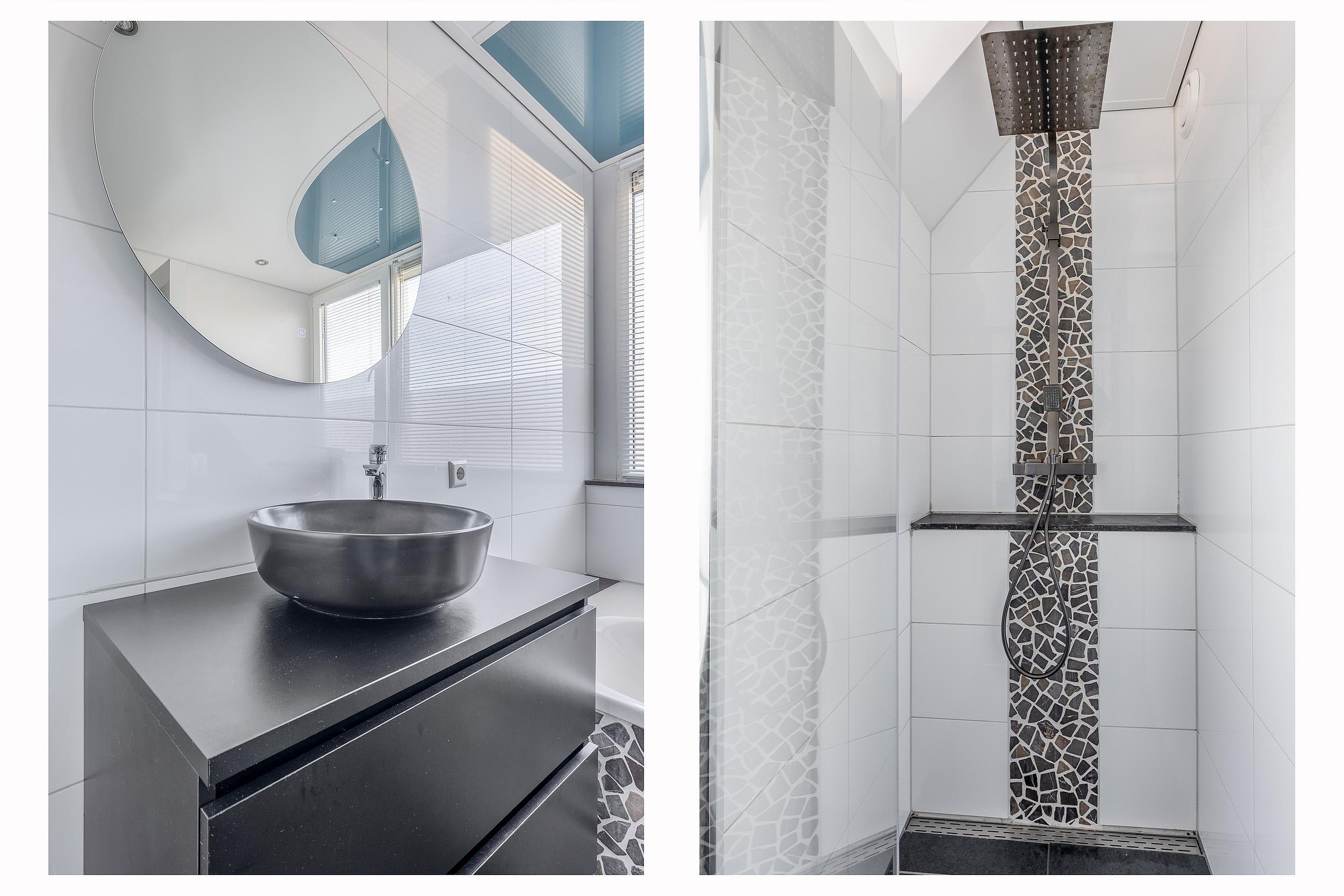 De badkamer is een plek waar je echt tot rust kunt komen. Deze is volledig betegeld en van alle gemakken voorzien, zoals een comfortabel ligbad, een inloopdouche, een wastafelmeubel en een tweede toilet. Mechanische ventilatie zorgt hier voor een fris klimaat.