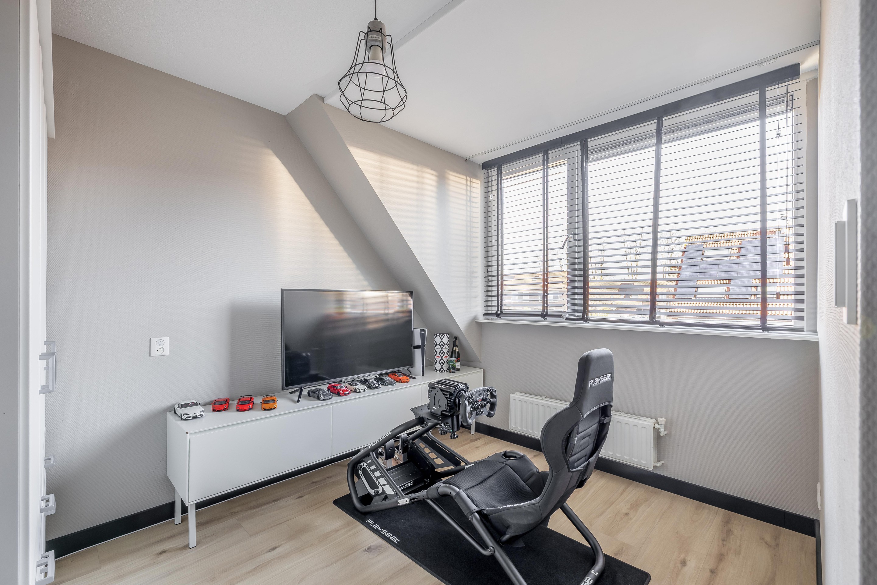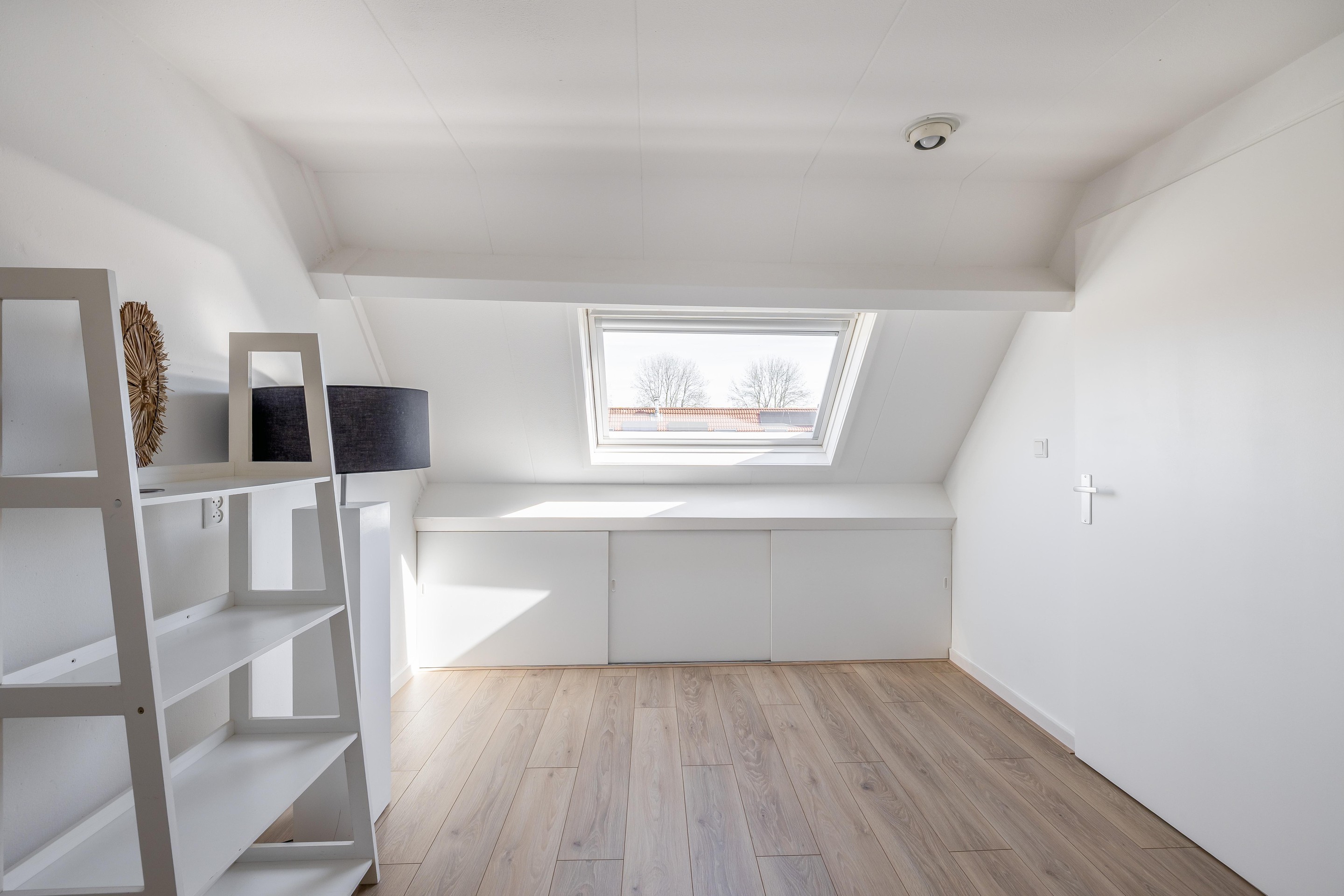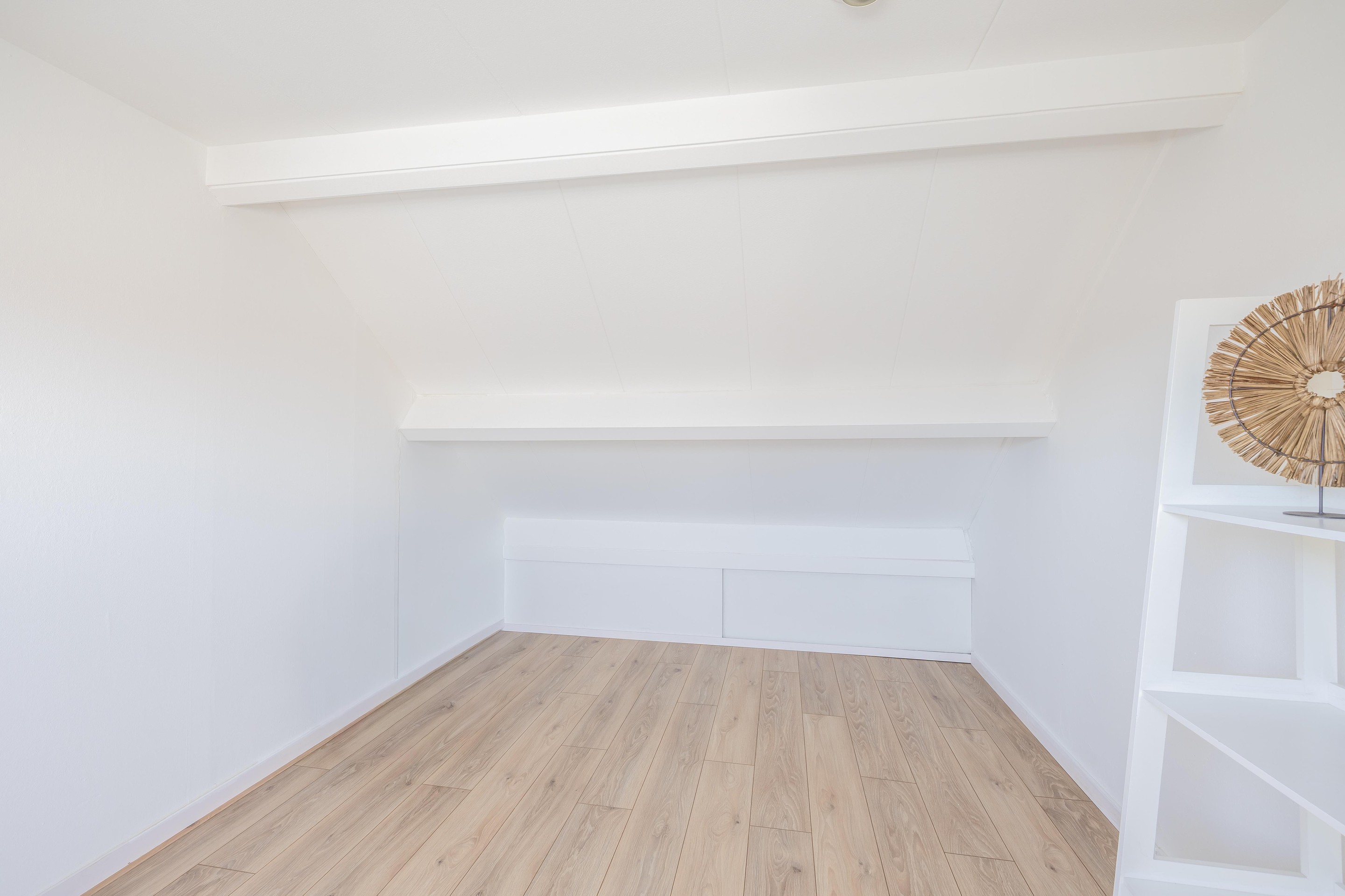 De vierde slaapkamer De kers op de taart is de ruime vierde slaapkamer. Deze kamer baadt in het natuurlijke daglicht dankzij het grote Velux dakvenster. Ook hier is de afwerking weer om door een ringetje te halen; de fraaie laminaatvloer is zelfs pas een paar weken oud! Net als op de voorzolder vind je ook in deze kamer veel bergruimte achter de knieschotten. Een ideale kamer voor een tiener, een rustige thuiswerkplek of een fijne logeerkamer.