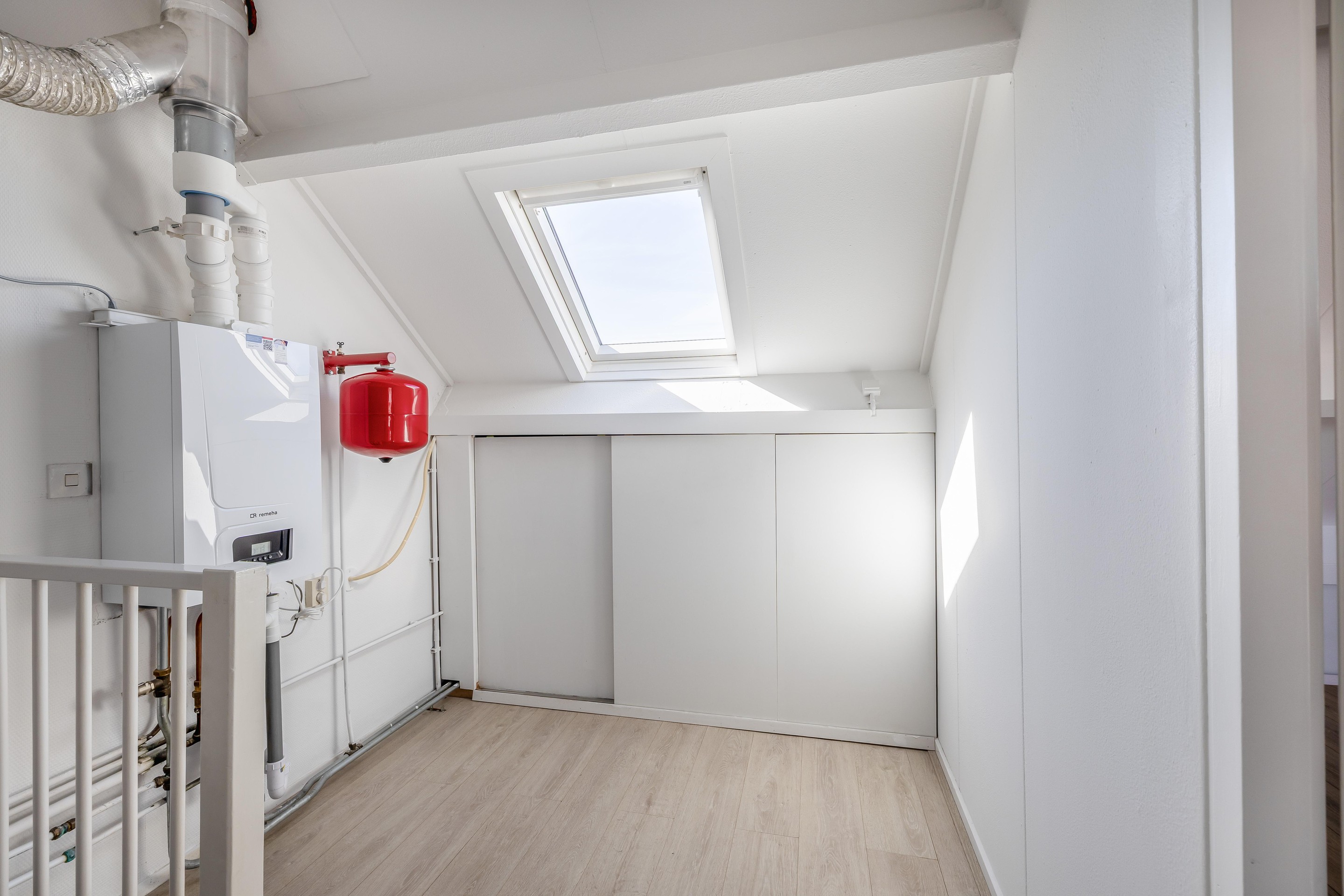 De vaste trap brengt je naar de tweede verdieping. Hier tref je een praktische voorzolder met de opstelplaats voor de cv-ketel en de aansluitingen voor de wasmachine. Dankzij de knieschotten is er aan beide kanten slim gebruikgemaakt van de ruimte, waardoor je hier ontzettend veel extra bergruimte hebt voor spullen die je niet dagelijks nodig hebt.