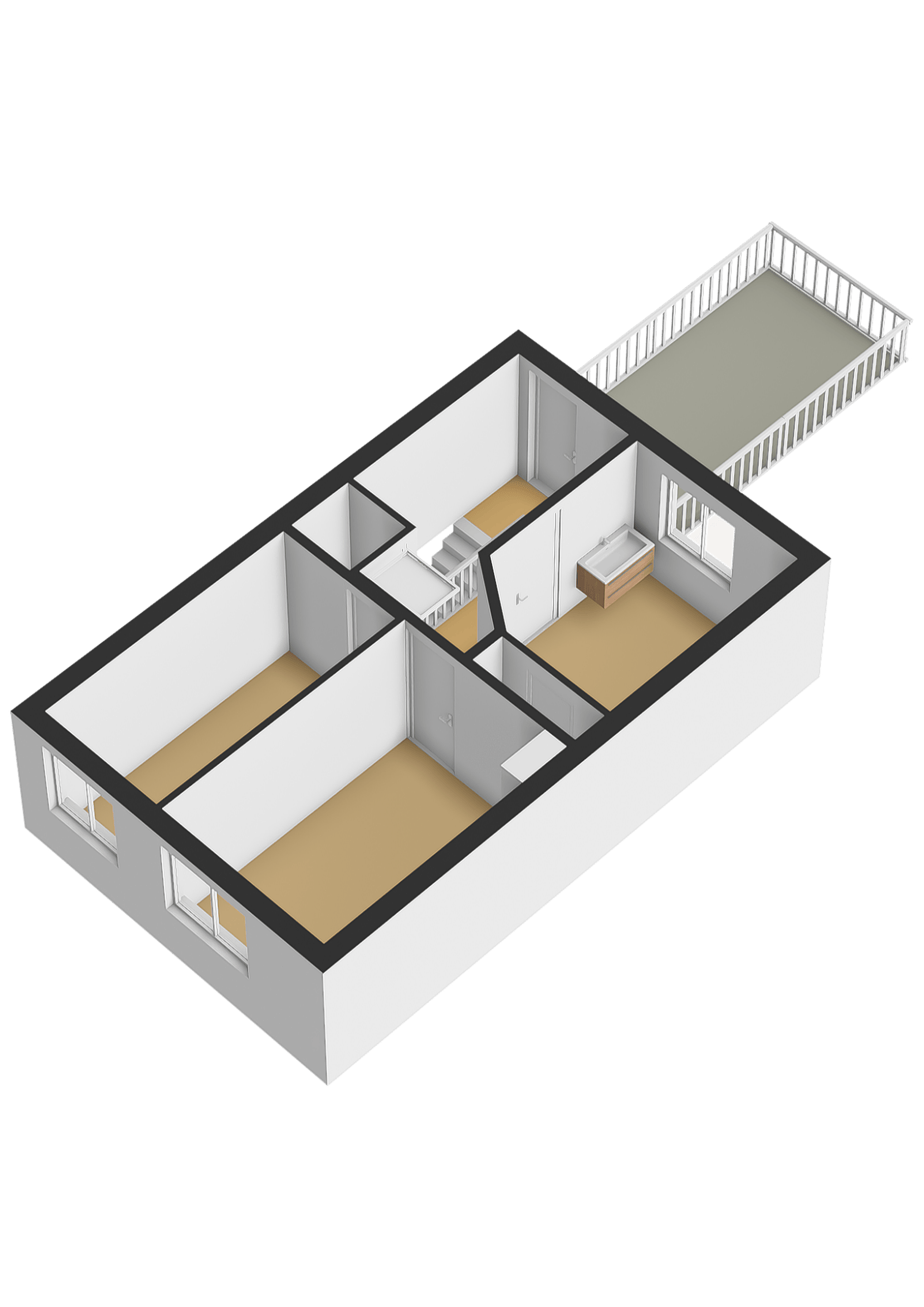 Eerste verdieping: De overloop geeft toegang tot drie slaapkamers, waarvan twee aan de voorzijde van de woning. Op deze verdieping bevindt zich een extra toilet en een deur naar een dakterras. Via een beweegbare trap bereikt u de zolderverdieping.