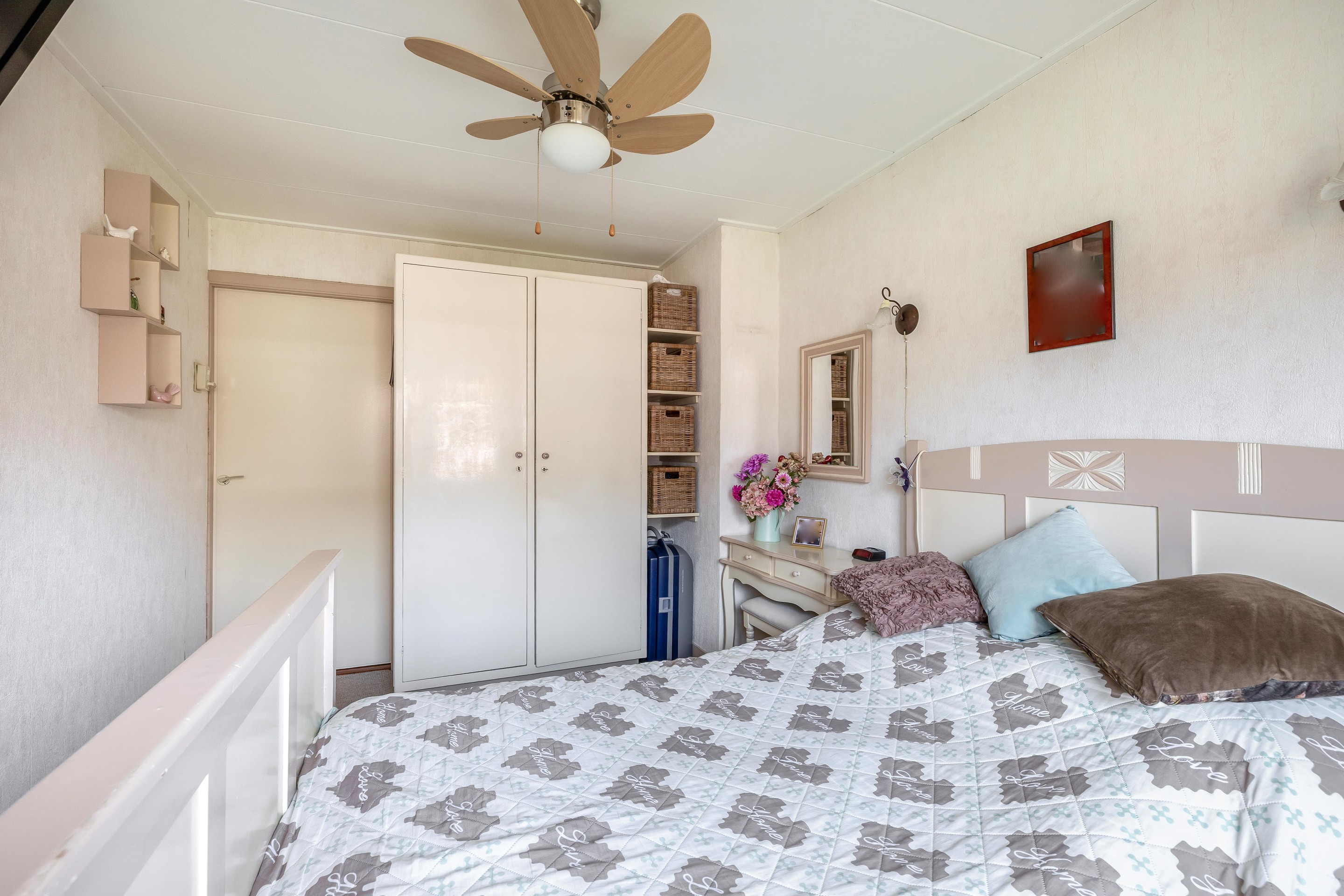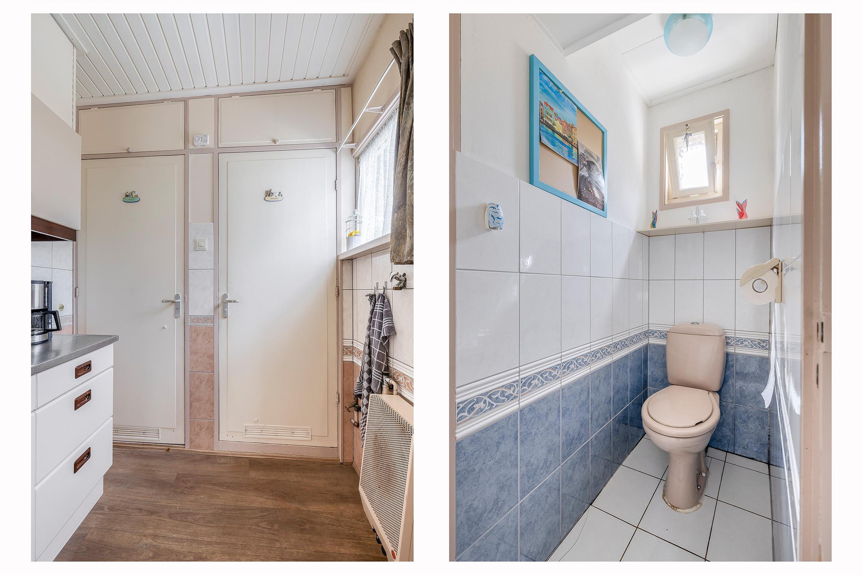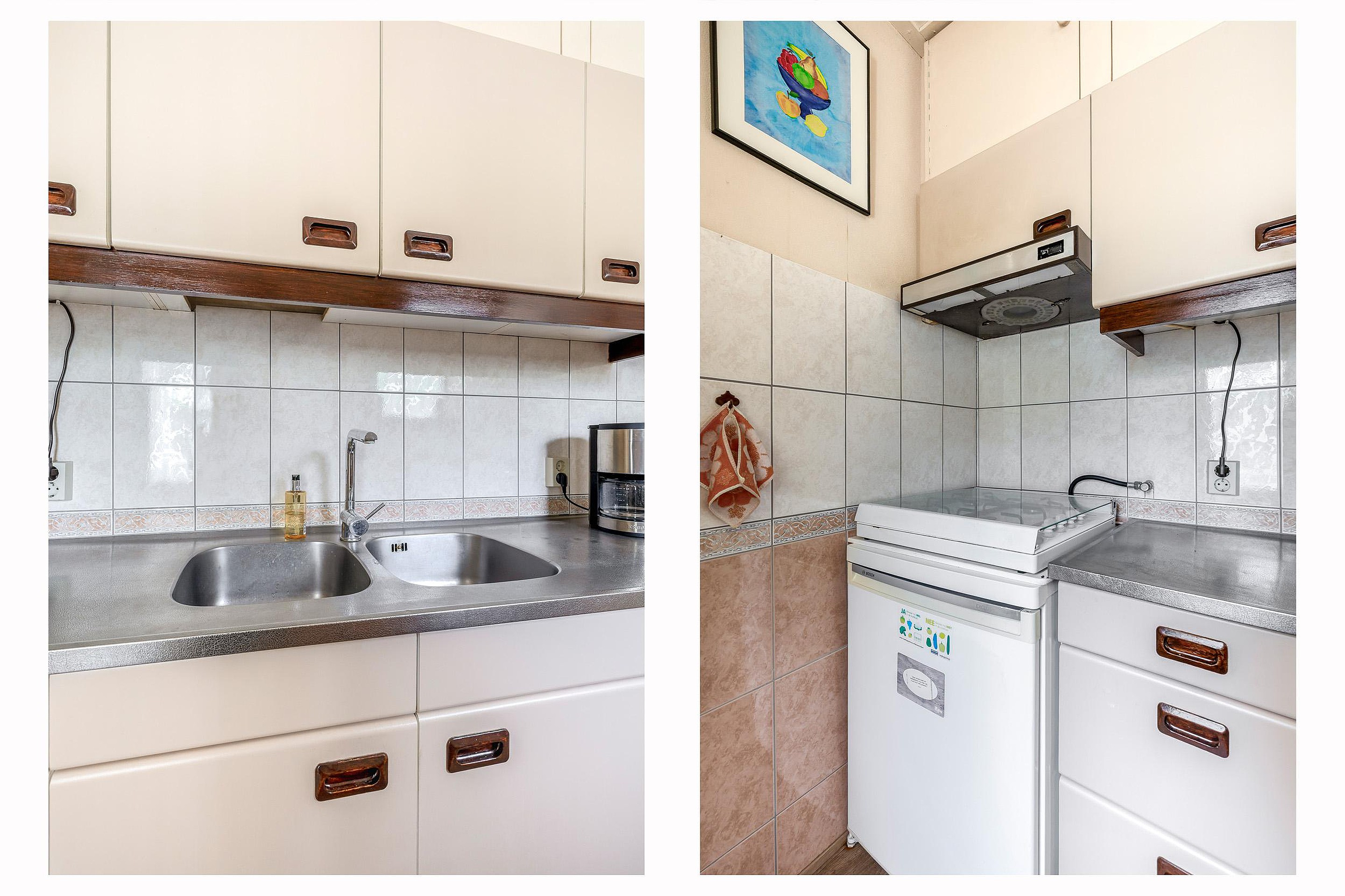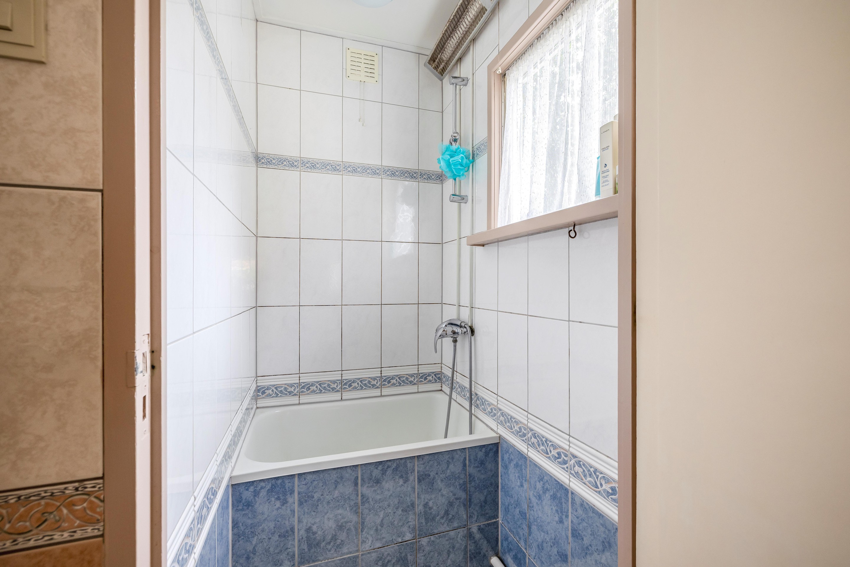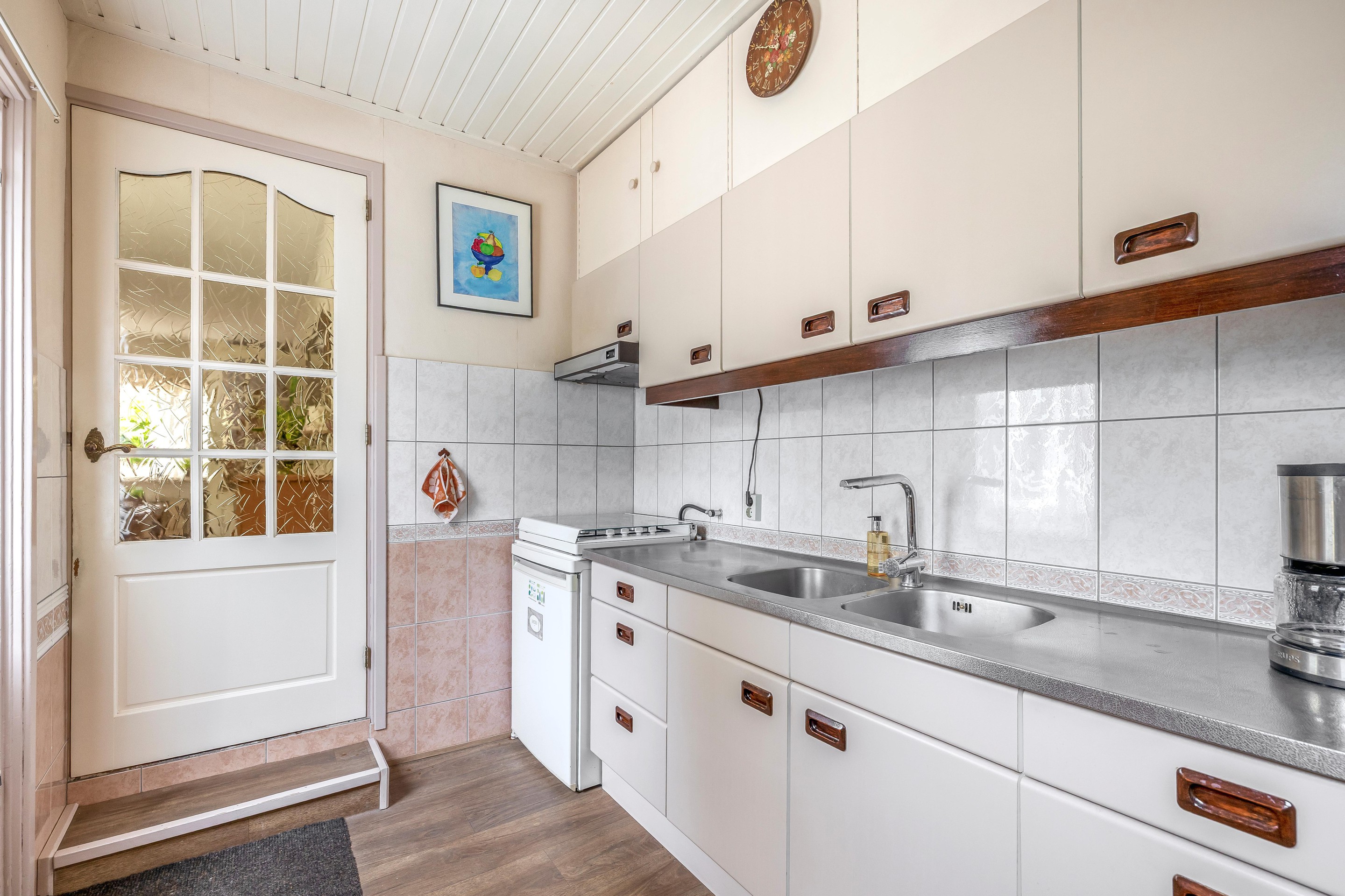 Aan de achterzijde van de woonkamer bevindt zich de keuken met een rechte opstelling. In de keuken is de toegangsdeur naar de achtertuin, en vind je tevens de badkamer met douche en een apart toilet. De begane grond biedt zo een functionele indeling met volop potentieel om er, na modernisering, een moderne en lichte leefruimte van te maken.