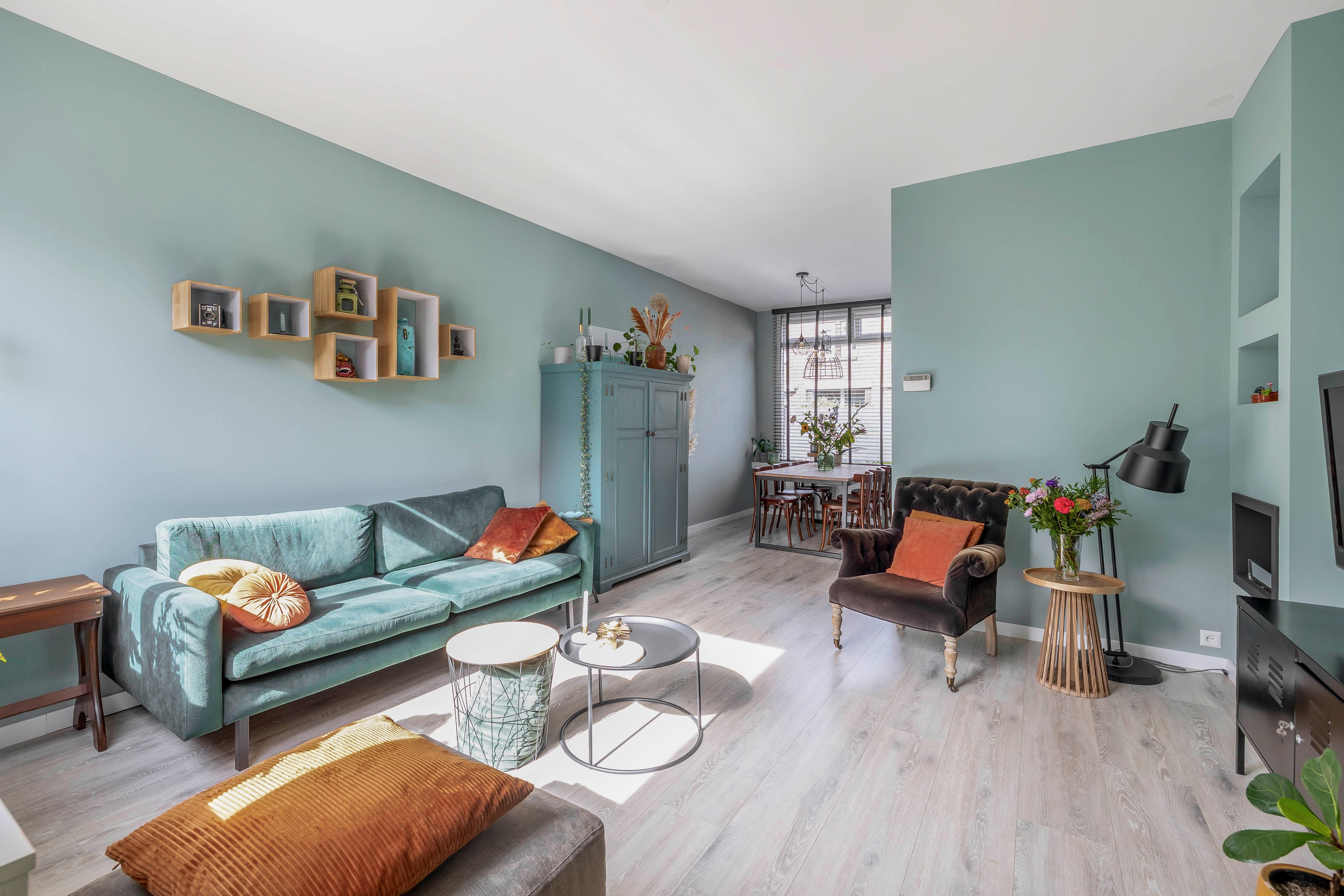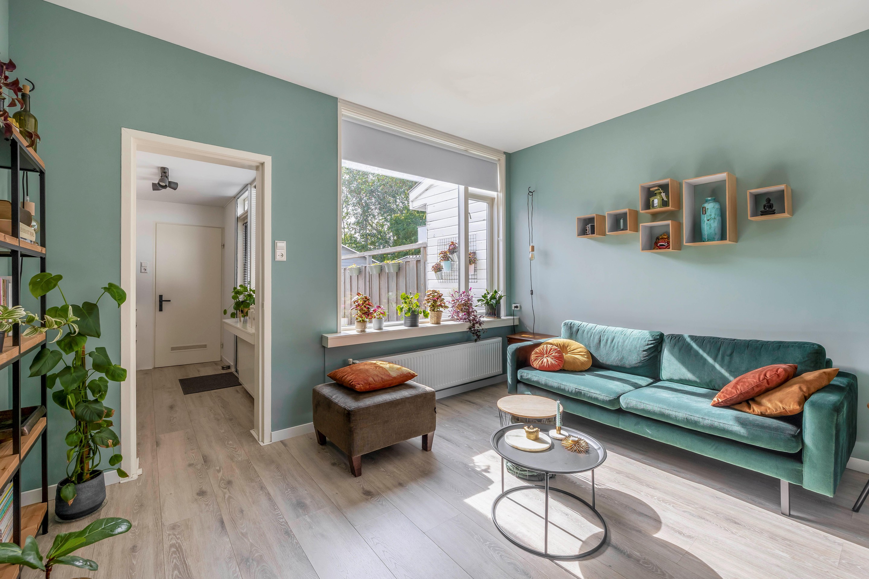 Binnenkomst in de hal met garderobe, meterkast (7 groepen, moderne installatie met dubbele aardlek) en de trap naar boven. De lichte doorzonwoonkamer (ca. 25,5 m2) voelt heerlijk ruim aan; de zithoek kijkt uit op de tuin en aan de voorzijde heb je alle plek voor een gezellige eettafel.