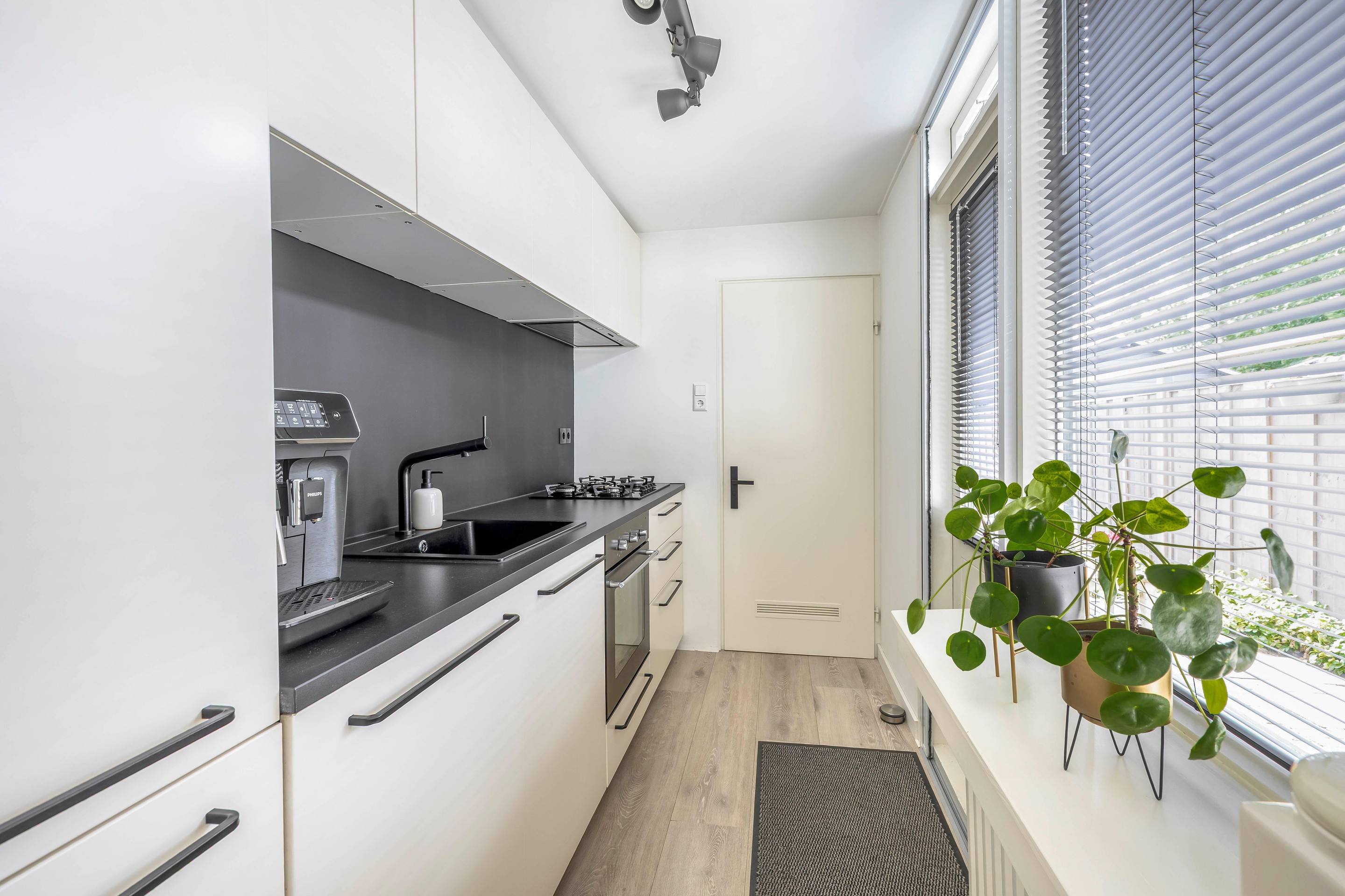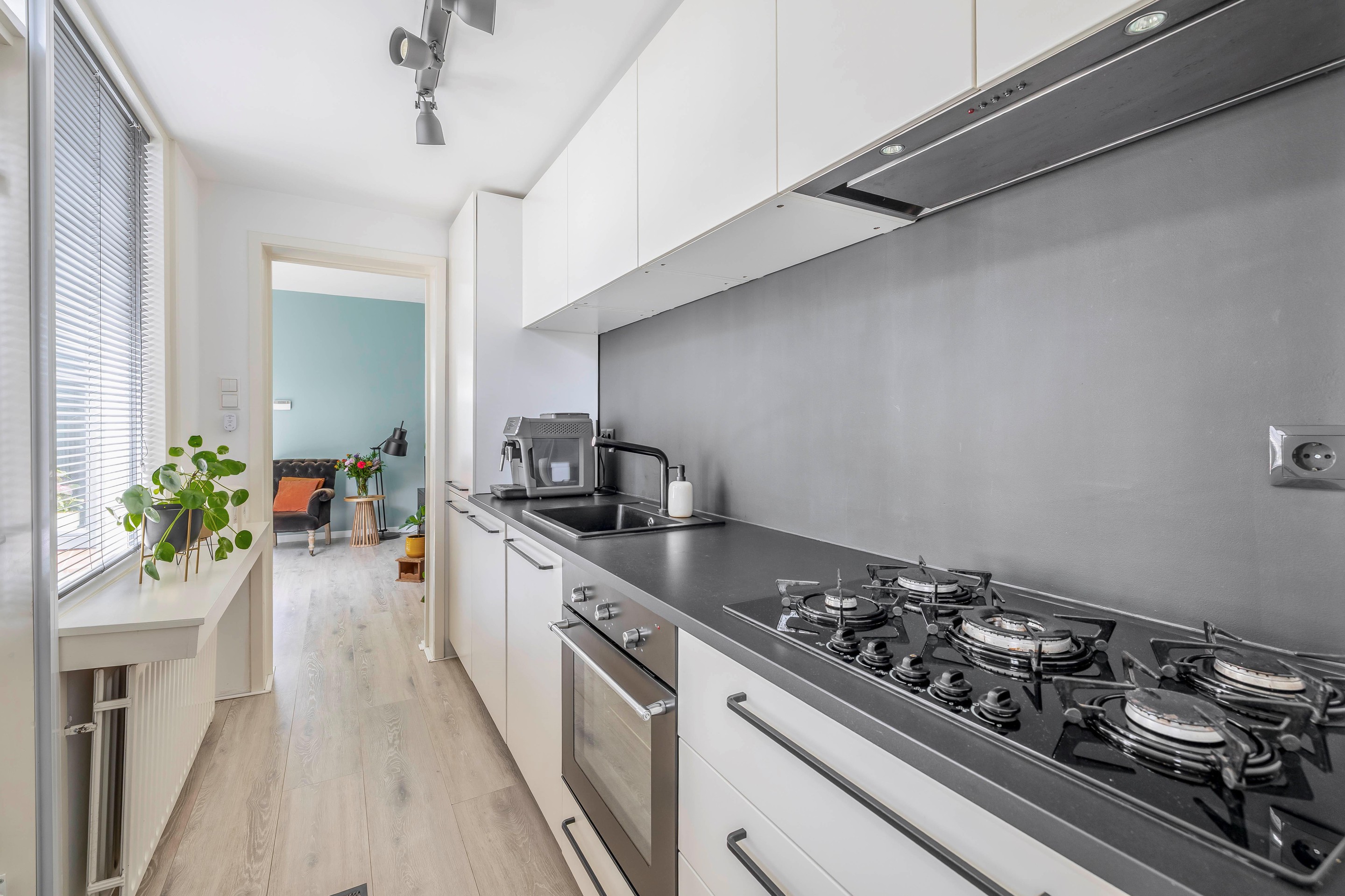 Aan de achterzijde vind je de uitgebouwde keuken en het toilet. Alles is strak afgewerkt met glad gestuukte wanden en een mooie laminaatvloer. In de uitbouw is slim gebruikgemaakt van de ruimte met vaste kasten voor extra bergruimte. Hier hangt ook de goed onderhouden Vaillant HR Solide cv-ketel (2011) en vind je de aansluitingen voor je wasmachine en droger.