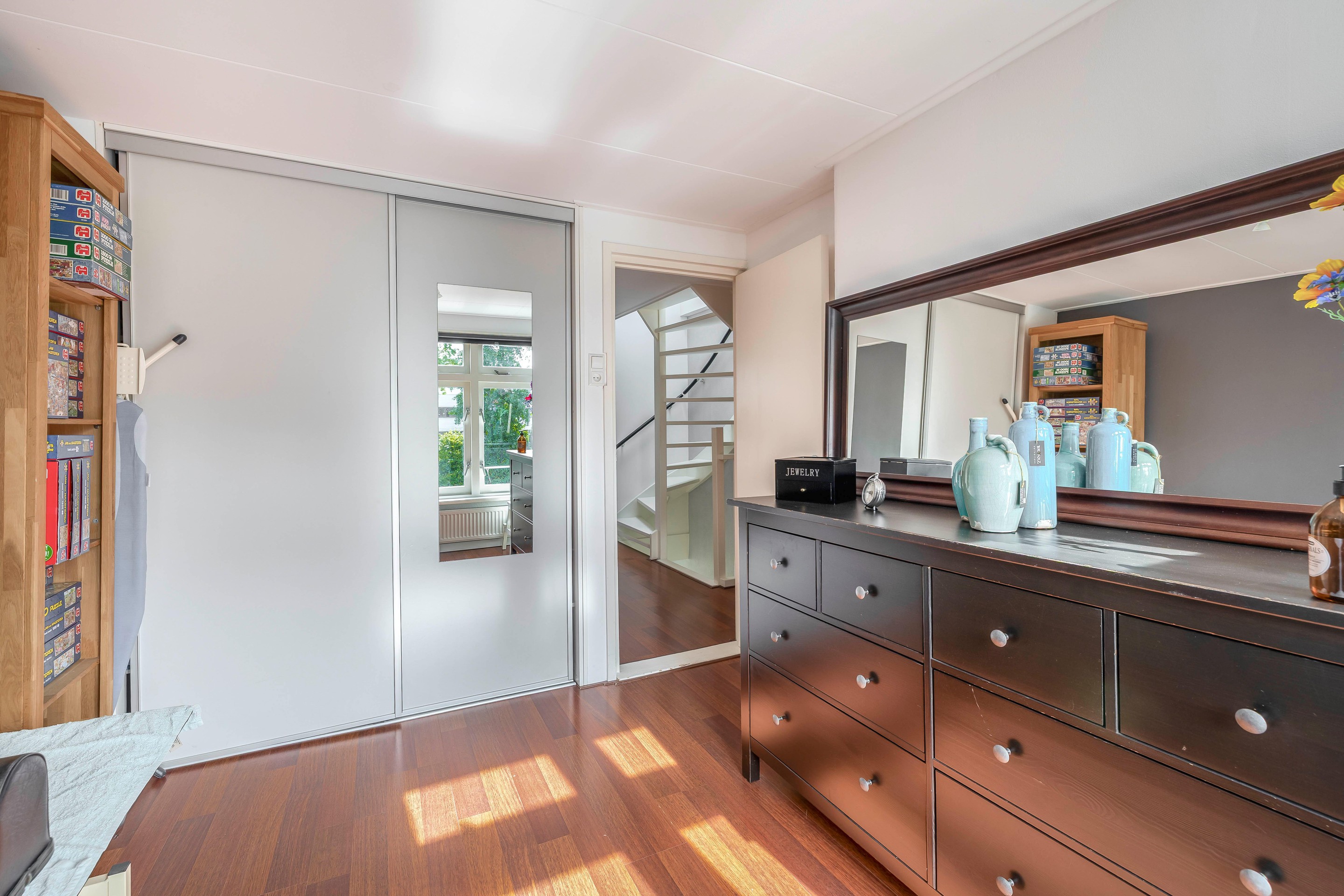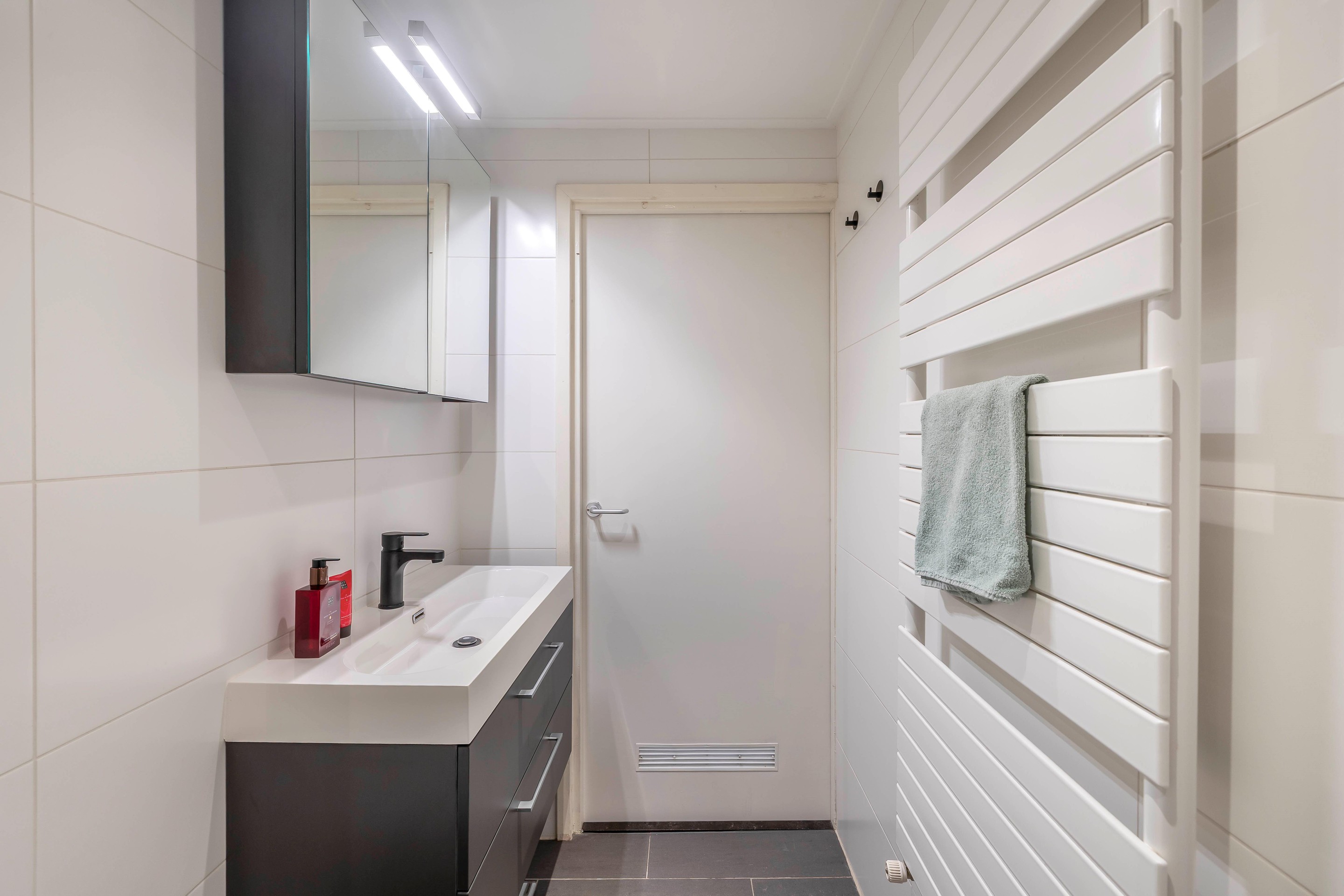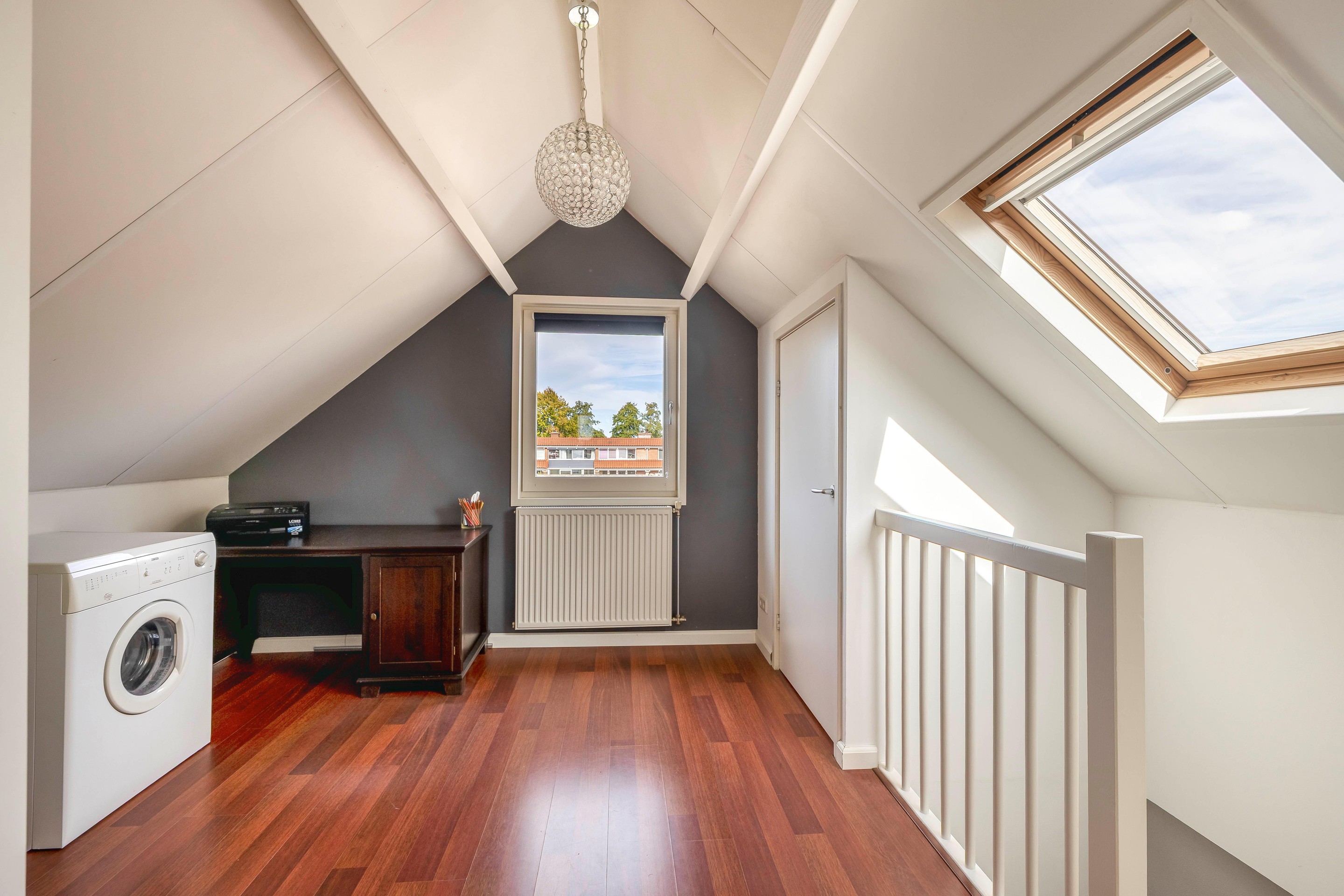 Via de overloop heb je toegang tot twee fijne slaapkamers en de trap naar de zolder. Tussen de kamers in is een grote kastenwand gebouwd, dus aan bergruimte heb je hier geen gebrek. De badkamer is "strak en modern" ingericht met een inloopdouche, een breed wastafelmeubel en een tweede toilet.