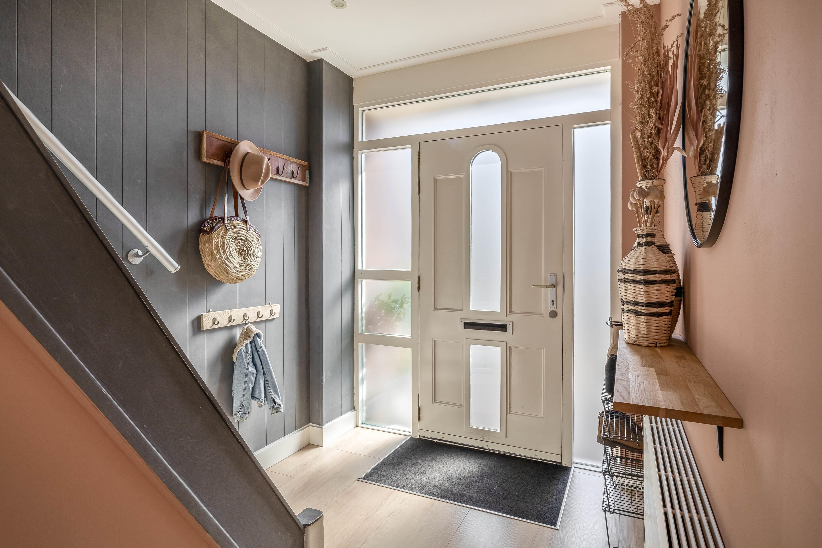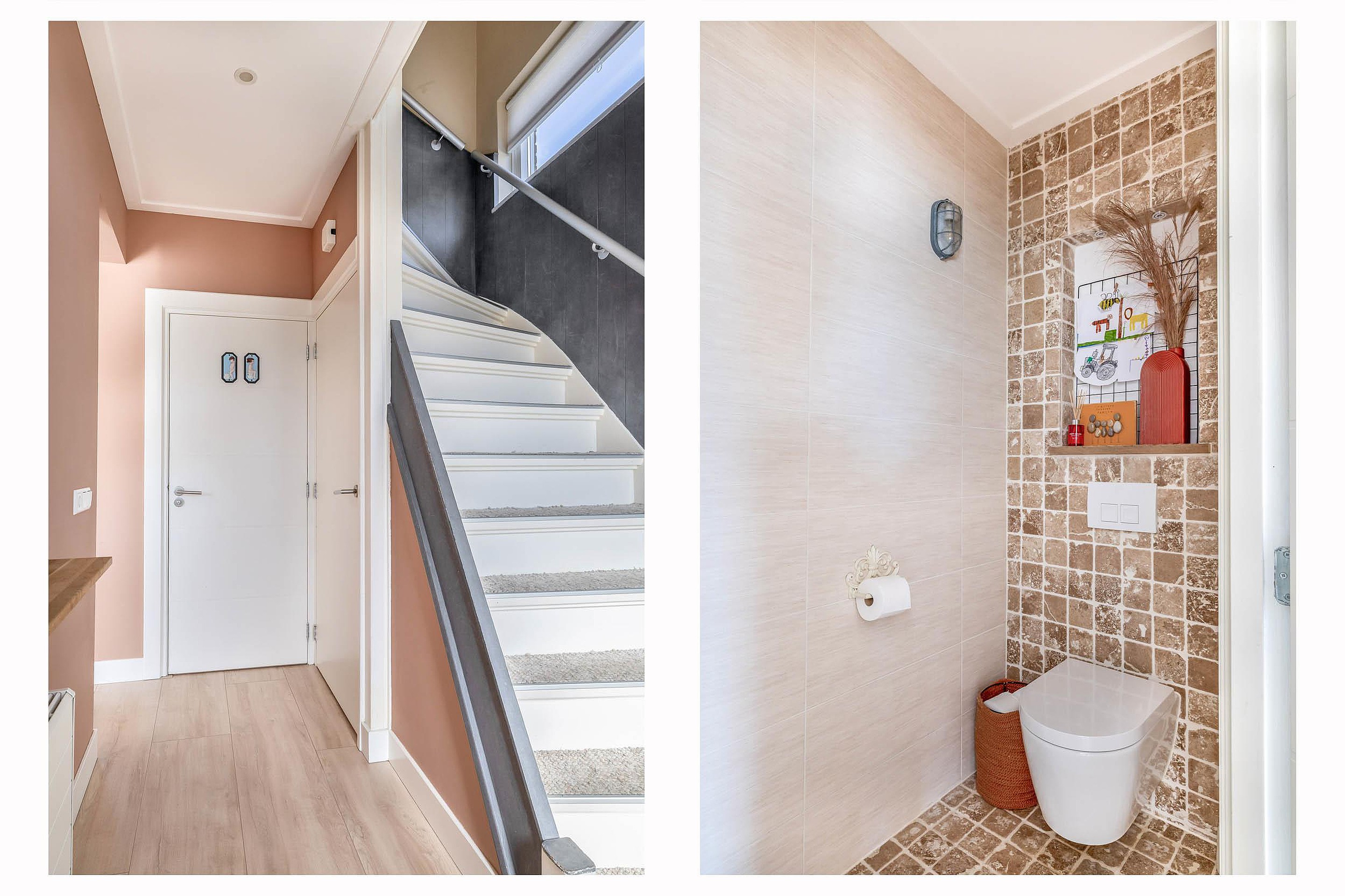 Entree/hal met de vernieuwde trapopgang naar de verdieping, trap-/meterkast (volledig vernieuwd) en toiletruimte. De hal is netjes afgewerkt en voorzien van een laminaatvloer. De trap is gestoffeerd en de wanden zijn voorzien van wandpanelen. Het moderne toilet is tijdens de verbouwing vergroot en voorzien van een hangend closet.