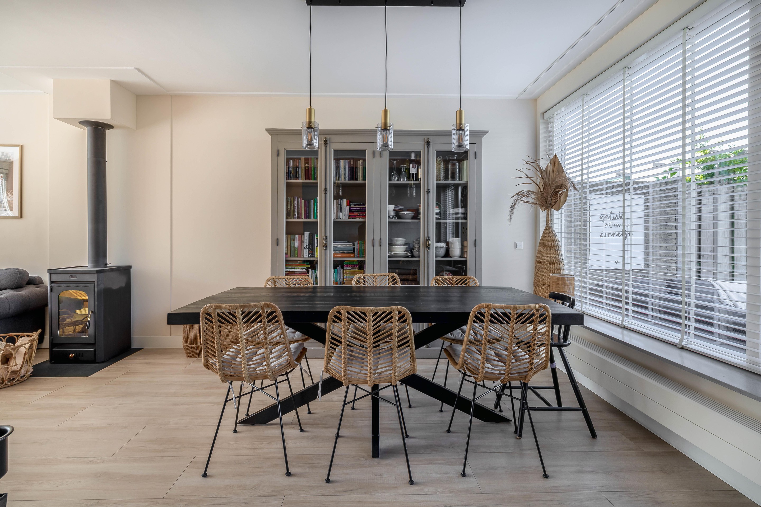 De doorzonwoonkamer is licht en ruim, afgewerkt met glad gestuukte wanden en plafonds, en van de hal gescheiden door een zwarte houten schuifdeur. De gezellige houtkachel zorgt voor warmte en sfeer, maar ook voor een lage gasrekening. Dankzij de doorzonindeling is er volop daglicht. De laminaatvloer loopt vanuit de hal door naar de woonkamer en keuken.