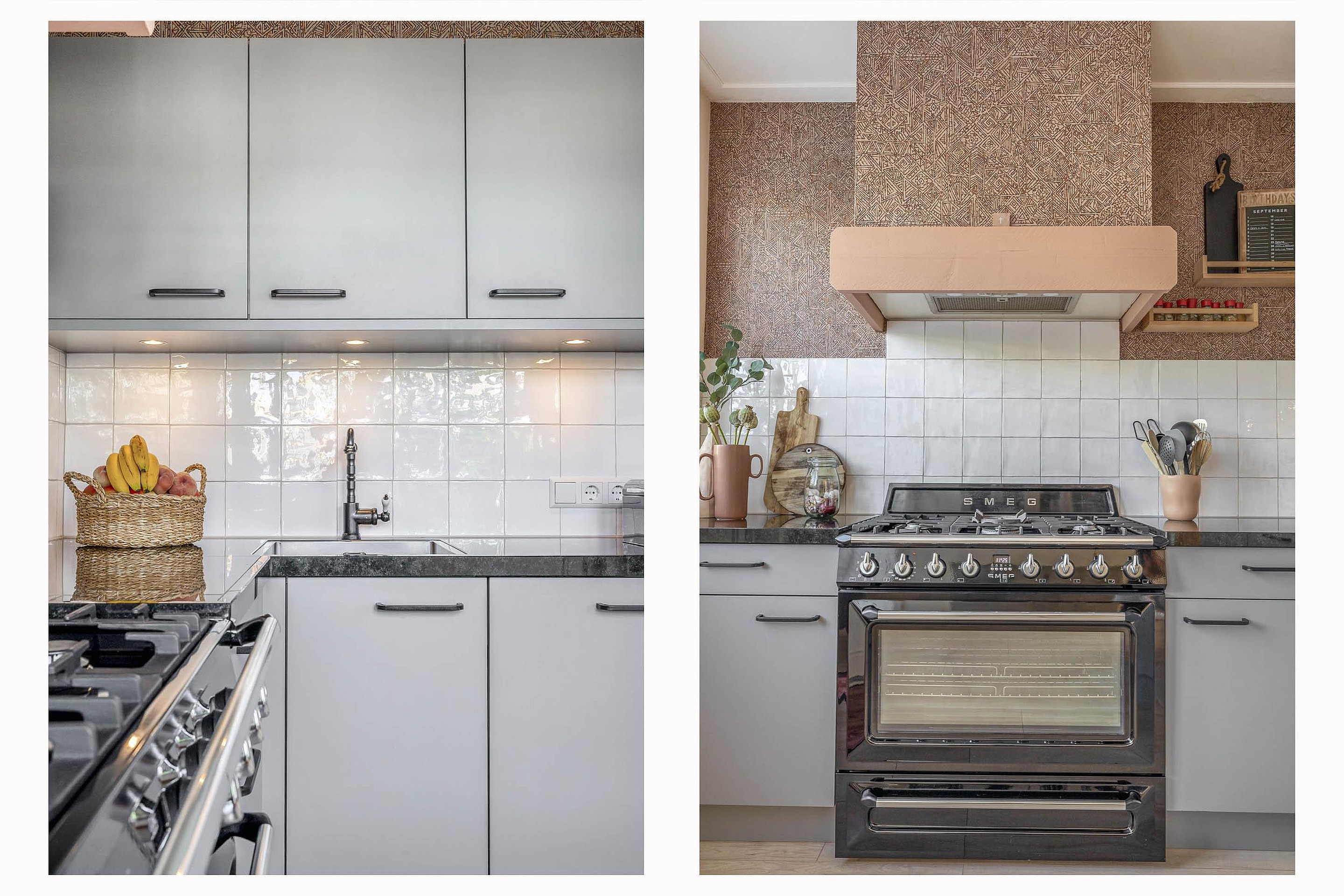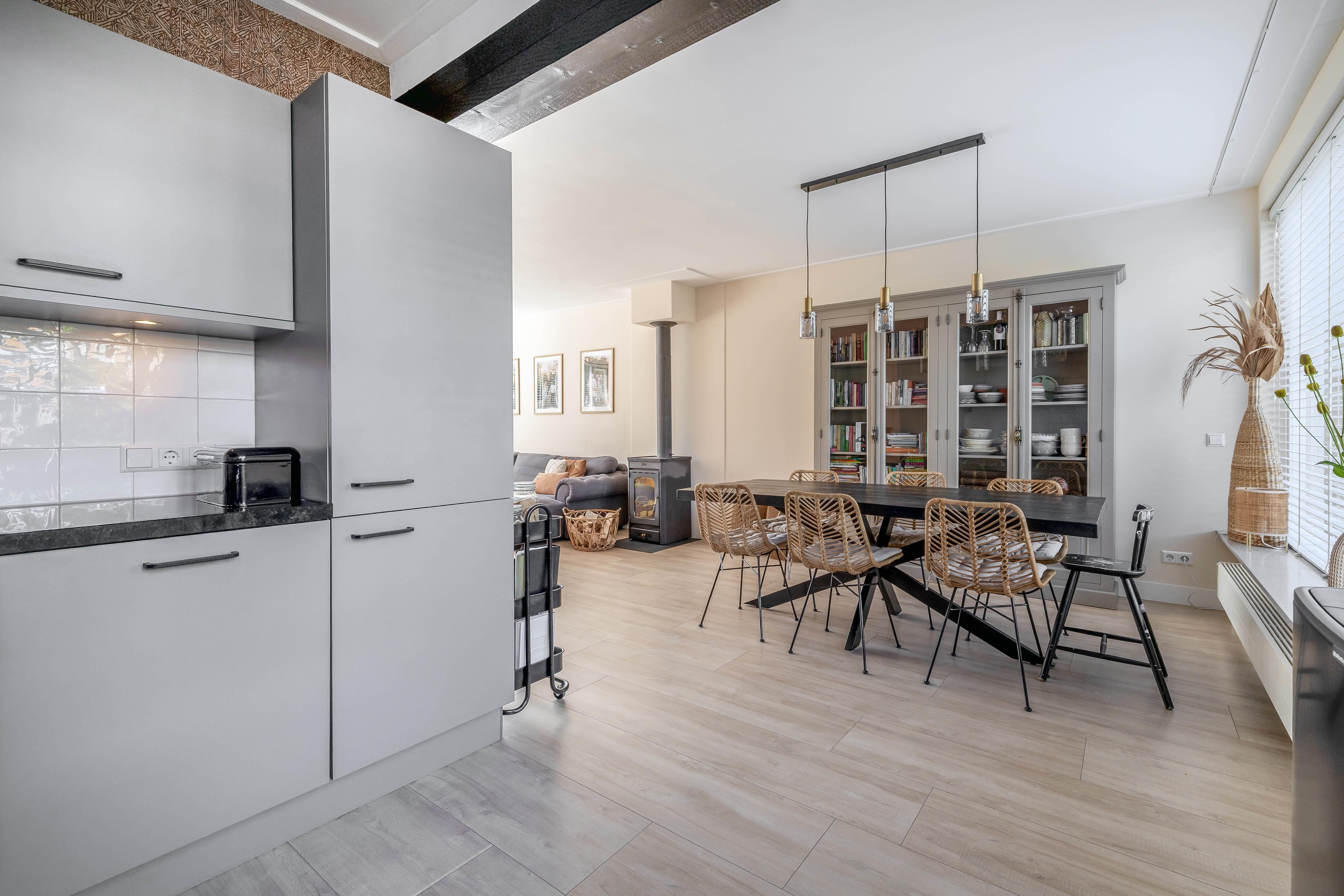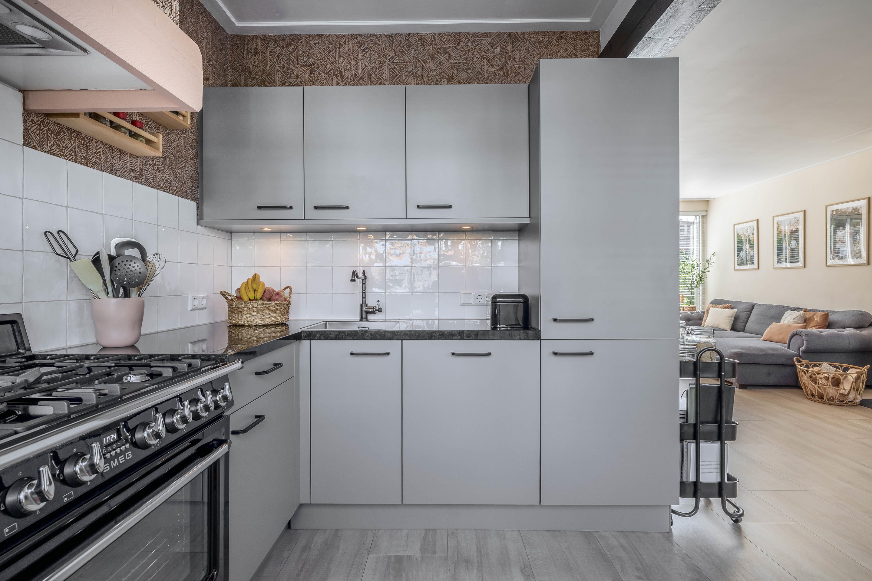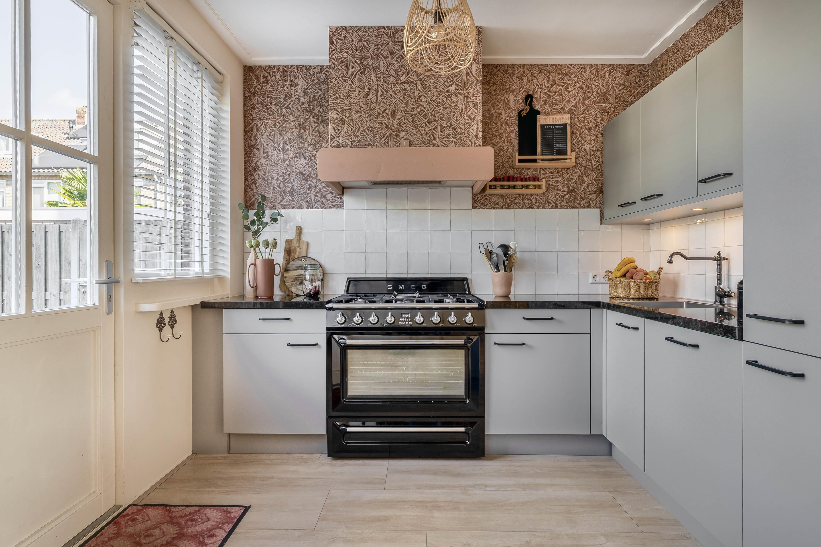 De keuken in L-opstelling is uitgevoerd met lichtgrijze kastfronten en een donker stenen werkblad. Deze beschikt over een fraai zwart fornuis, afzuigschouw, vaatwasser, koelkast en bijpassende kranen en grepen. Vanuit de keuken is er toegang tot de zonnige tuin op het westen.
