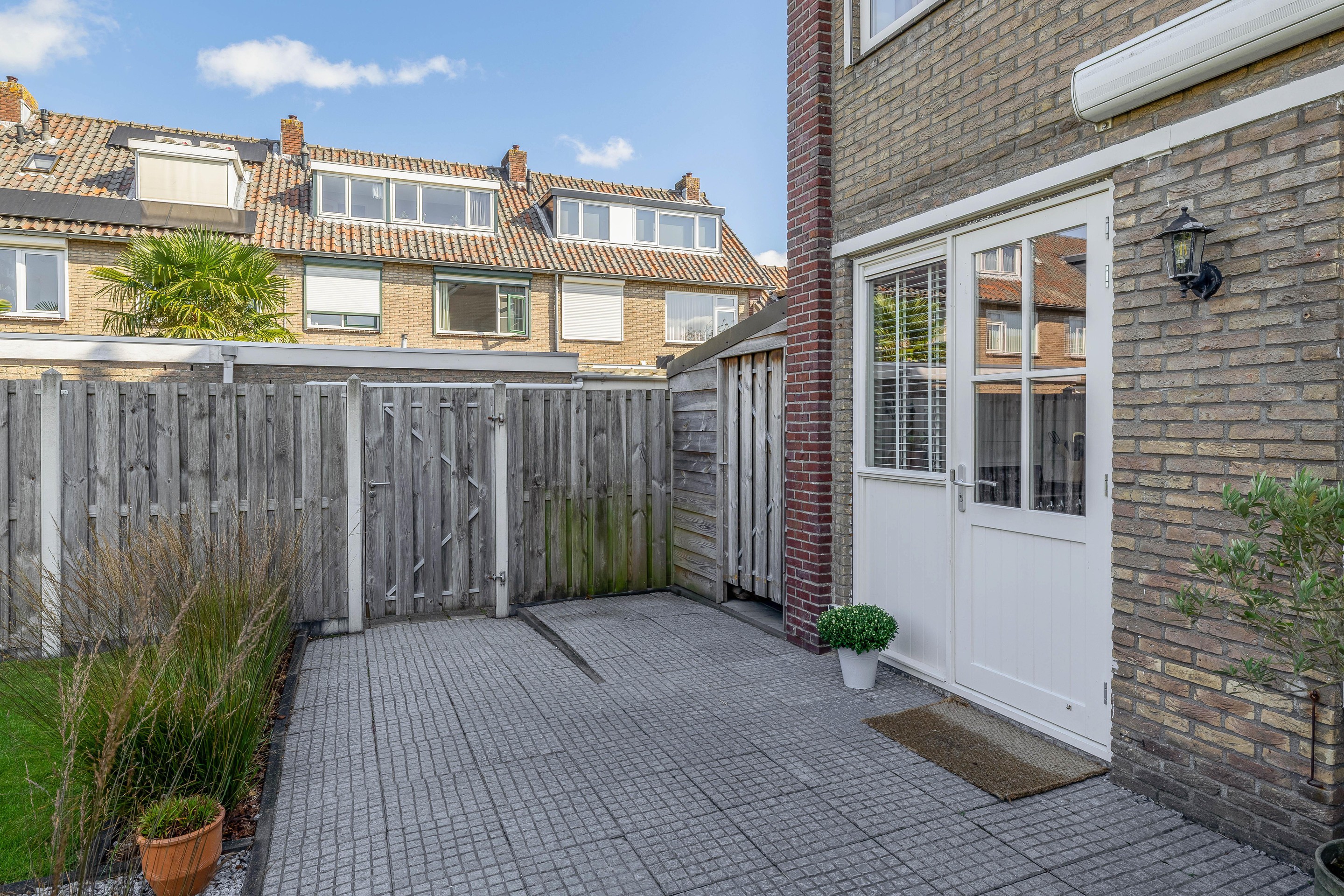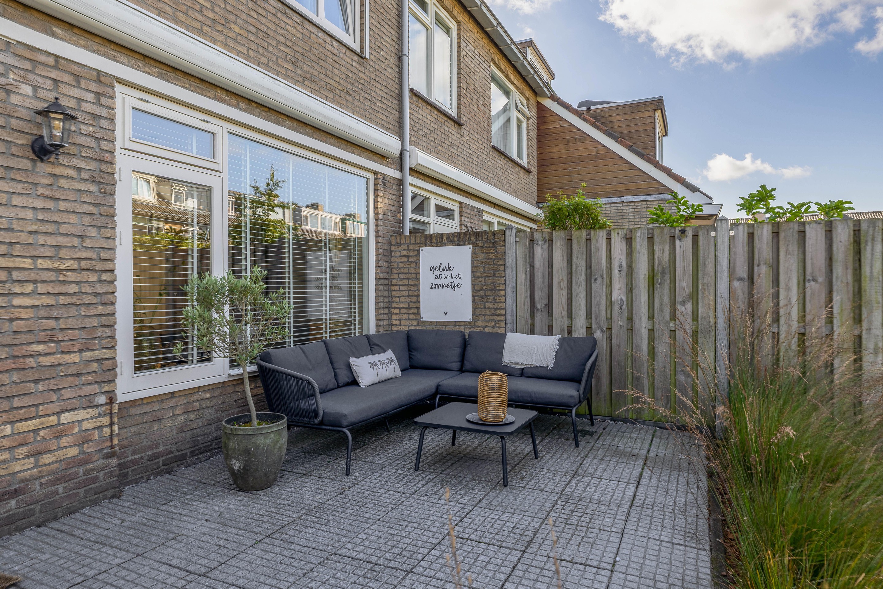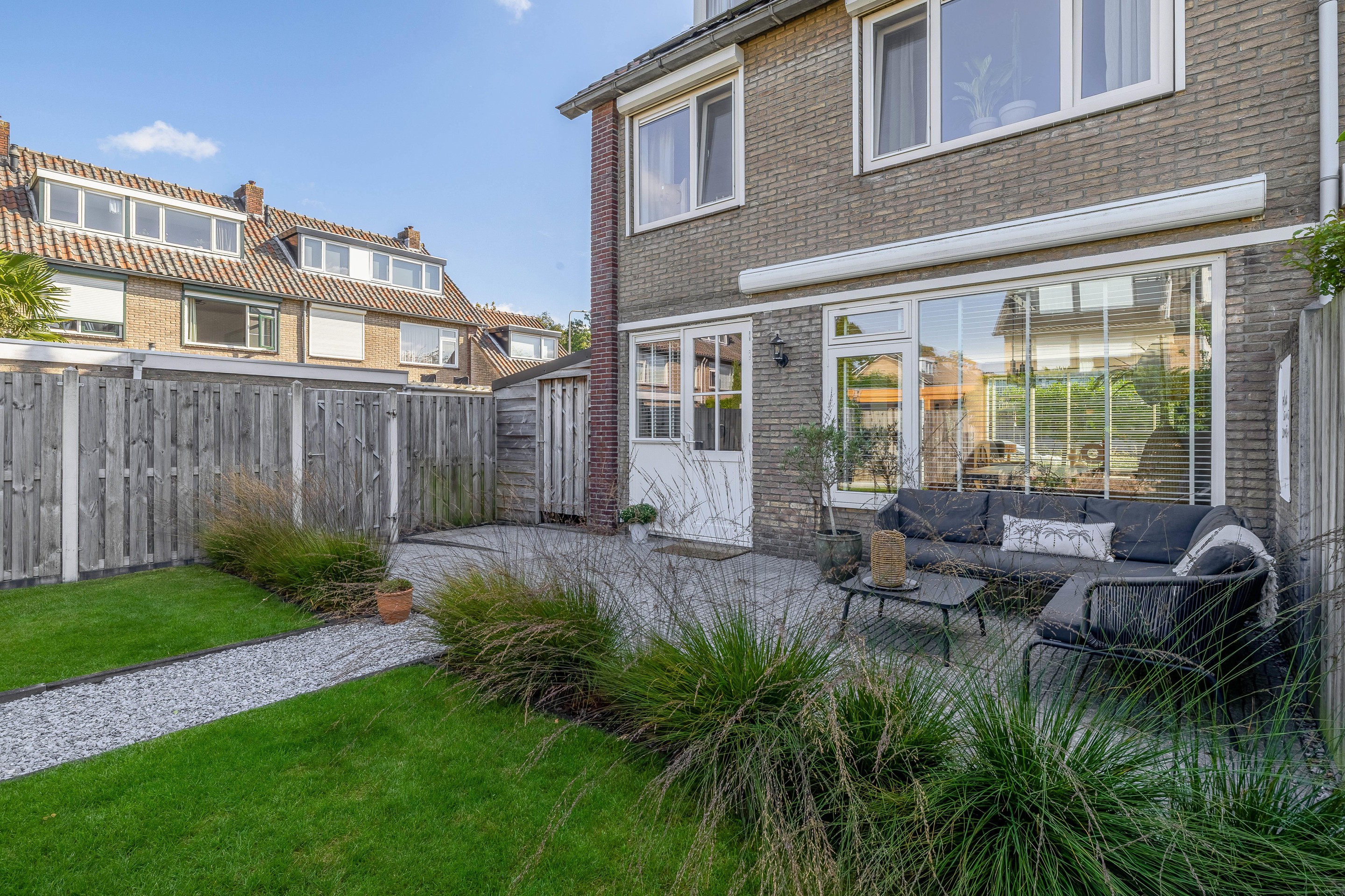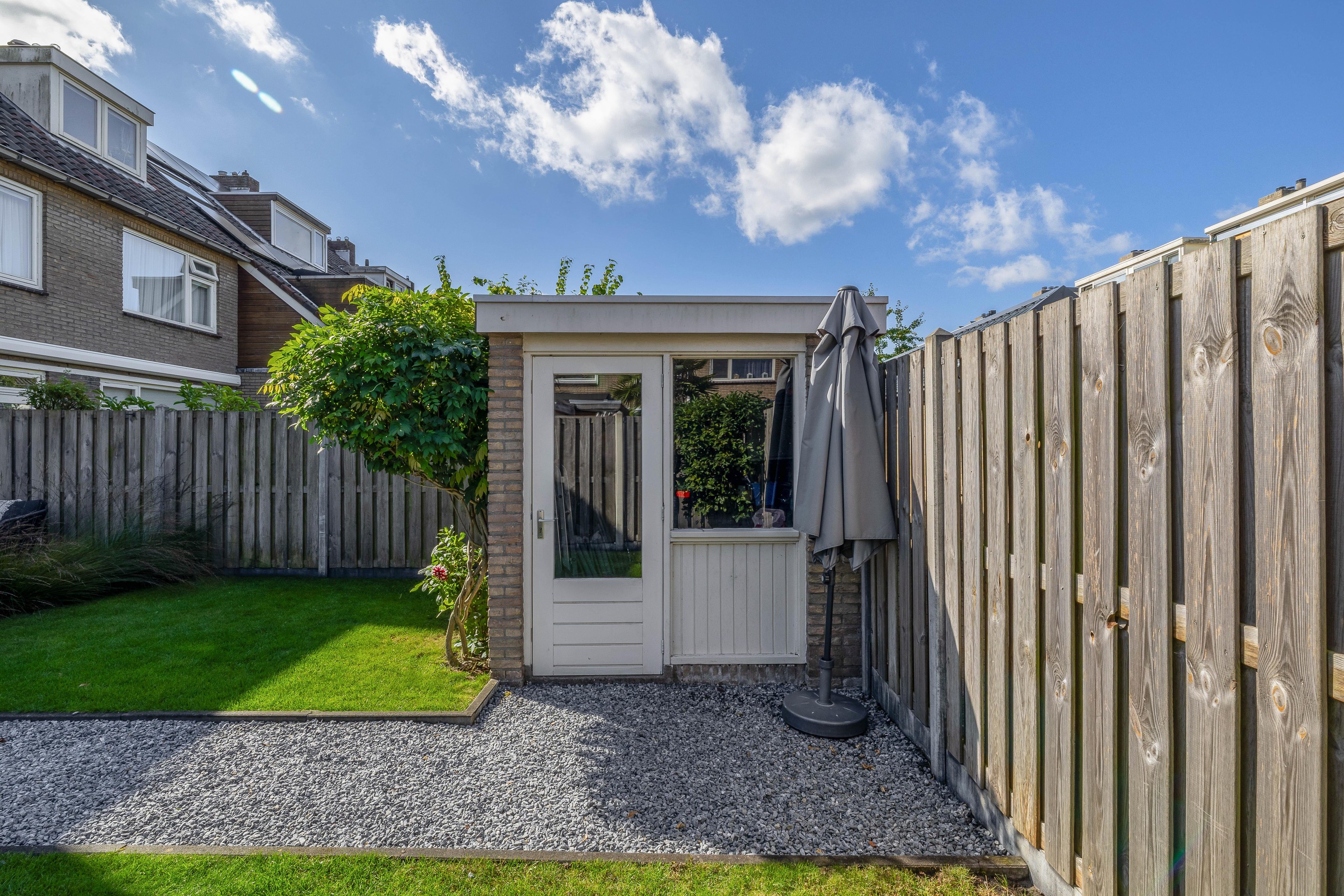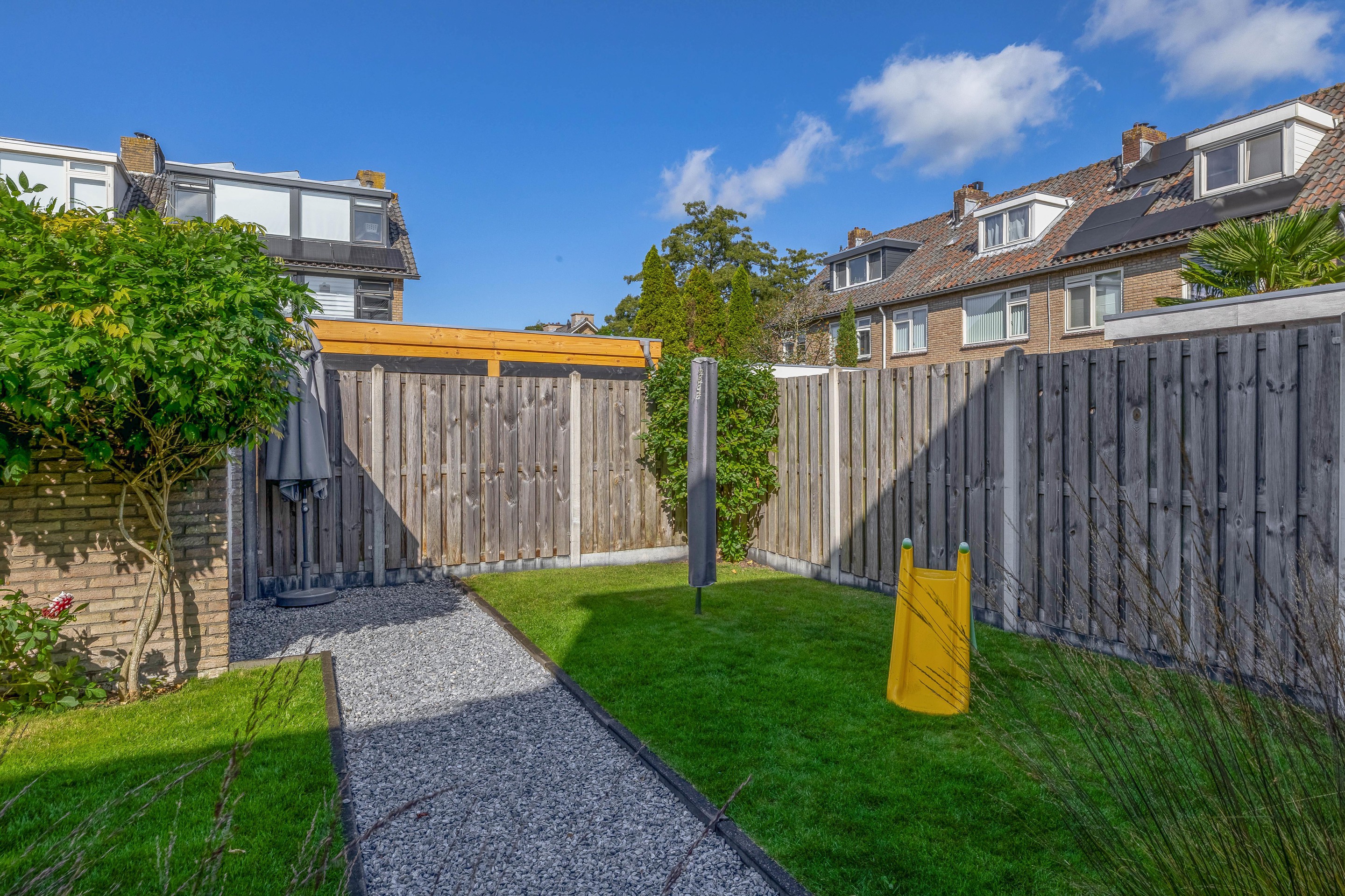 Omdat het een hoekwoning betreft, is de tuin extra breed en was er ruimte om een extra berging aan de zijkant van het huis te bouwen. Ideaal als klusruimte of voor de bakfiets. Achter in de tuin staat nog een stenen berging. De tuin is kindvriendelijk aangelegd met een grote grasmat, kleine borders en vaste planten tegen de schutting en berging. Voor de woning is een terras aangelegd en het grote zonnescherm zorgt op warme dagen voor extra schaduw. Op de verdieping zijn de slaapkamers voorzien van rolluiken.