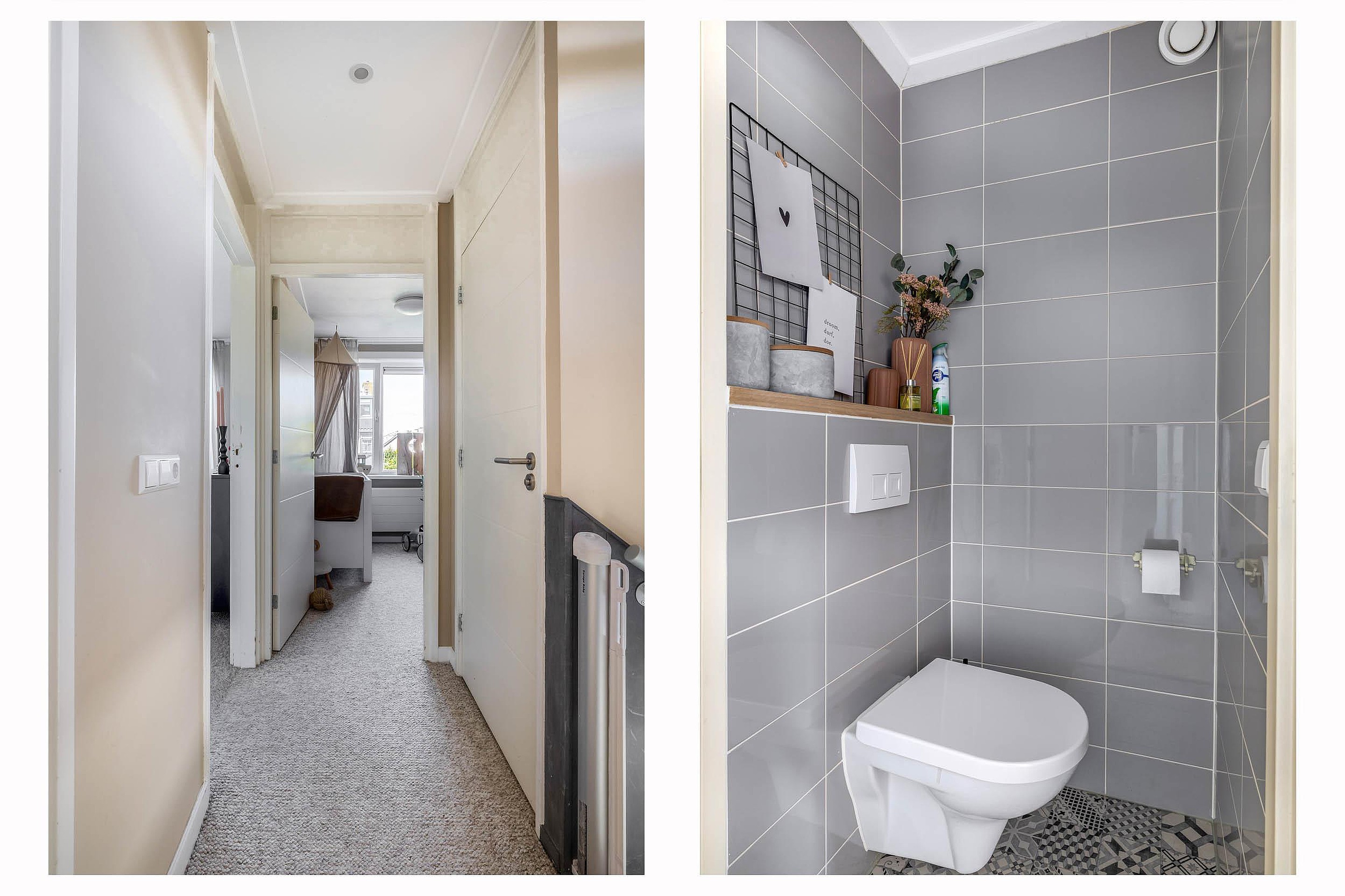 Overloop met een geheel betegeld, separaat tweede toilet. De prachtige badkamer is volledig gerenoveerd en afgewerkt met een combinatie van grijze wandtegels en tegels met een natuursteenlook. Er is een breed houten meubel geplaatst met daarop twee waskommen en twee laden voor het opbergen van spullen. De brede spiegel en designradiator maken het geheel compleet.
