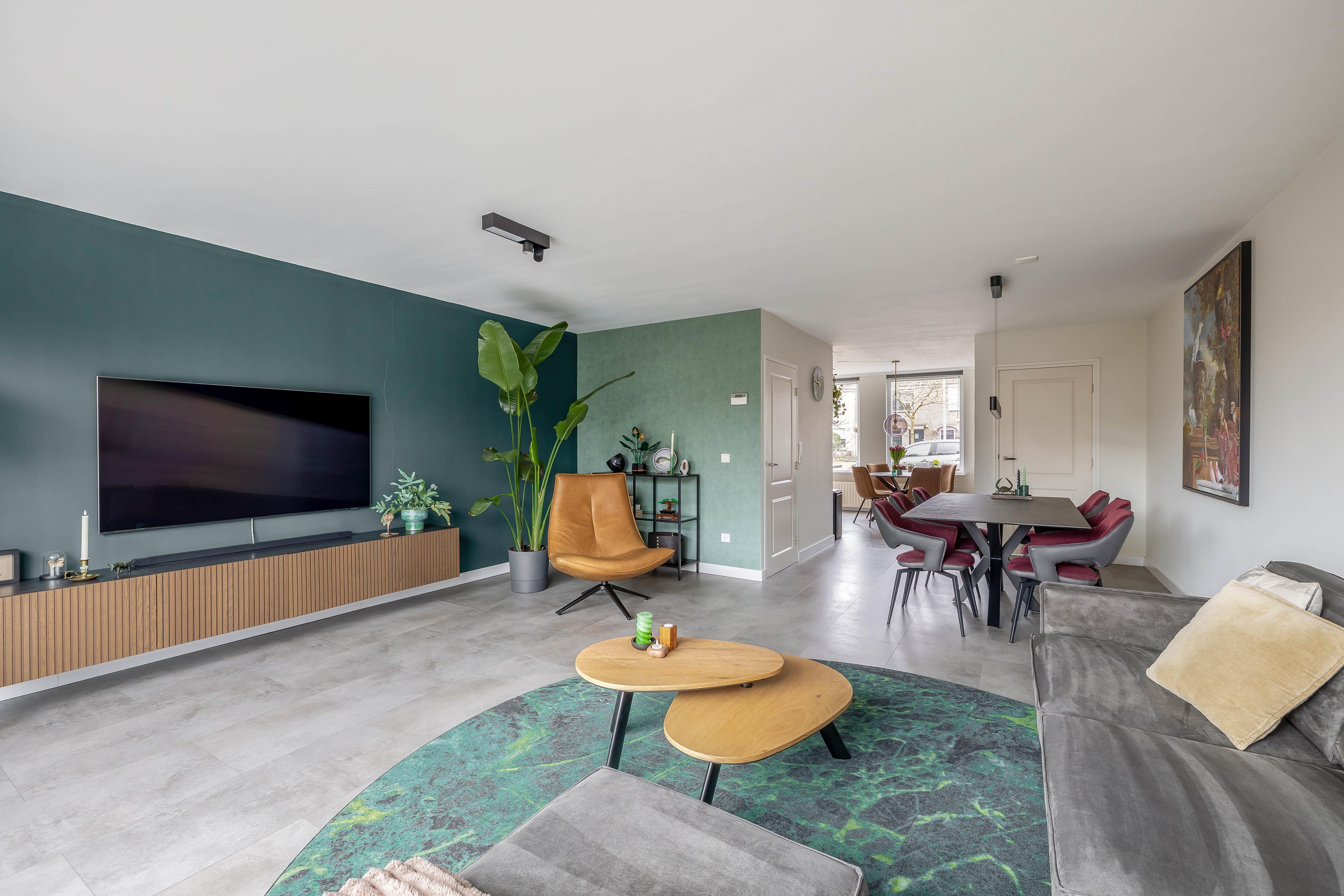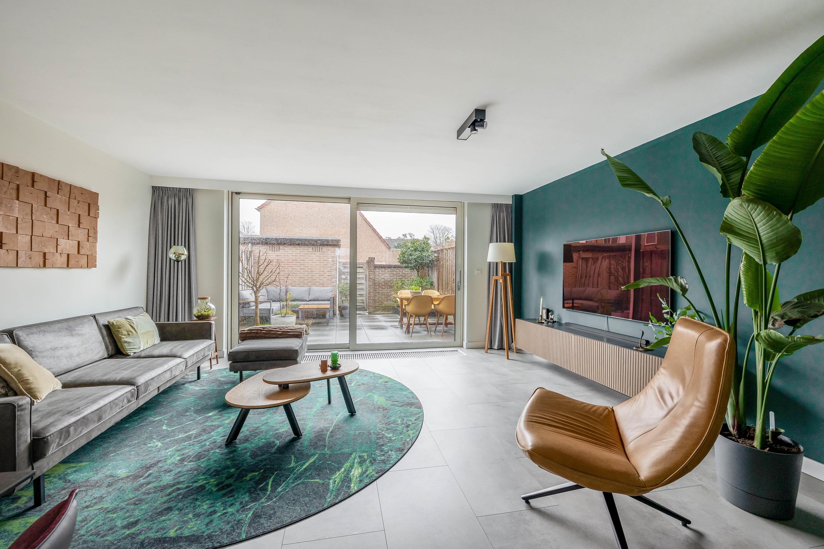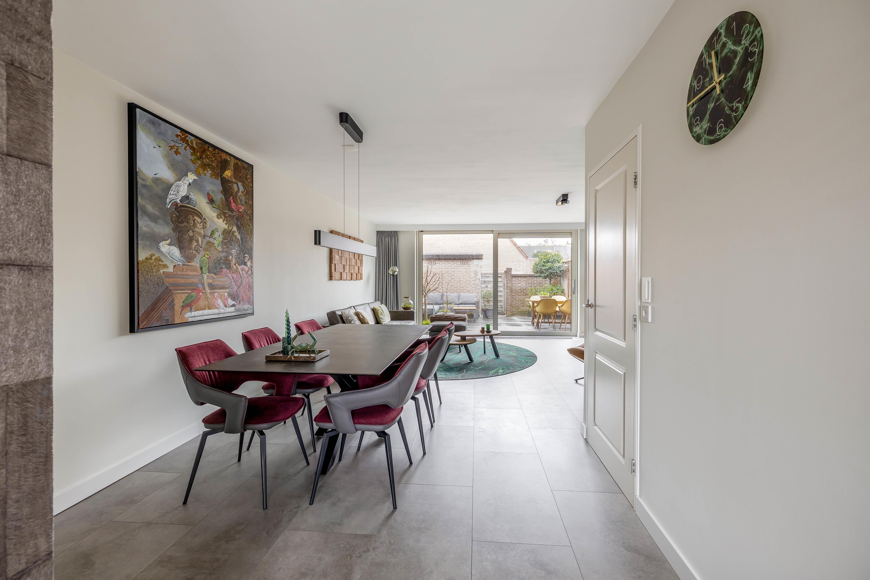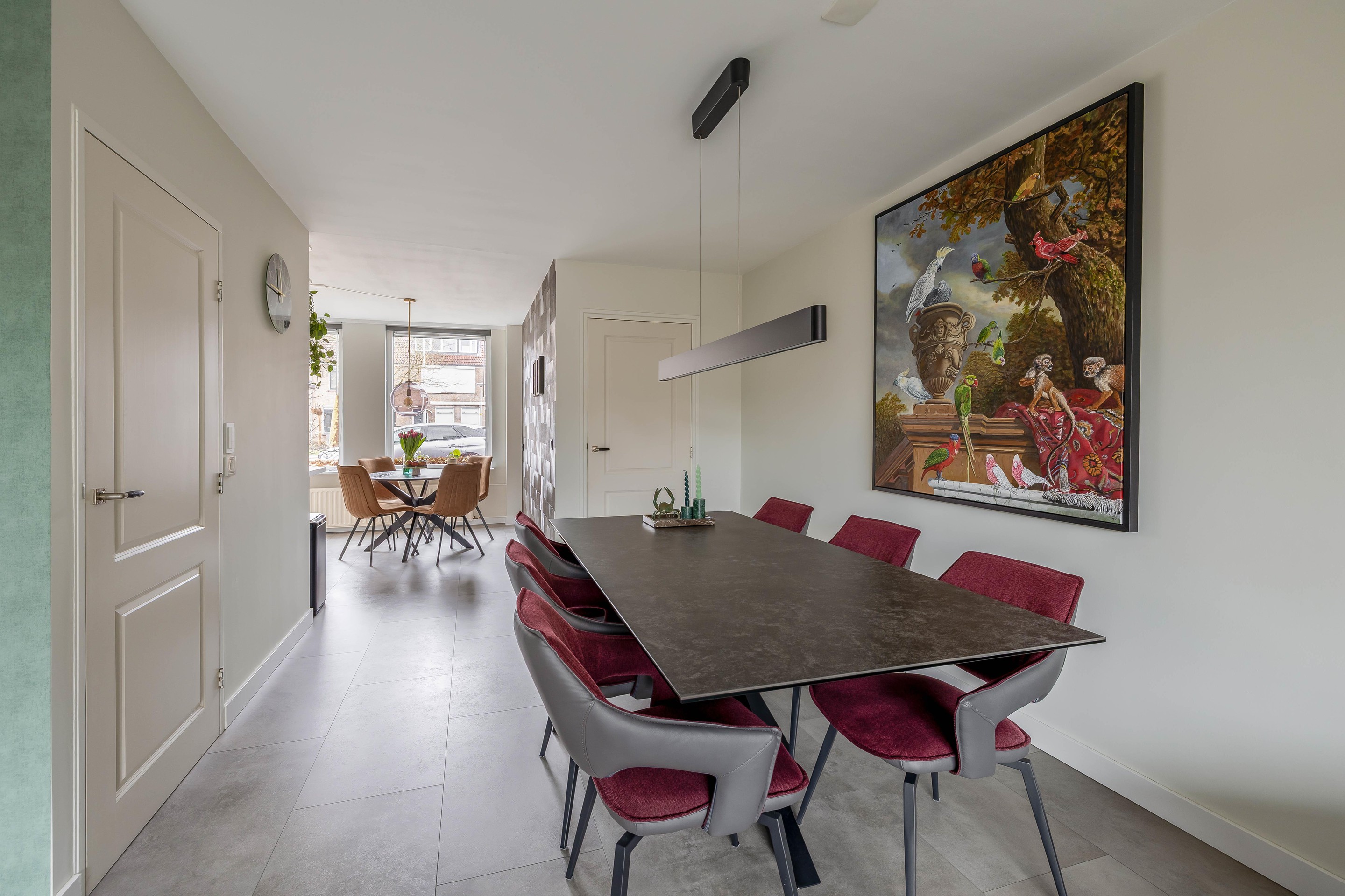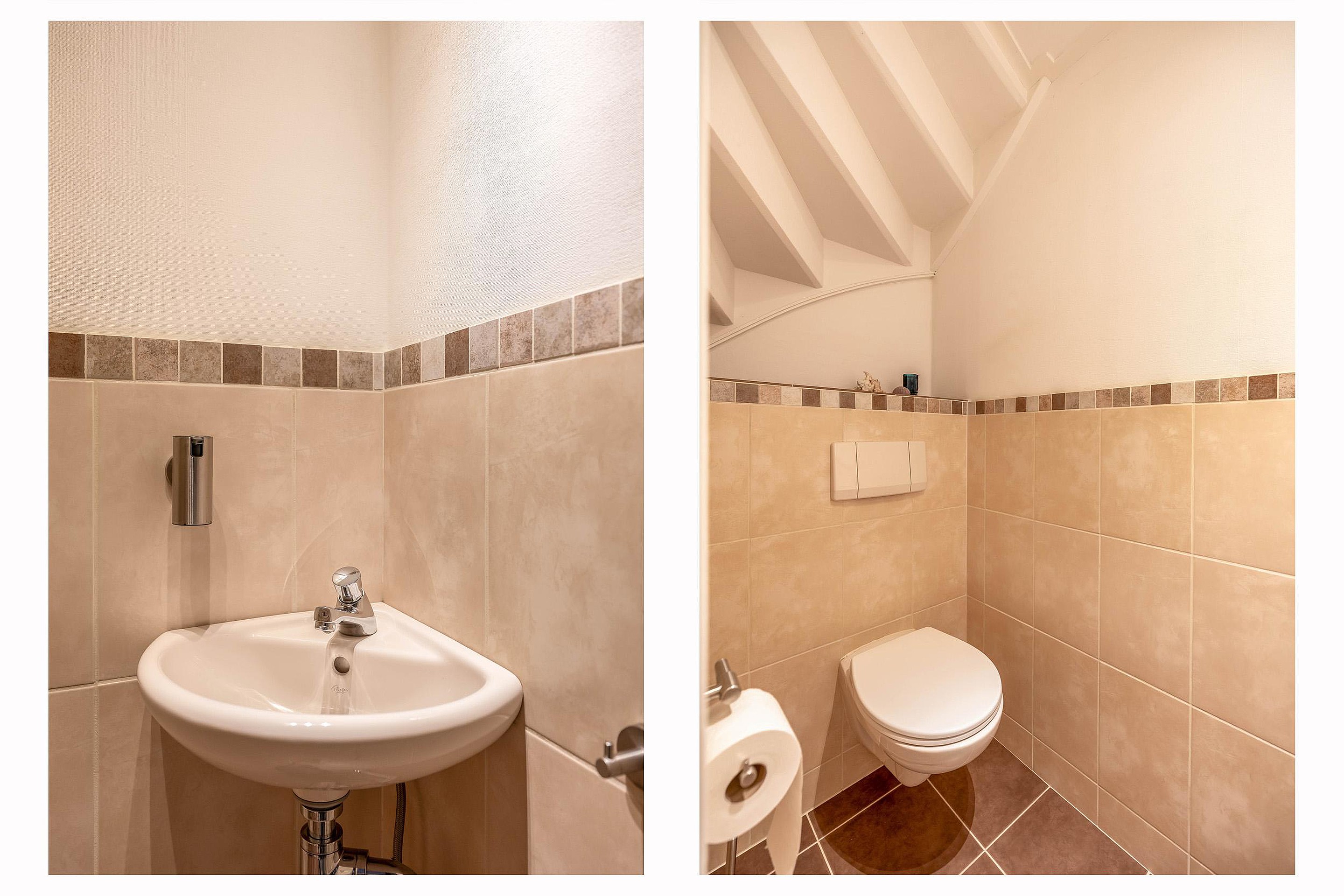 De woonkamer aan de achterzijde is dankzij de uitbouw heerlijk royaal geworden met een oppervlakte van circa 35 m2. De brede kunststof schuifpui zorgt voor een mooie verbinding met de achtertuin. Centraal in de woning bevindt zich een tweede hal met de trapopgang en een volledig betegelde toiletruimte met vrijhangend toilet.