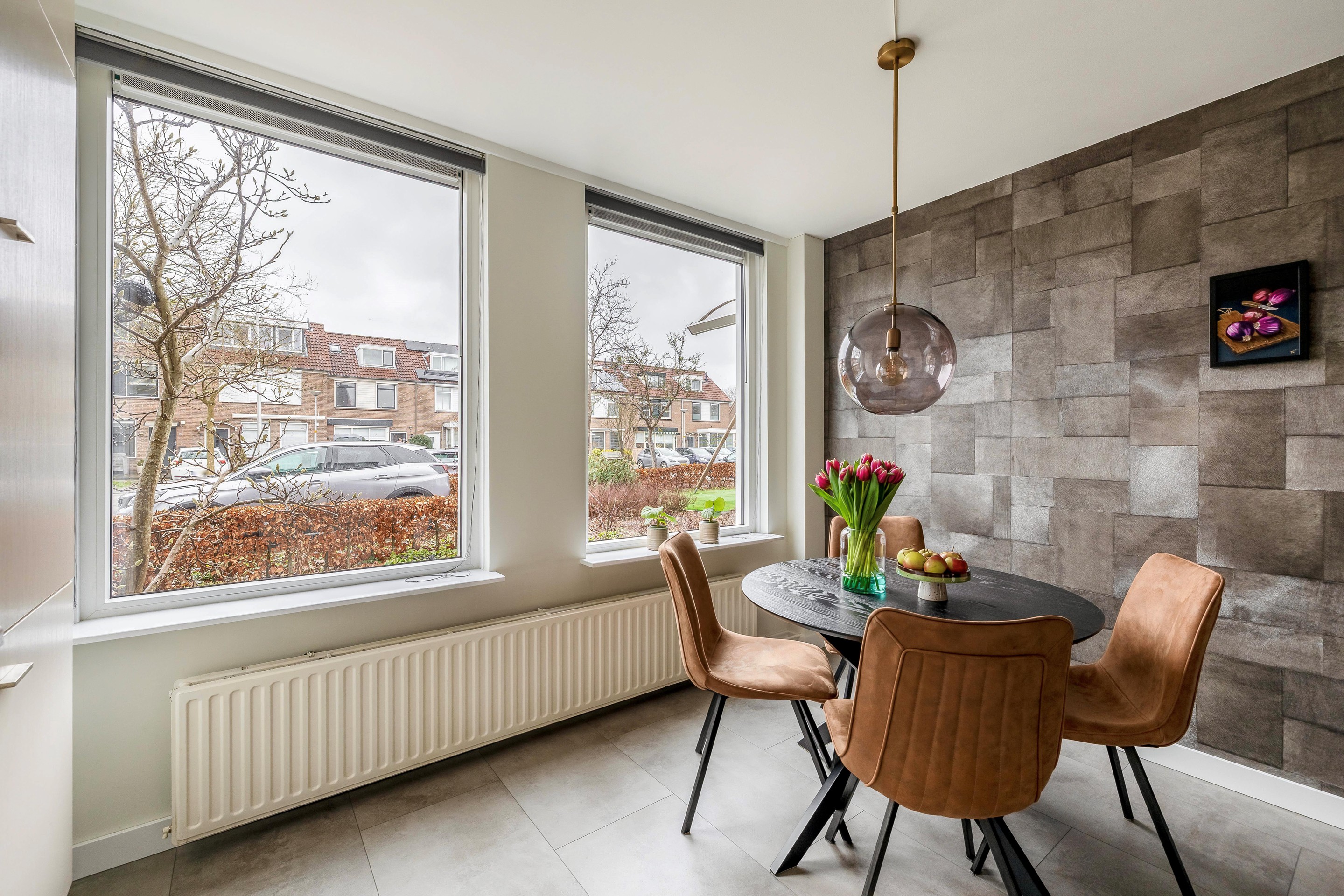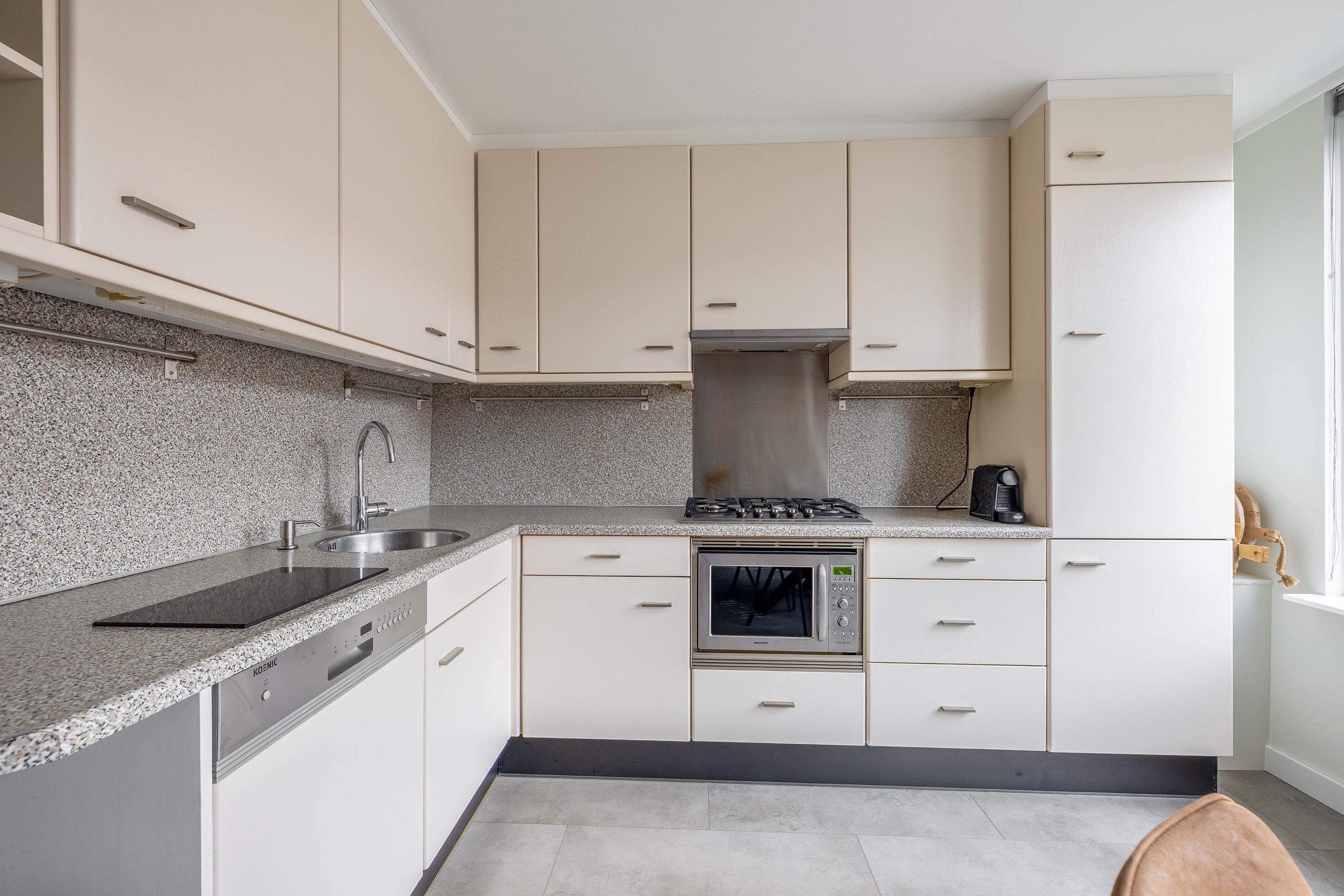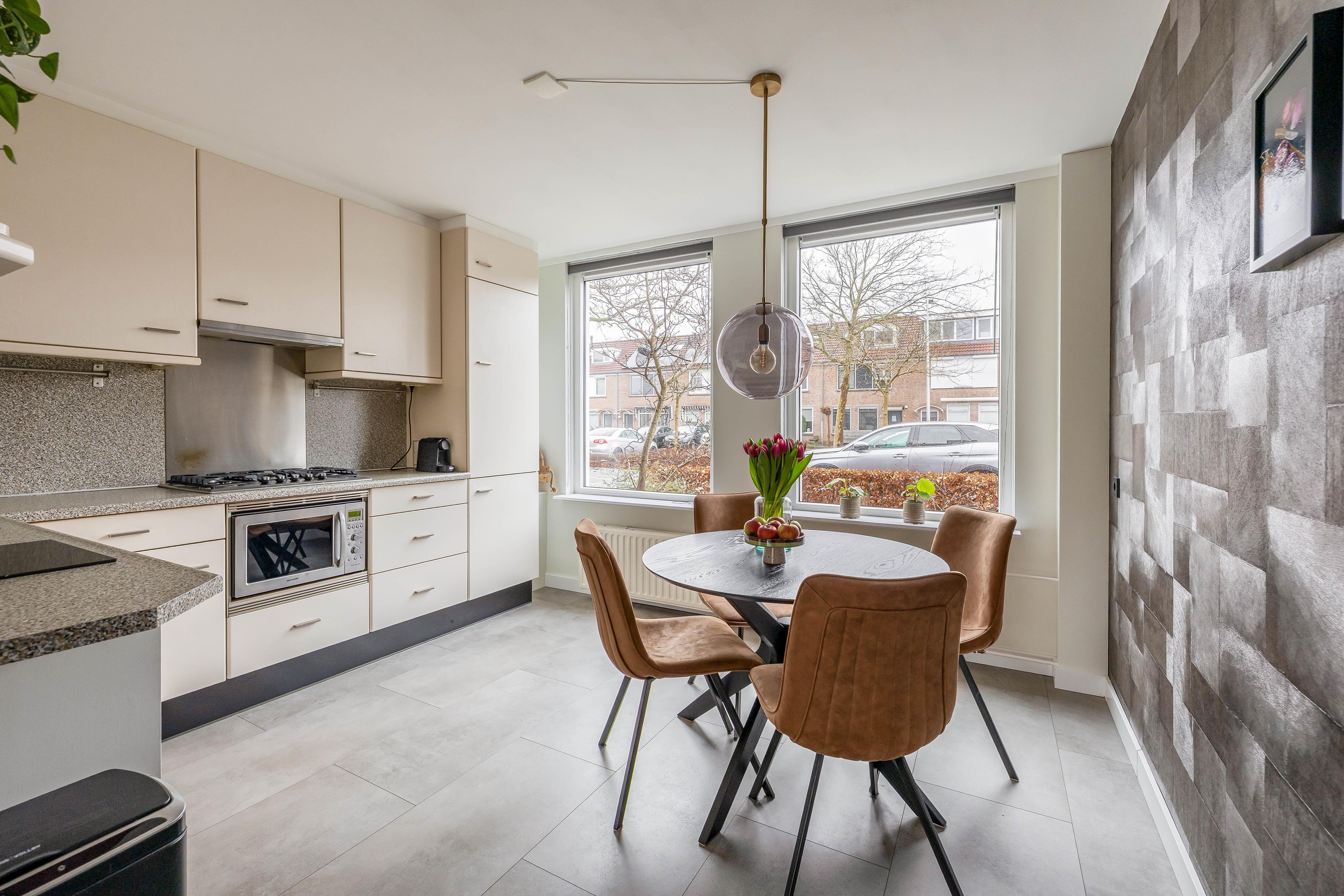De keuken aan de voorzijde is ruim van opzet en opgesteld in een hoek. Hoewel de keuken wat ouder is, is deze keurig onderhouden en volledig functioneel met inbouwapparatuur zoals een 5-pits gaskookplaat, vaatwasser en combimagnetron. Een belangrijk pluspunt is dat beide gevelkozijnen in de keuken in 2025 nog zijn vervangen door moderne kunststof kozijnen met HR++ glas.