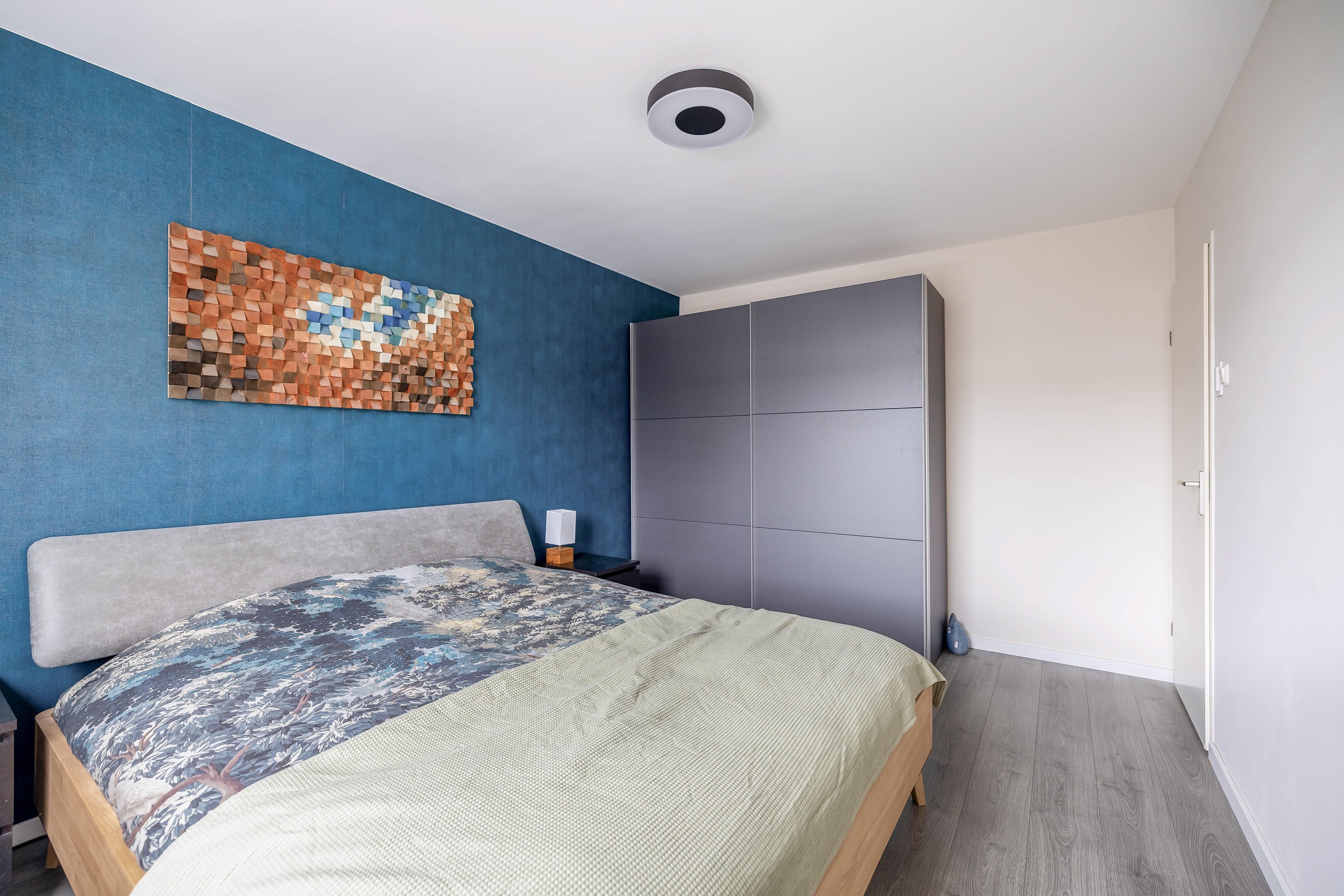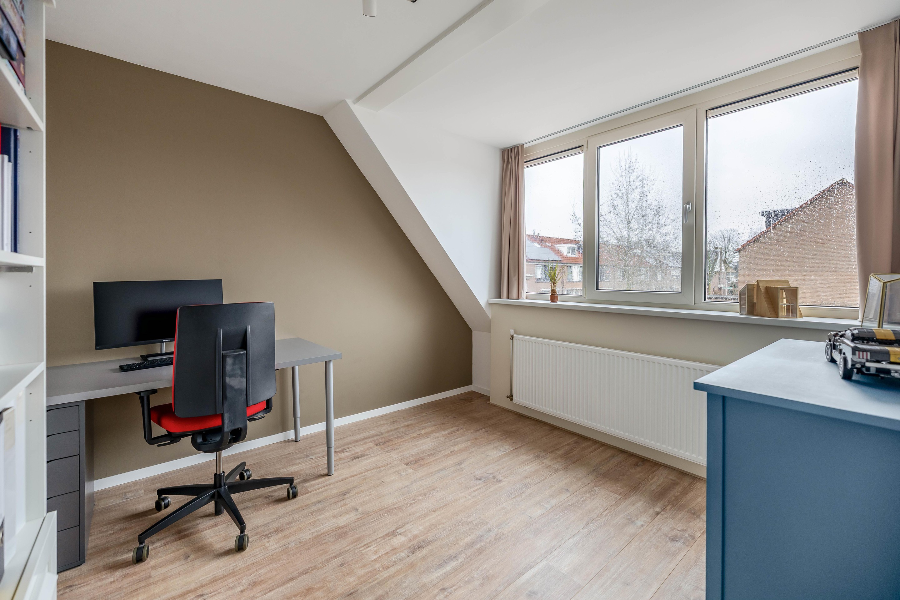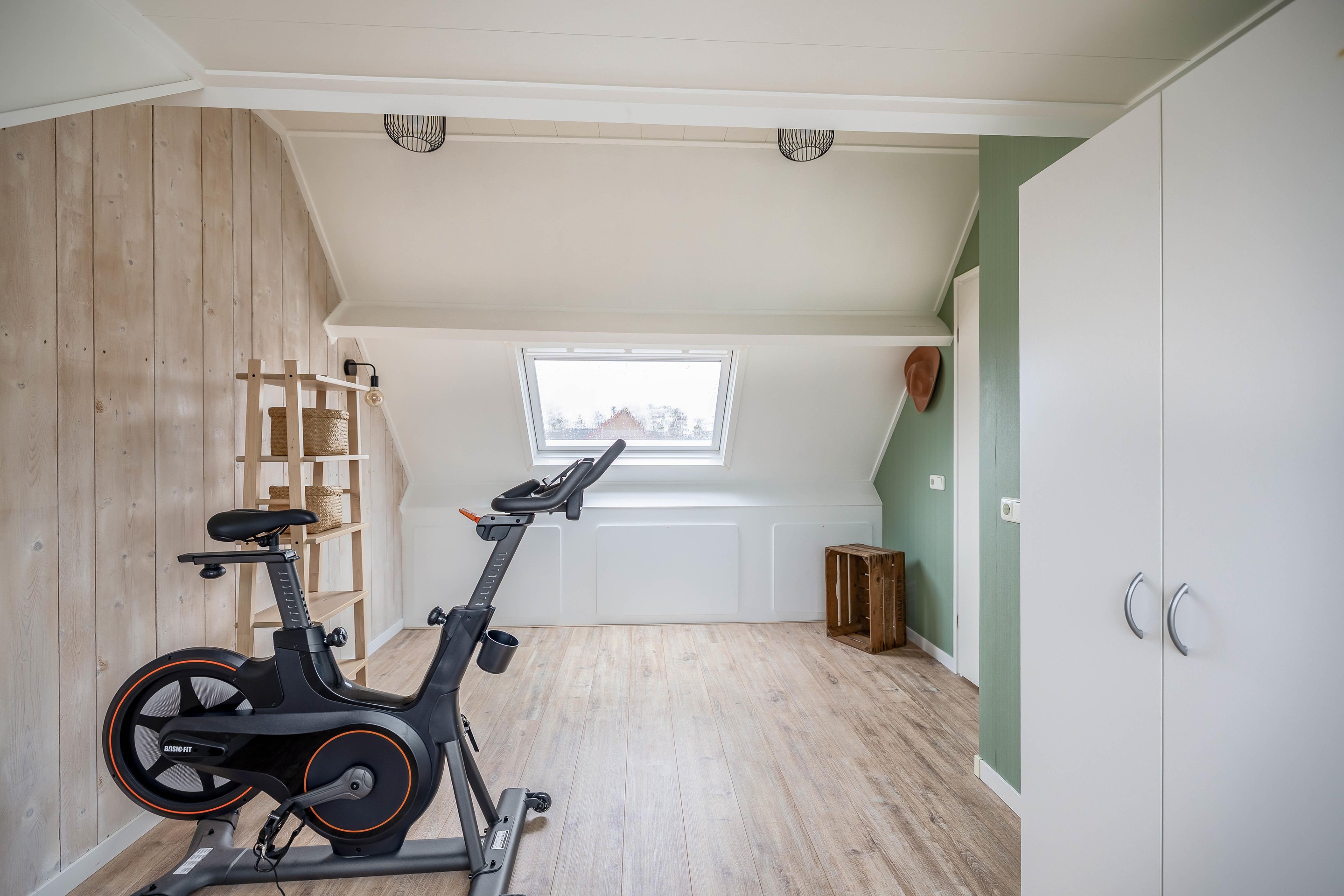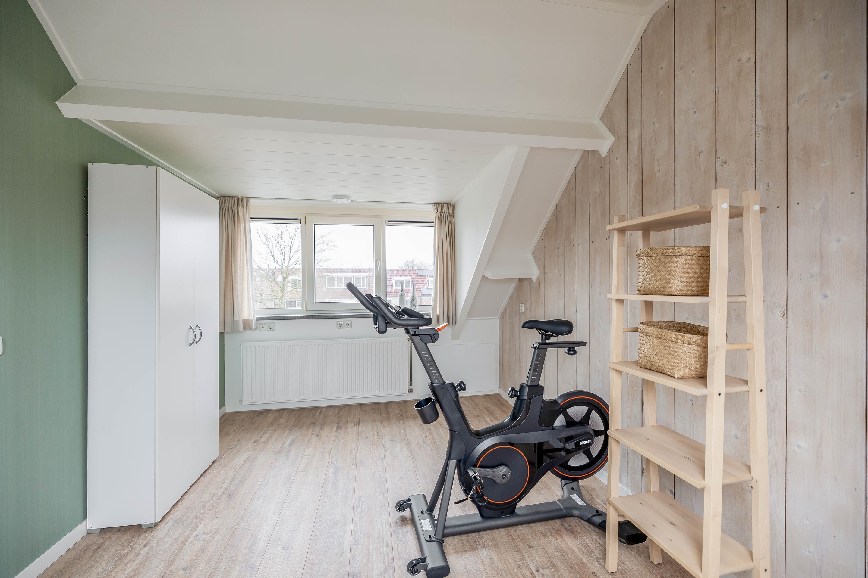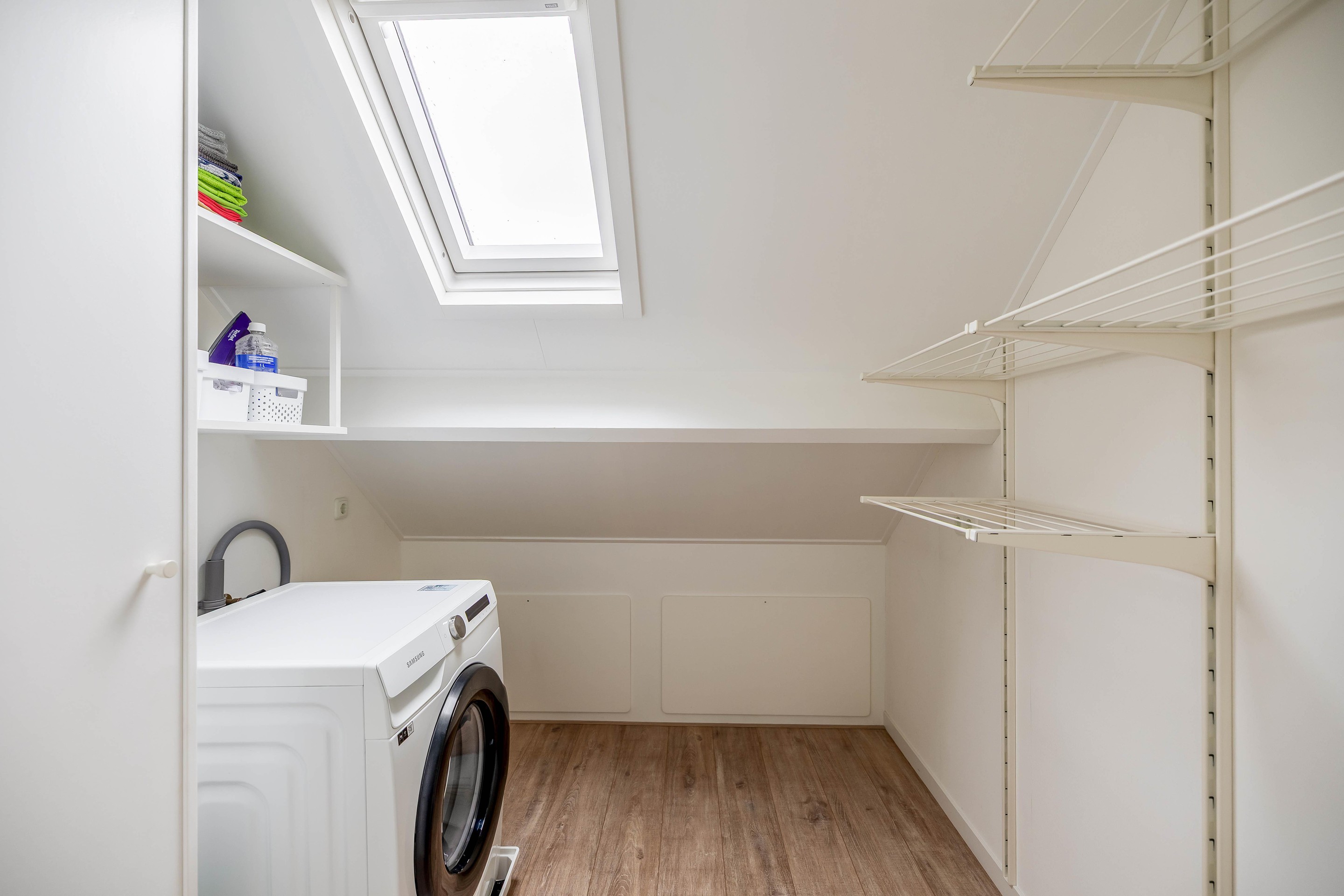 De zolderverdieping is via een vaste trap bereikbaar en optimaal benut. Op de overloop is er extra bergruimte gecreëerd achter de knieschotten en zorgt een kunststof Velux dakraam voor natuurlijk lichtinval. Er is een aparte, verzorgde wasruimte aanwezig voor de opstelling van de wasmachine en droger, evenals een kast waarin de cv-ketel (Intergas, 2020) netjes is weggewerkt. De vierde slaapkamer op deze verdieping is bijzonder licht en ruimtelijk door de combinatie van een Velux dakvenster aan de achterzijde en een dakkapel aan de voorzijde.