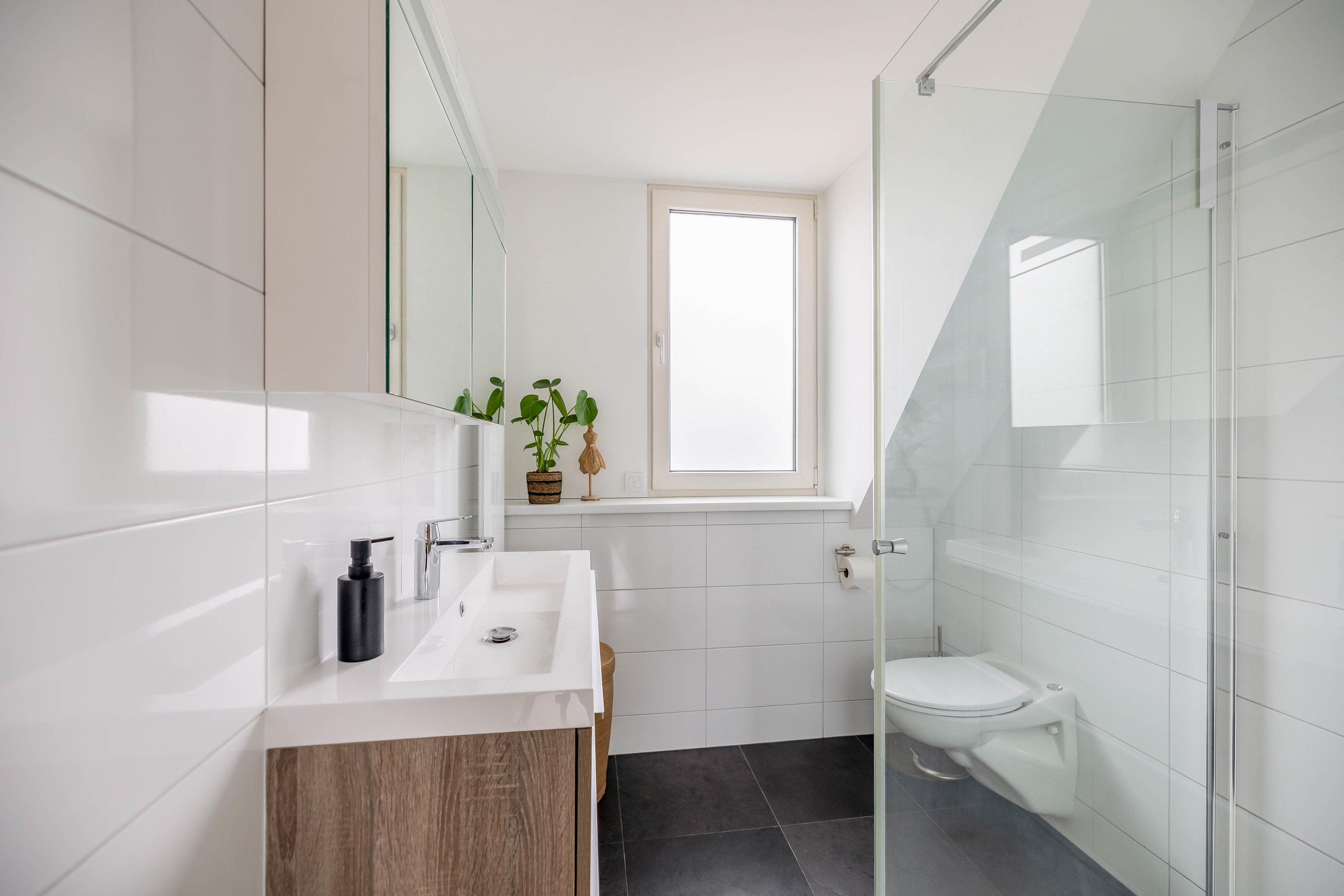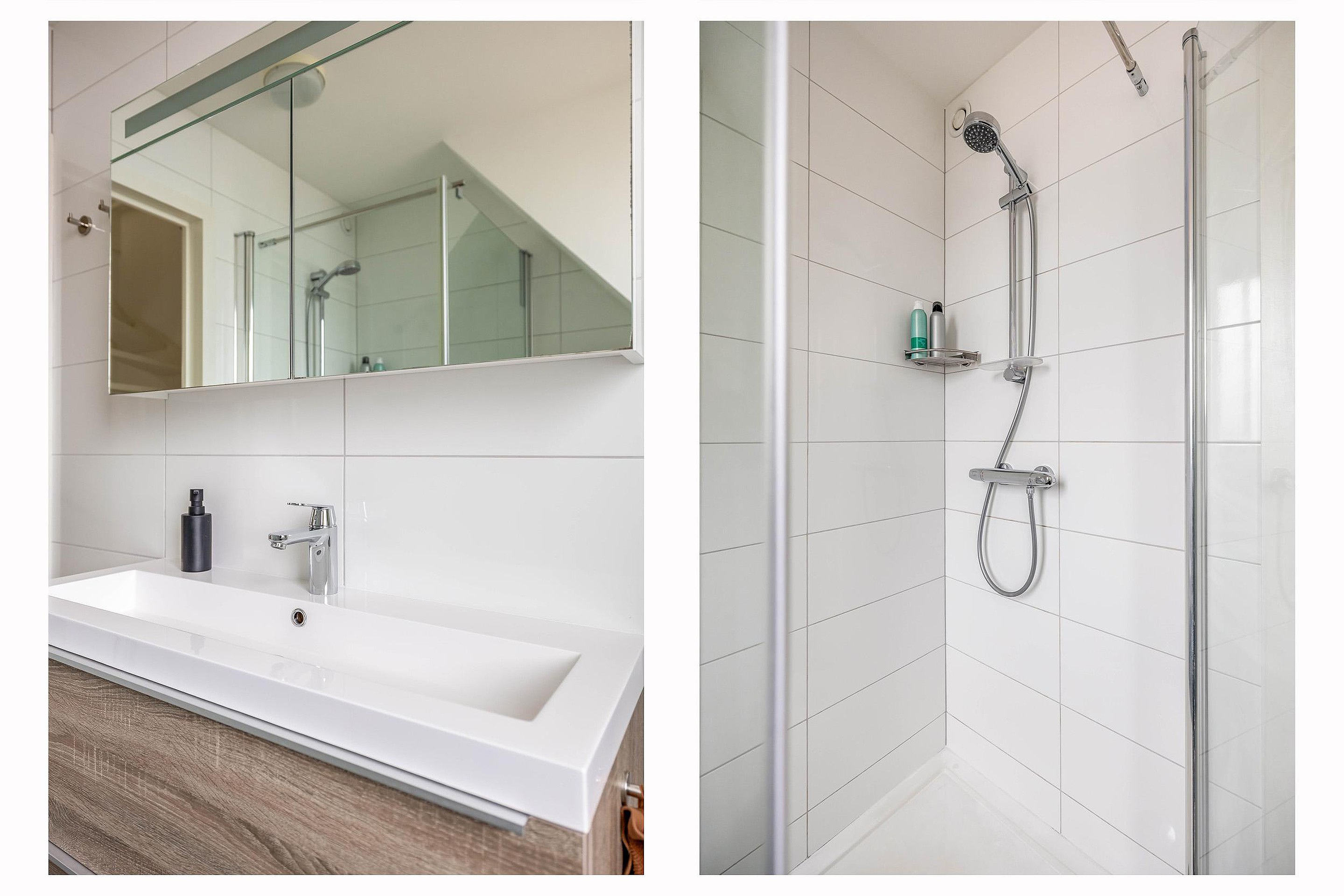 Op de eerste verdieping biedt de overloop toegang tot de verschillende vertrekken. Aan de achterzijde bevindt zich een woningbrede dakkapel, waardoor er aanzienlijk meer leefruimte is ontstaan in zowel de hoofdslaapkamer als de badkamer. Deze ramen zijn bovendien voorzien van elektrisch bedienbare rolluiken voor optimaal comfort. De badkamer is vernieuwd en modern uitgevoerd met een douchecabine, een wastafelmeubel met stijlvolle waskom en een tweede vrijhangend toilet. Aan de voorzijde van de woning liggen nog twee verzorgde slaapkamers, waarvan er momenteel één in gebruik is als praktische kastenkamer.