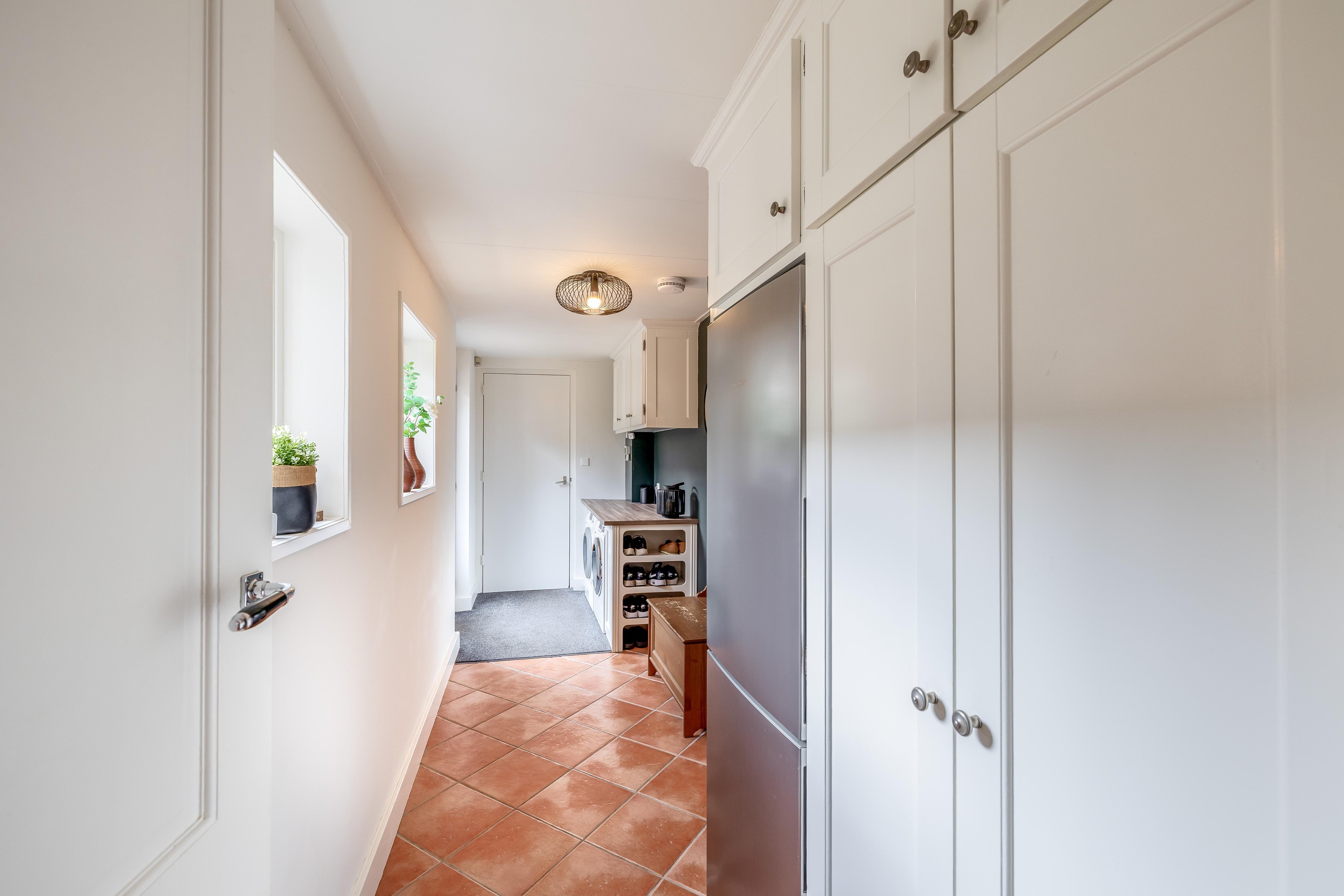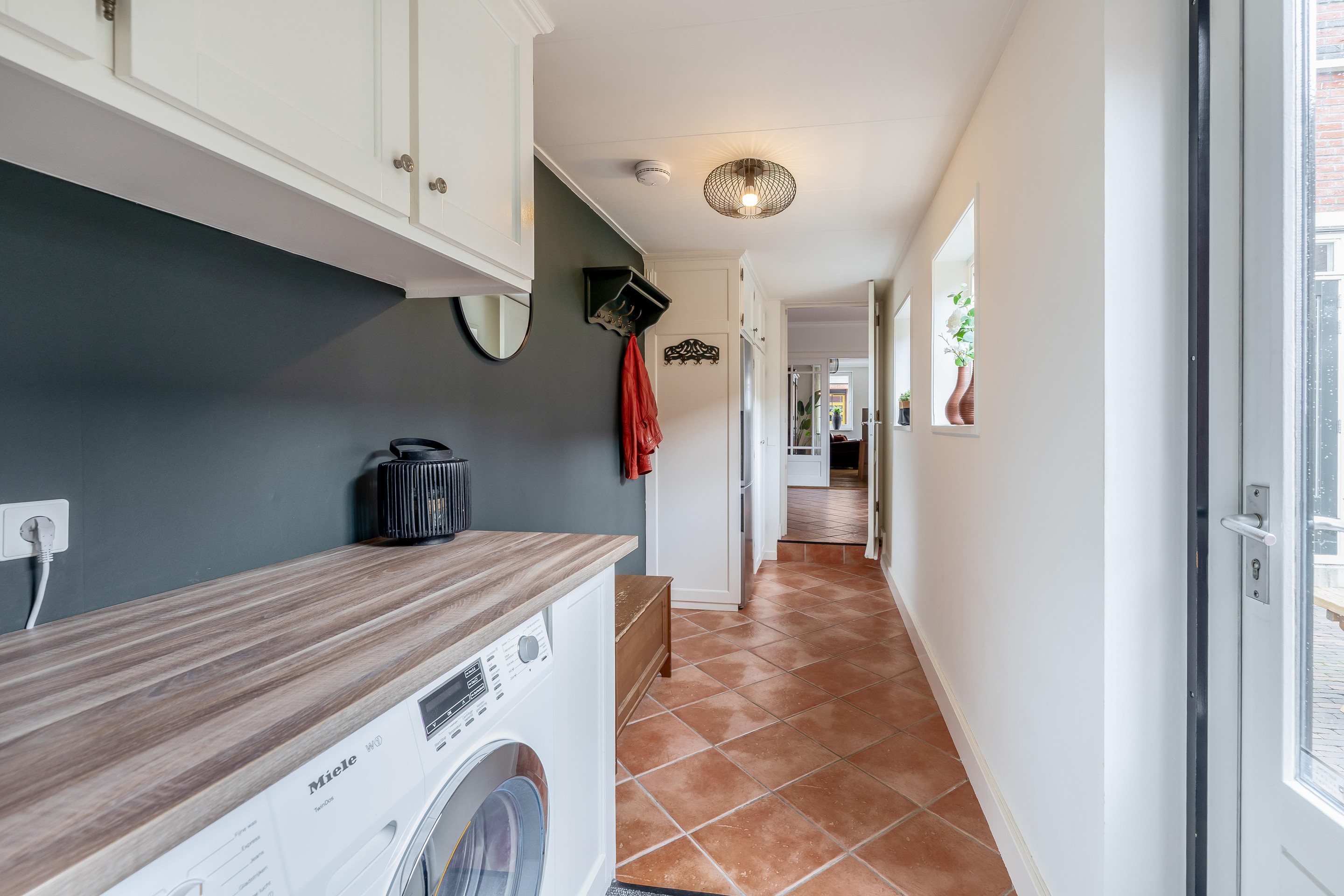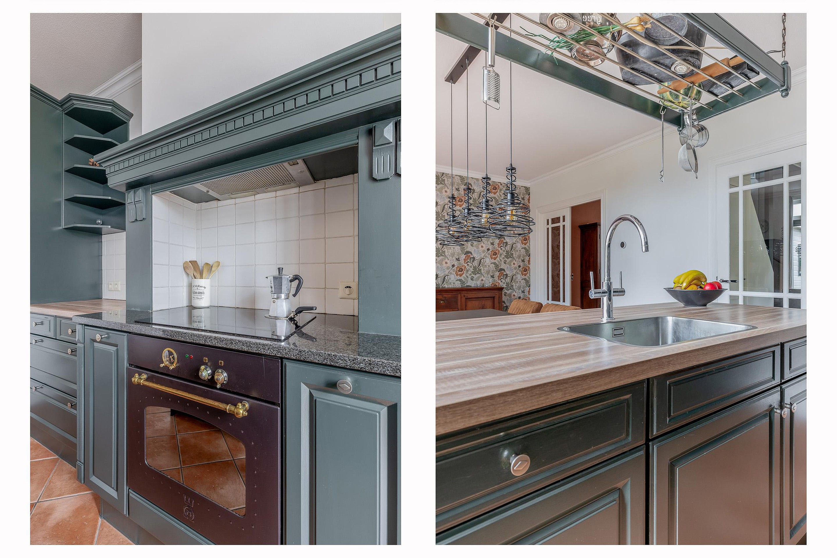 Via karakteristieke openslaande deuren bereikt u de ruime woonkeuken, die dankzij de plavuizenvloer en de landelijke opstelling een robuust karakter heeft. Het vormt het hart van deze ruimte, geflankeerd door hoogwaardige inbouwapparatuur zoals een inductiekookplaat onder een fraaie schouw, koelkast, vriezer en vaatwasmachine. De openslaande deuren aan de achterzijde verbinden het binnenleven naadloos met de tuin. Praktisch gemak is te vinden in de aangrenzende bijkeuken, die naast de wasaansluitingen ook een directe doorgang biedt naar de opvallend brede garage van 3,80 meter.