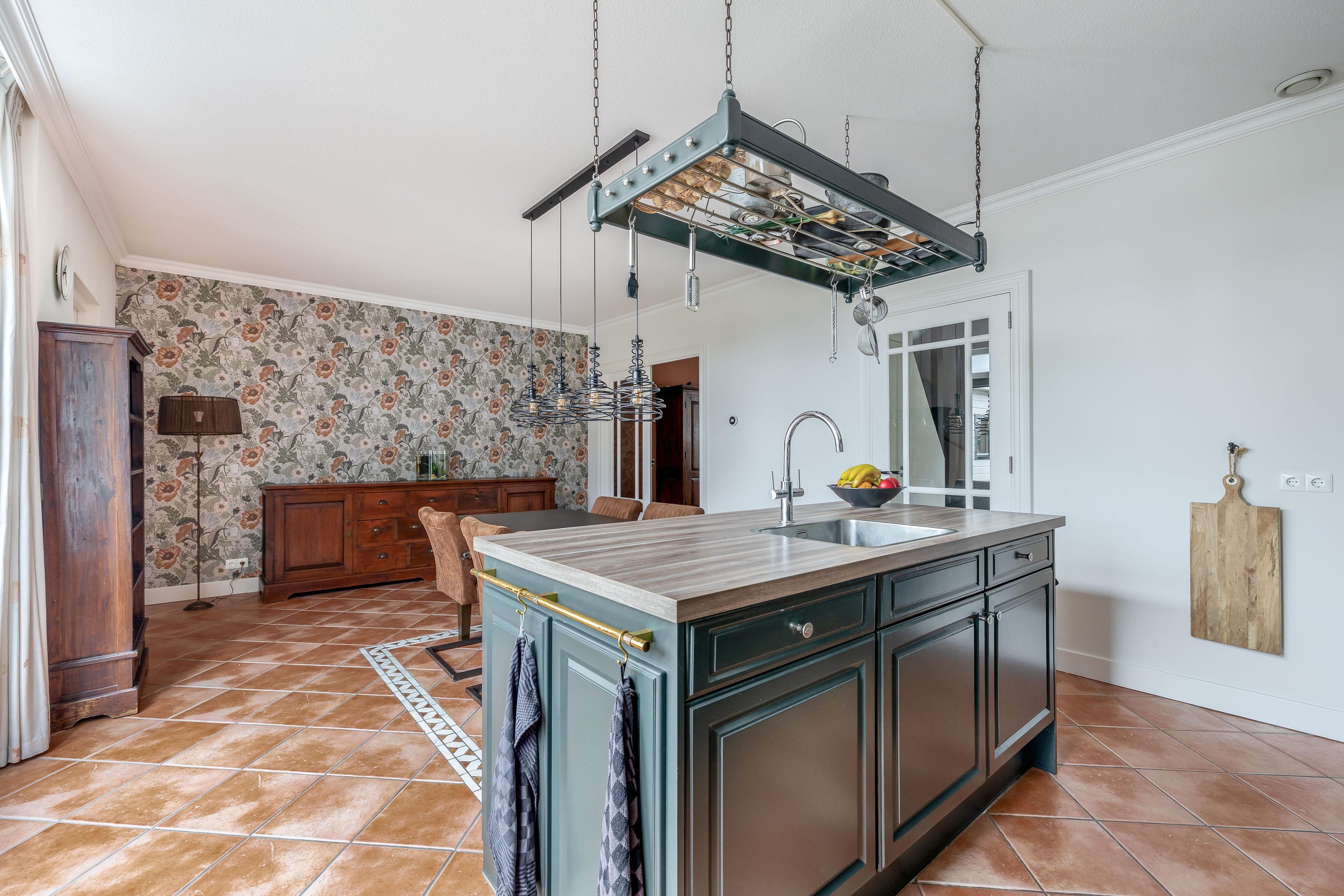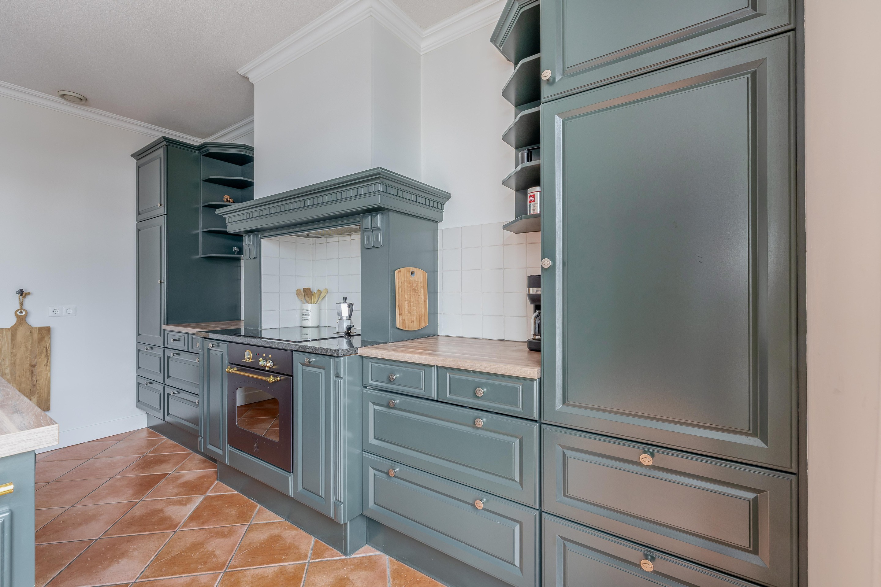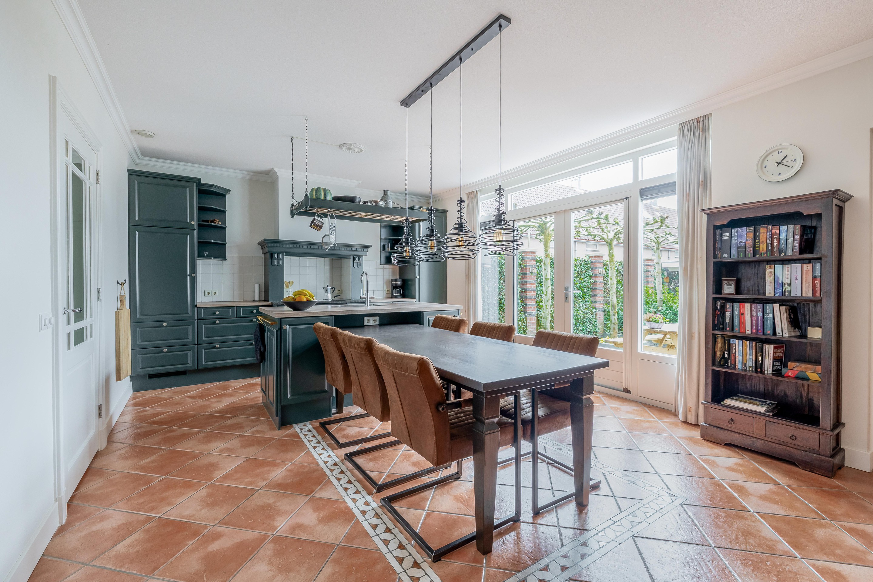 Via karakteristieke openslaande deuren bereikt u de ruime woonkeuken, die dankzij de plavuizenvloer en de landelijke opstelling een robuust karakter heeft. Het vormt het hart van deze ruimte, geflankeerd door hoogwaardige inbouwapparatuur zoals een inductiekookplaat onder een fraaie schouw, koelkast, vriezer en vaatwasmachine. De openslaande deuren aan de achterzijde verbinden het binnenleven naadloos met de tuin. Praktisch gemak is te vinden in de aangrenzende bijkeuken, die naast de wasaansluitingen ook een directe doorgang biedt naar de opvallend brede garage van 3,80 meter.