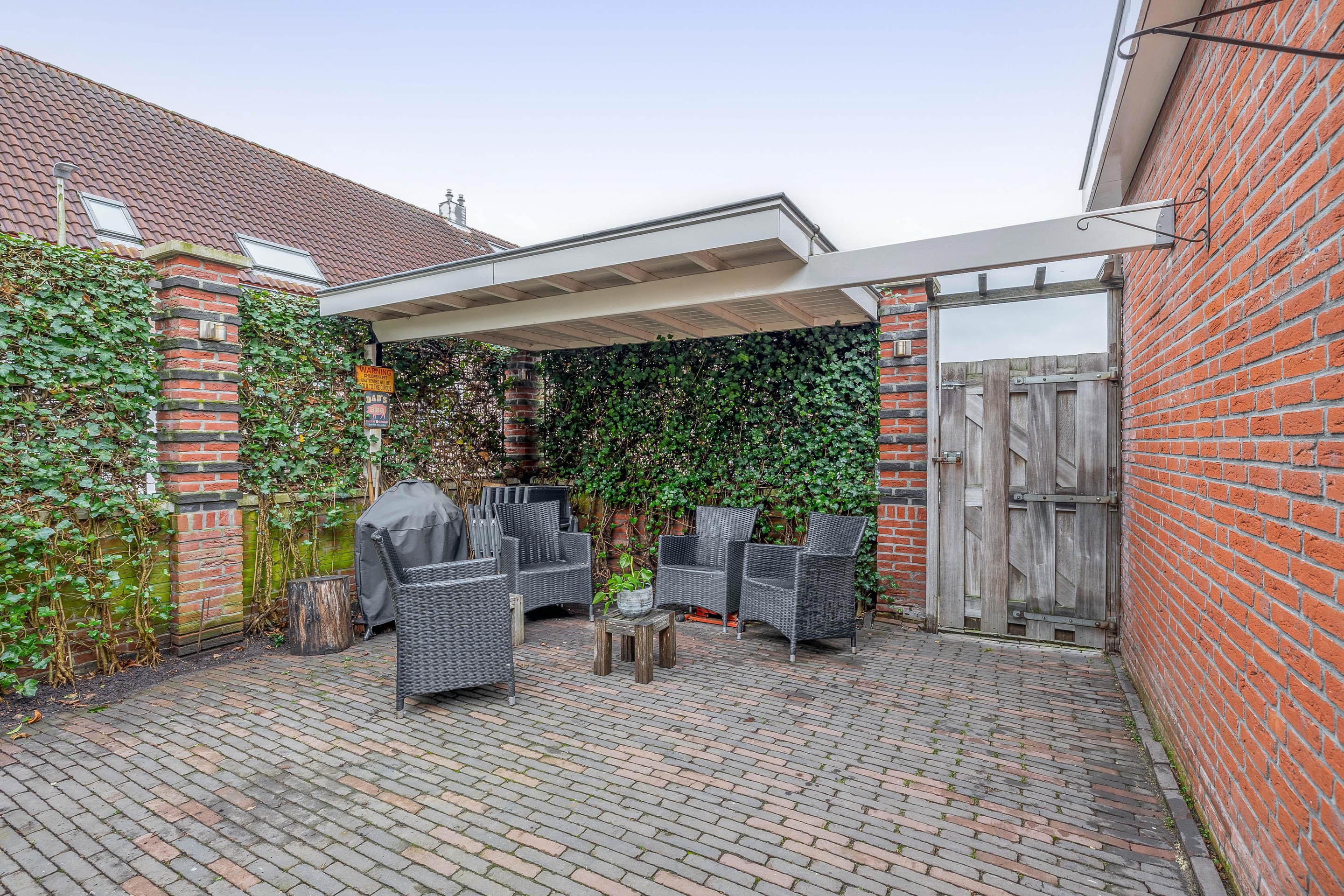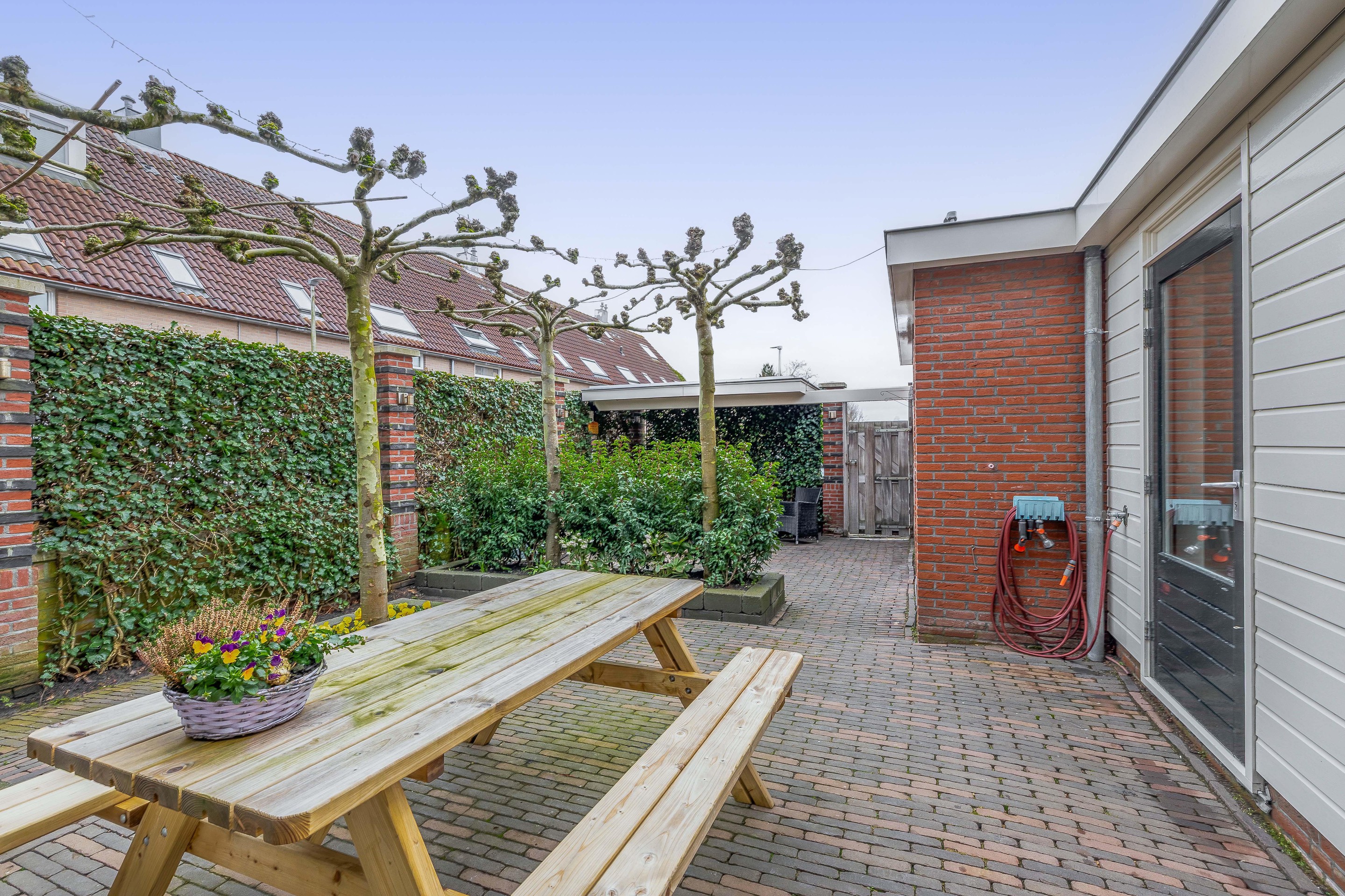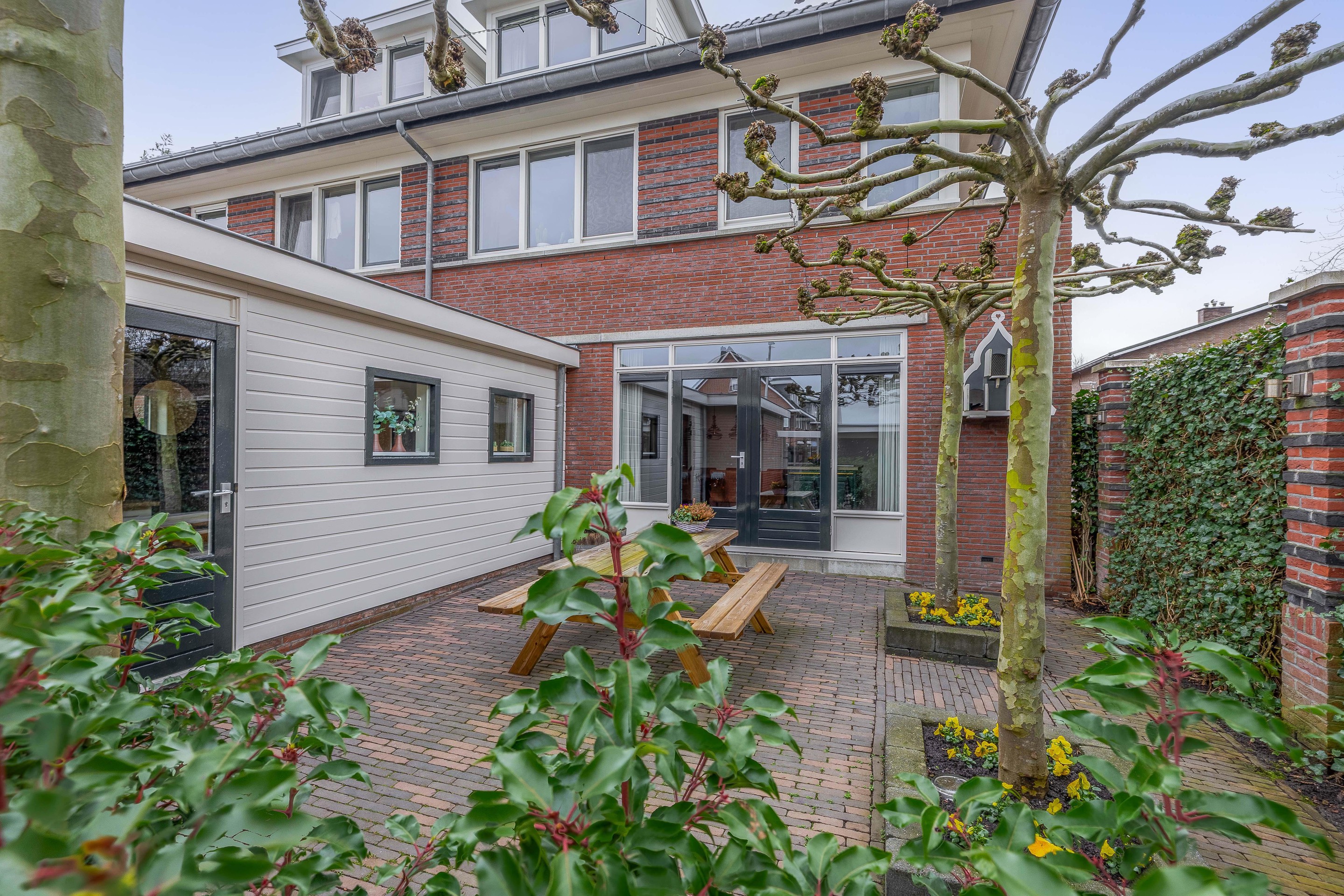 Wanneer u aan de achterzijde van de Dorpstraat 14 uw auto gratis parkeert en via de achterom uw eigen perceel betreedt, ervaart u direct de rust. De achtertuin, sfeervol aangelegd met gebakken klinkers en gunstig gelegen op het zonnige westen, vormt een heerlijk verlengstuk van de woning. De degelijke erfafscheiding aan de straatzijde zorgt voor de nodige privacy, terwijl de onderhoudsvriendelijke voor- en zijtuin met een klassiek laag ijzeren hekwerk het verzorgde karakter van het geheel onderstrepen. Hier woont u aan de oudste en meest karakteristieke winkelstraat van Waddinxveen, met alle levendigheid binnen handbereik en het comfort van een eigen, rustige buitenruimte.