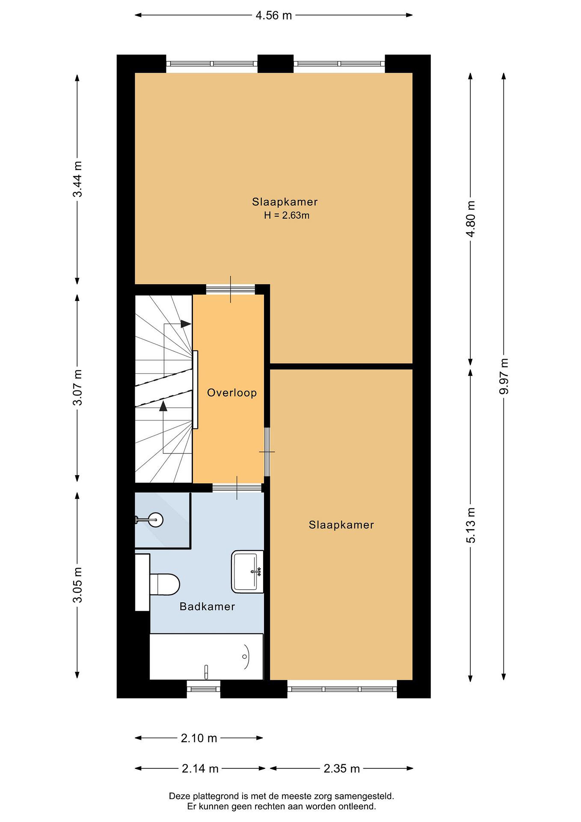 Eerste verdieping Twee verdiepingen vol woonplezier en extra kamers: Op de eerste verdieping vind je twee goed bemeten slaapkamers. De hoofdslaapkamer aan de achterzijde is woningbreed en daardoor heerlijk ruim, met afmetingen van ca. 456 x 480 cm. De slaapkamer aan de voorzijde meet ca. 235 x 513 cm. De overloop en beide kamers zijn voorzien van een nette laminaatvloer. De badkamer is luxe uitgevoerd en volledig betegeld, voorzien van een ligbad, een inloopdouche, een tweede toilet en een wastafel.