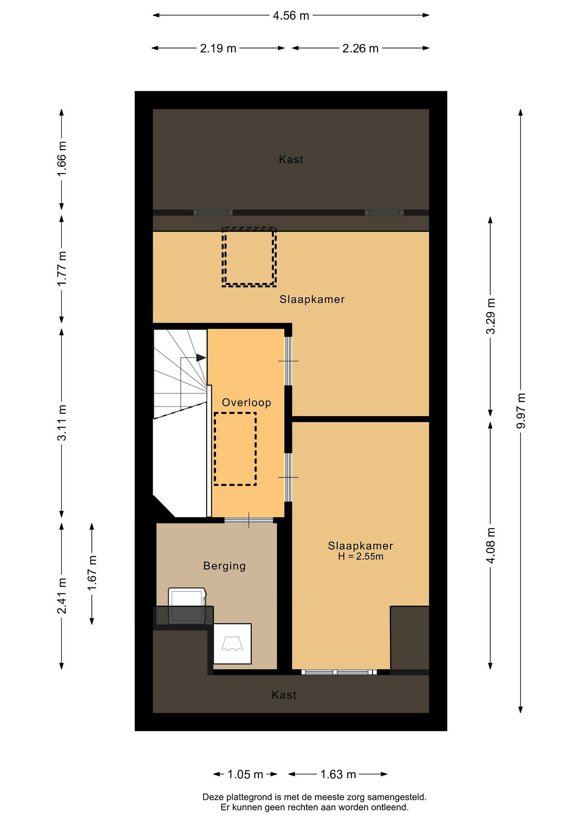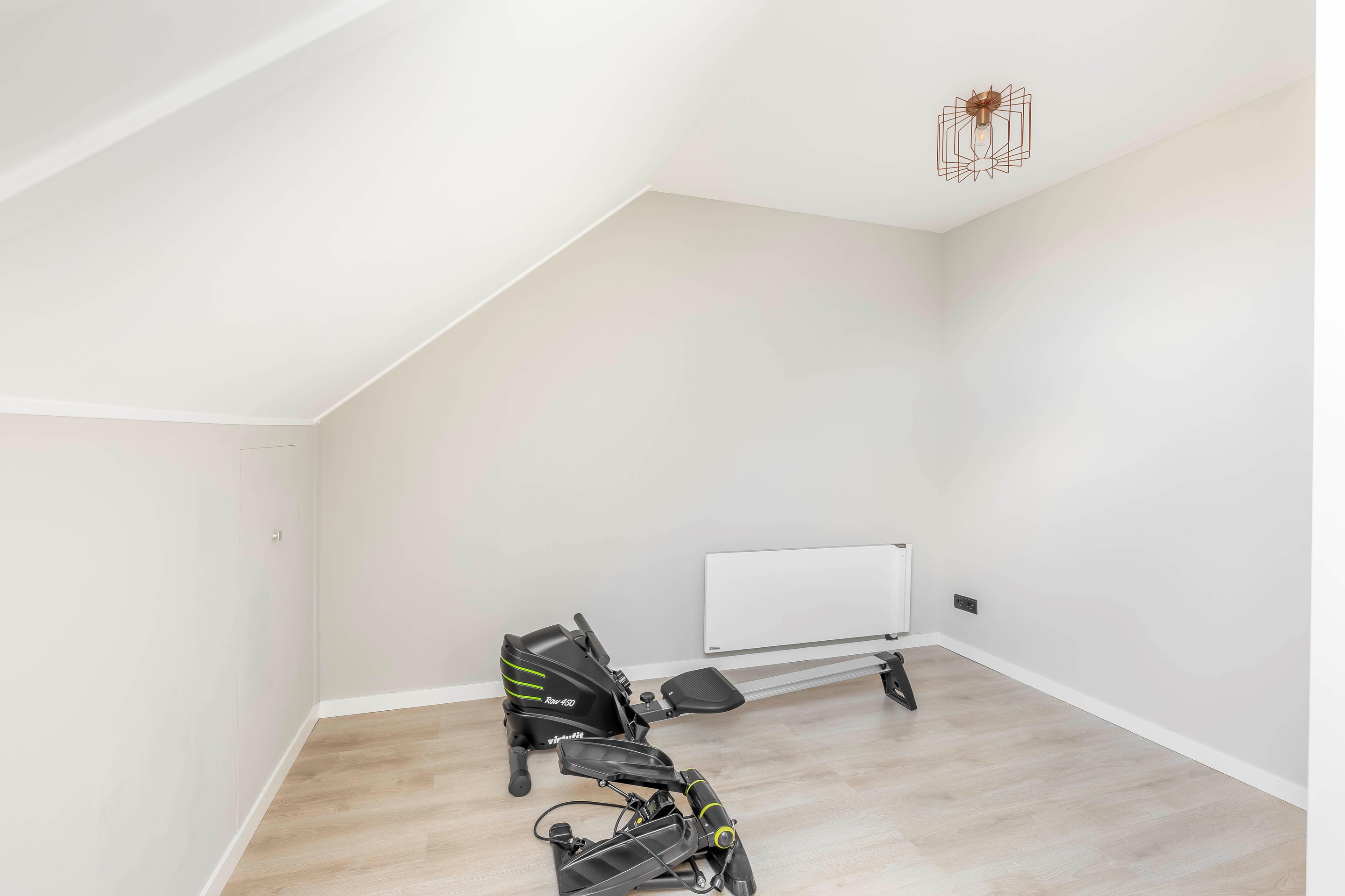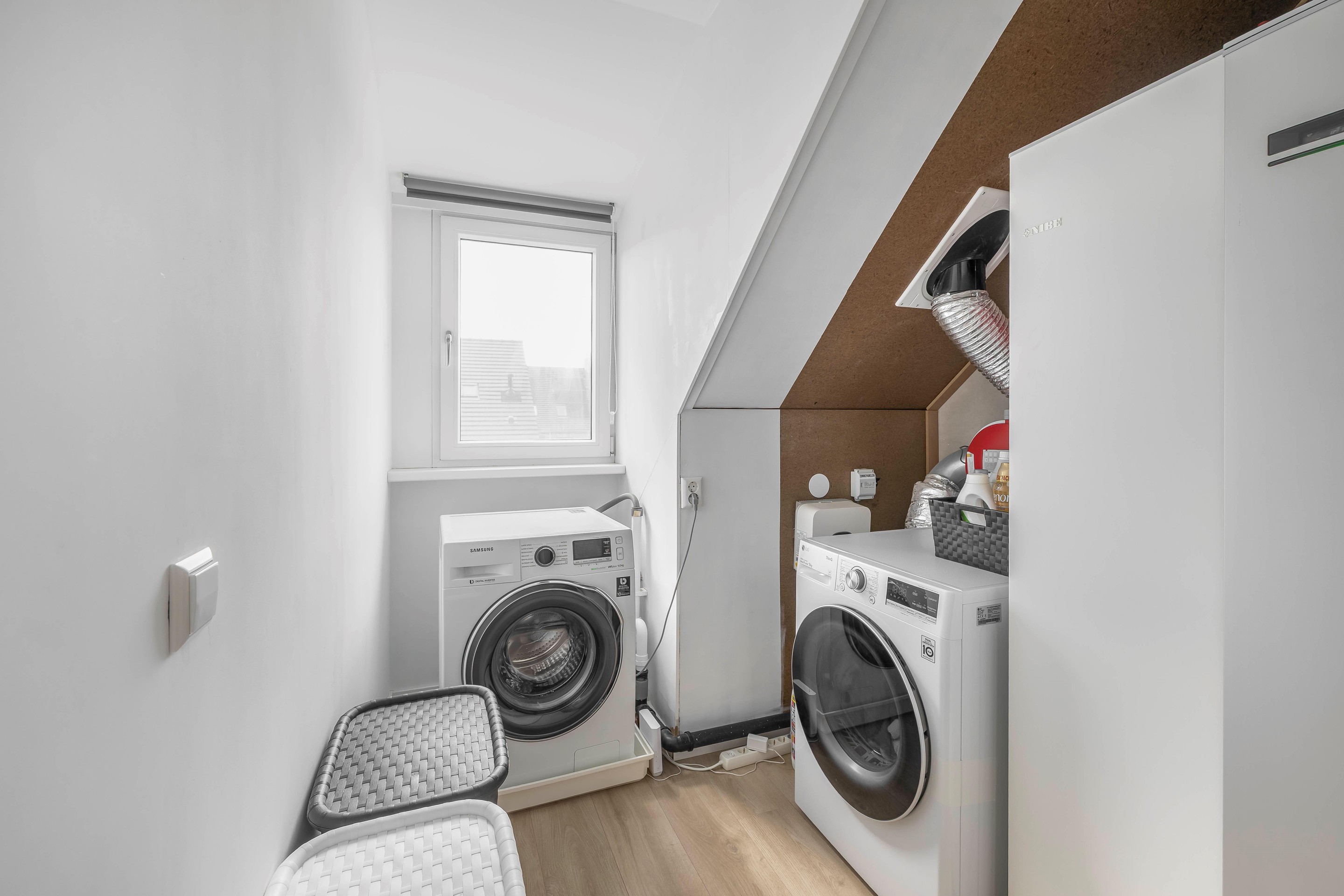 Tweede verdieping De tweede verdieping is dankzij de dakkapel aan de voorzijde getransformeerd tot een volwaardige woonlaag met twee extra slaapkamers (456 x 329 cm en 226 x 4,08 cm groot). Ook deze ruimte is weer perfect afgewerkt, zodat je er direct in kunt. Op deze verdieping bevindt zich tevens de technische ruimte met de opstelling voor de bodemwarmtepomp, warmwaterboiler en de aansluitingen voor de wasmachine en droger. Boven deze verdieping is een grote bergvliering gerealiseerd, welke middels een vlizotrap bereikbaar is.