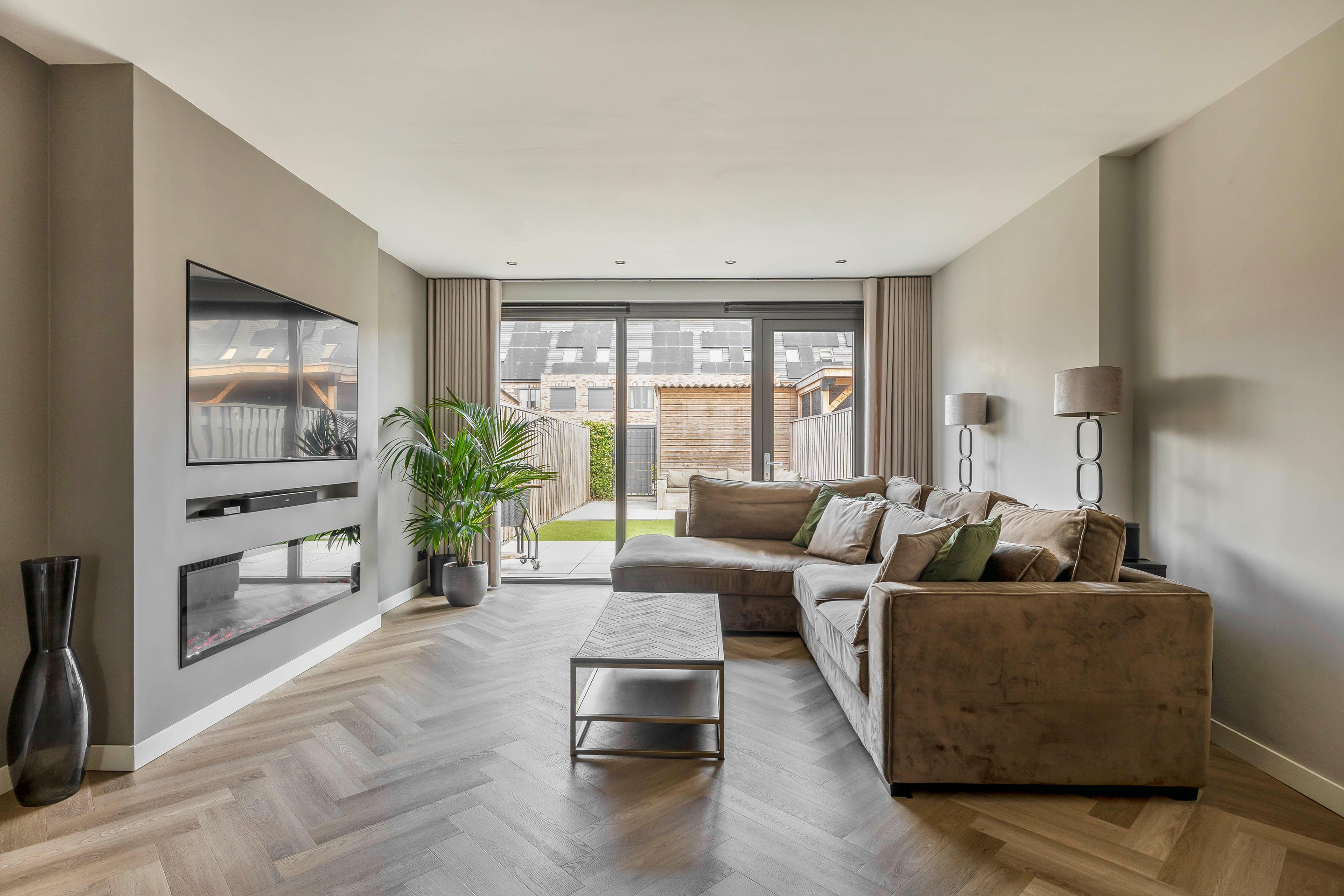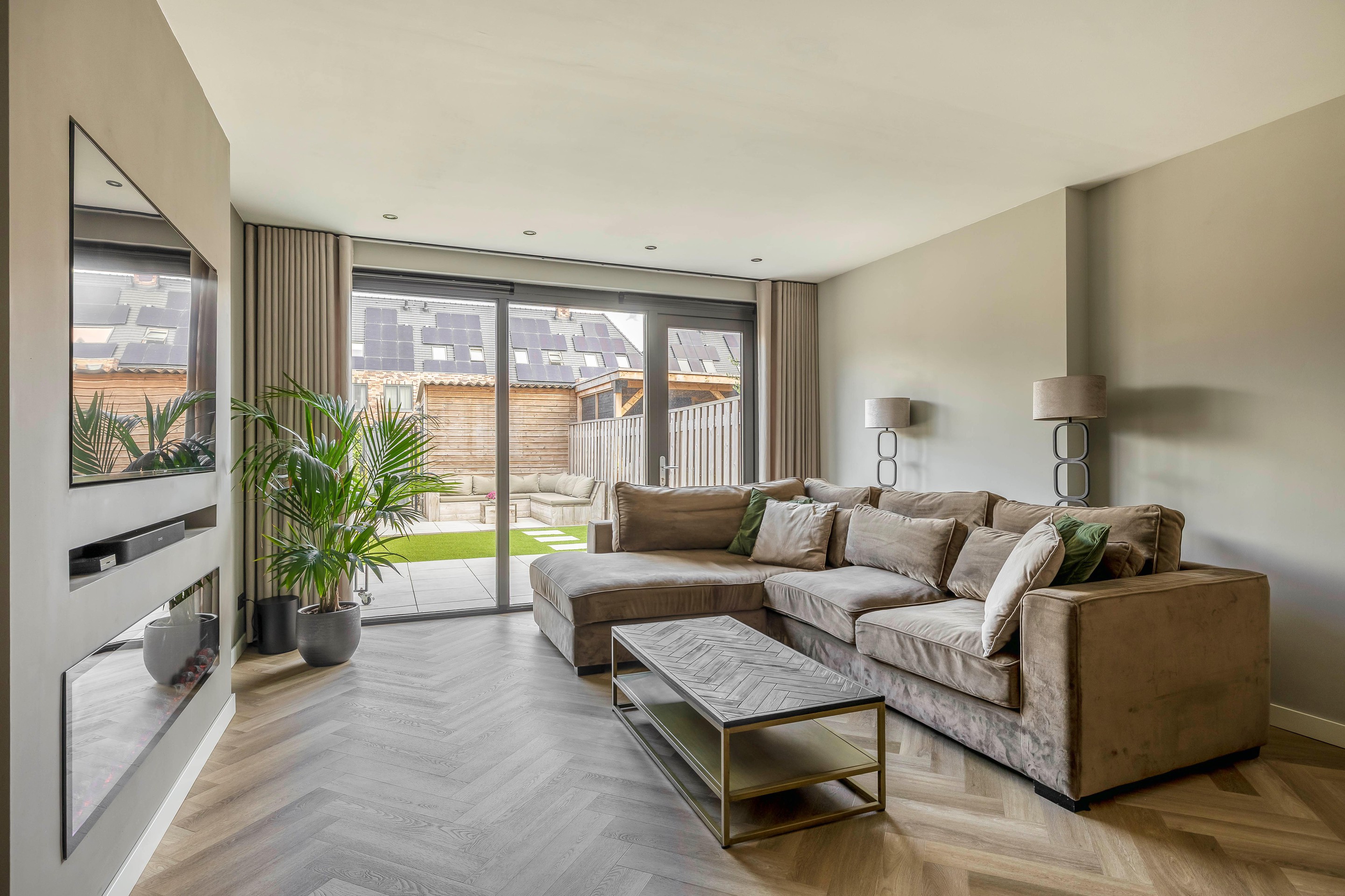 De woonkamer is aan de achterzijde flink vergroot door een 2,40 meter uitbouw, waardoor er een heerlijk royale zithoek is ontstaan. Dankzij de grote raampartijen en de deur naar de achtertuin valt er aangenaam veel licht naar binnen. Verder zijn er inbouwspots aangebracht in de uitbouw en is de tv ingebouwd in een zogenaamde Cinewall. Onderin deze kast is een sfeervolle elektrische haard geplaatst.