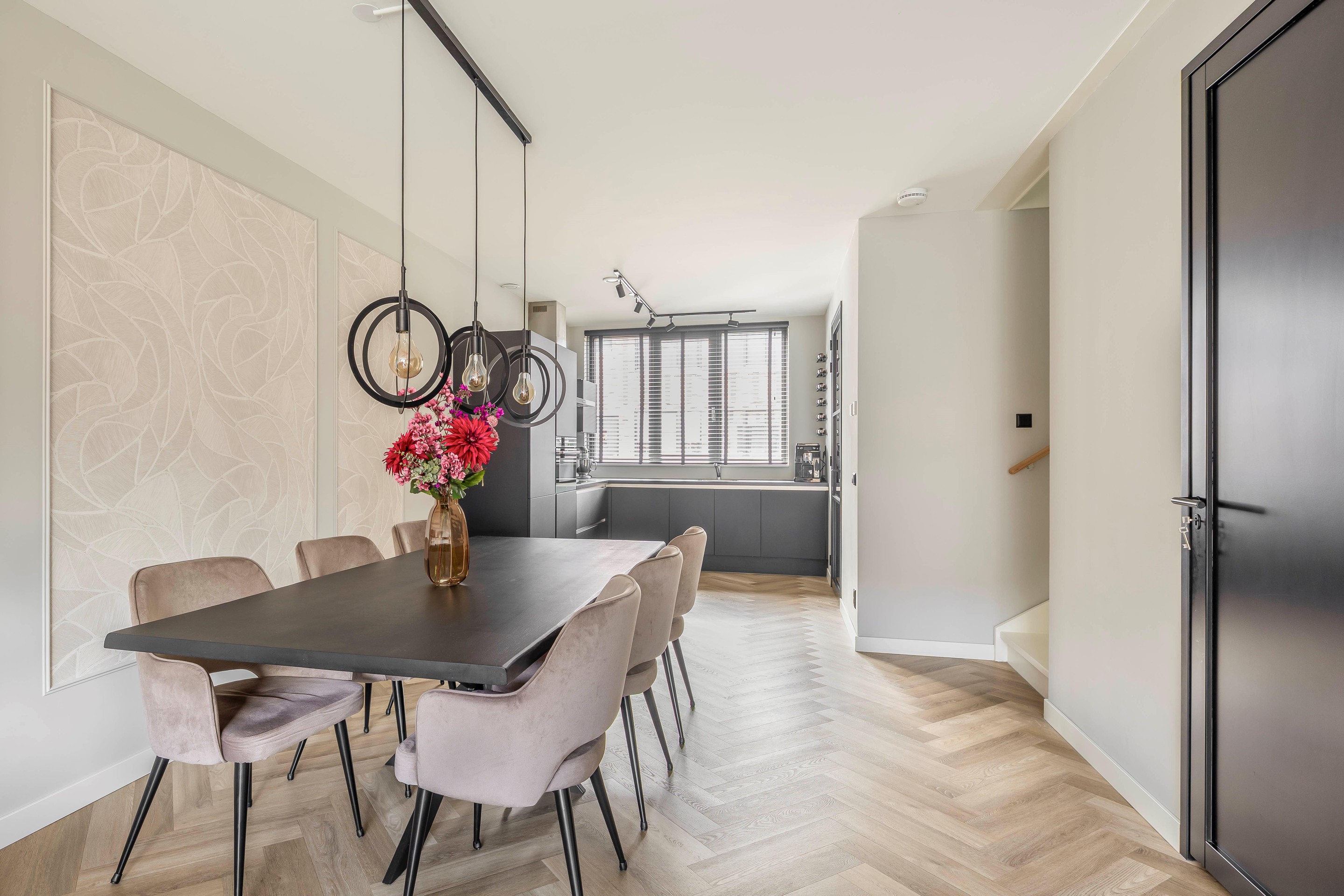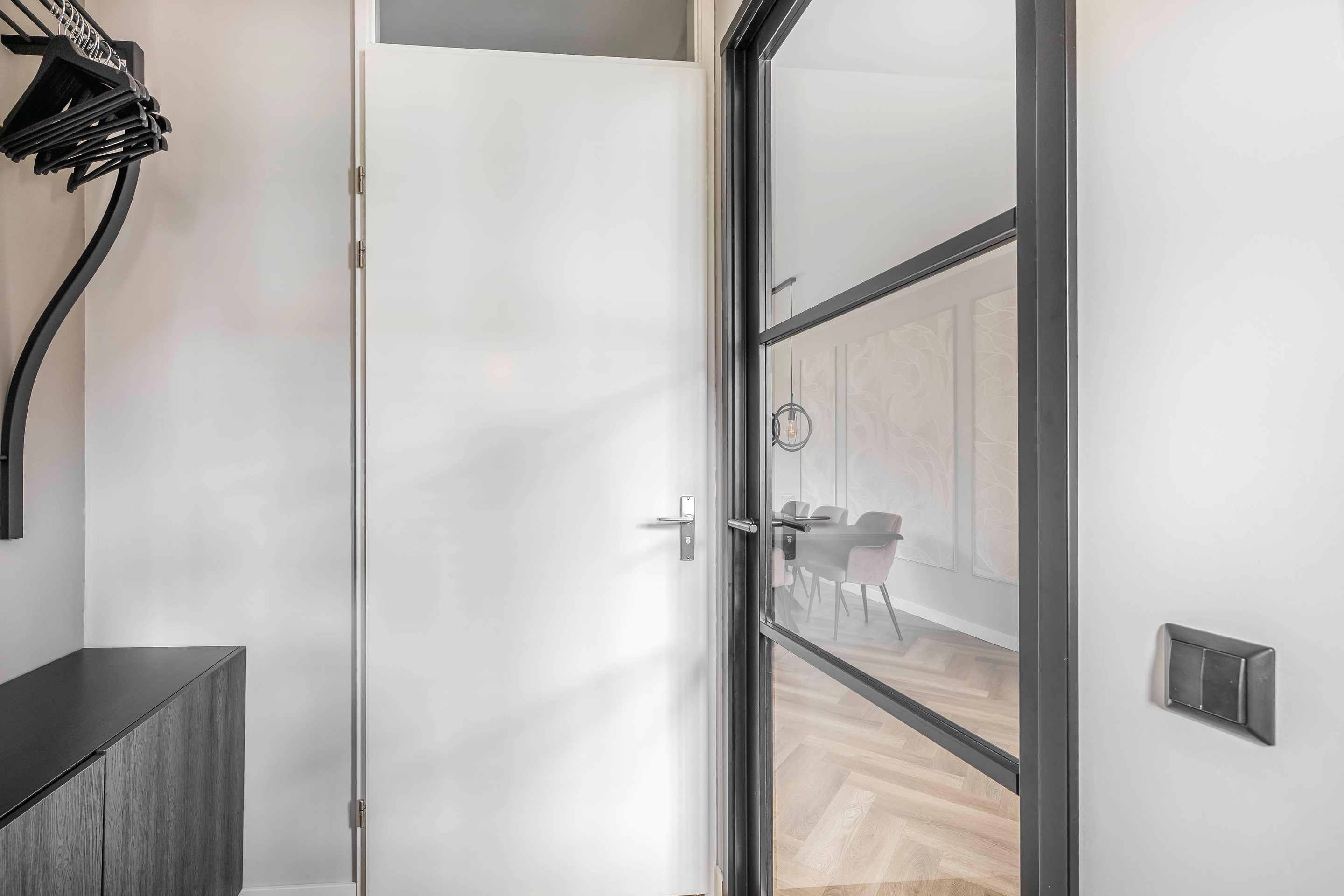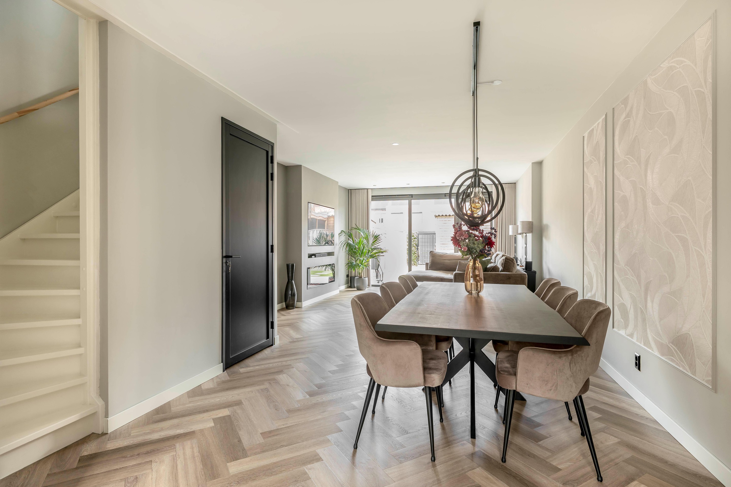 Begane grond Binnenkomen in een lichte en luxe leefruimte: Je komt binnen via de voortuin in de hal met de meterkast en het moderne toilet met hangend closet. De gehele begane grond is voorzien van een fraaie pvc-vloer, die in visgraatmotief is gelegd en daarmee net dat extra chique tintje geeft. De deur van de hal naar de woonkamer is fraai uitgevoerd in het zwart met grote glaspanelen.