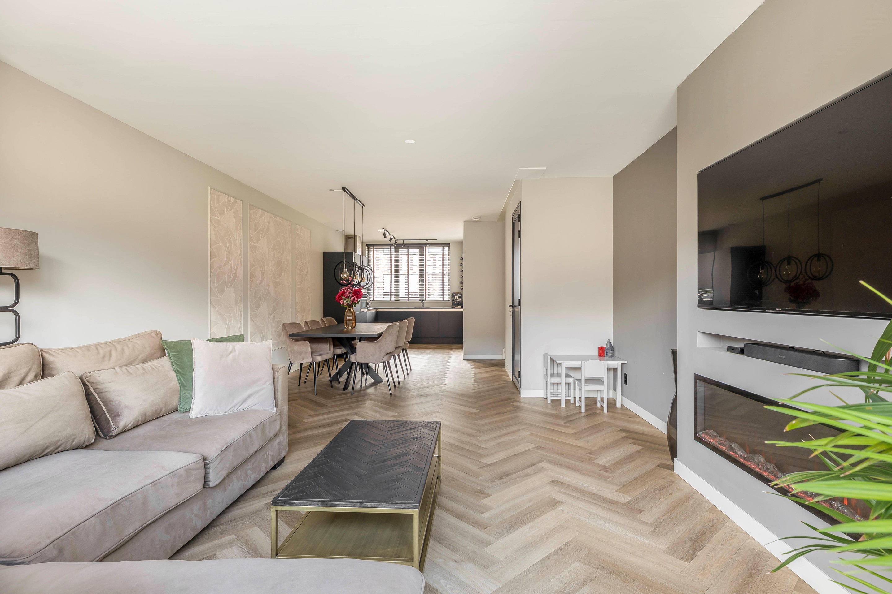- Luxe extra's: Uitbouw van 2,40 meter, PVC- vloer gelegd in een visgraatmotief, Cinewall met elektrische haard en dakkapel