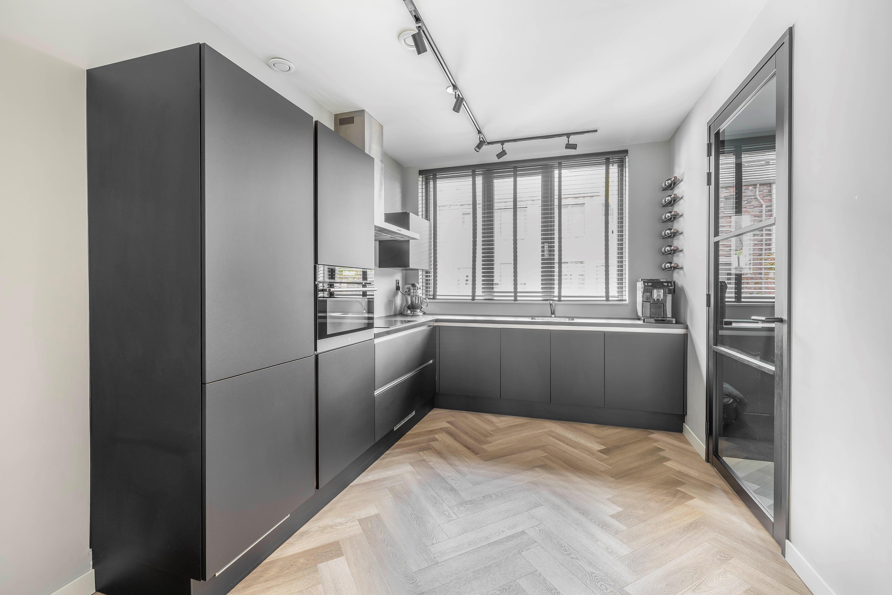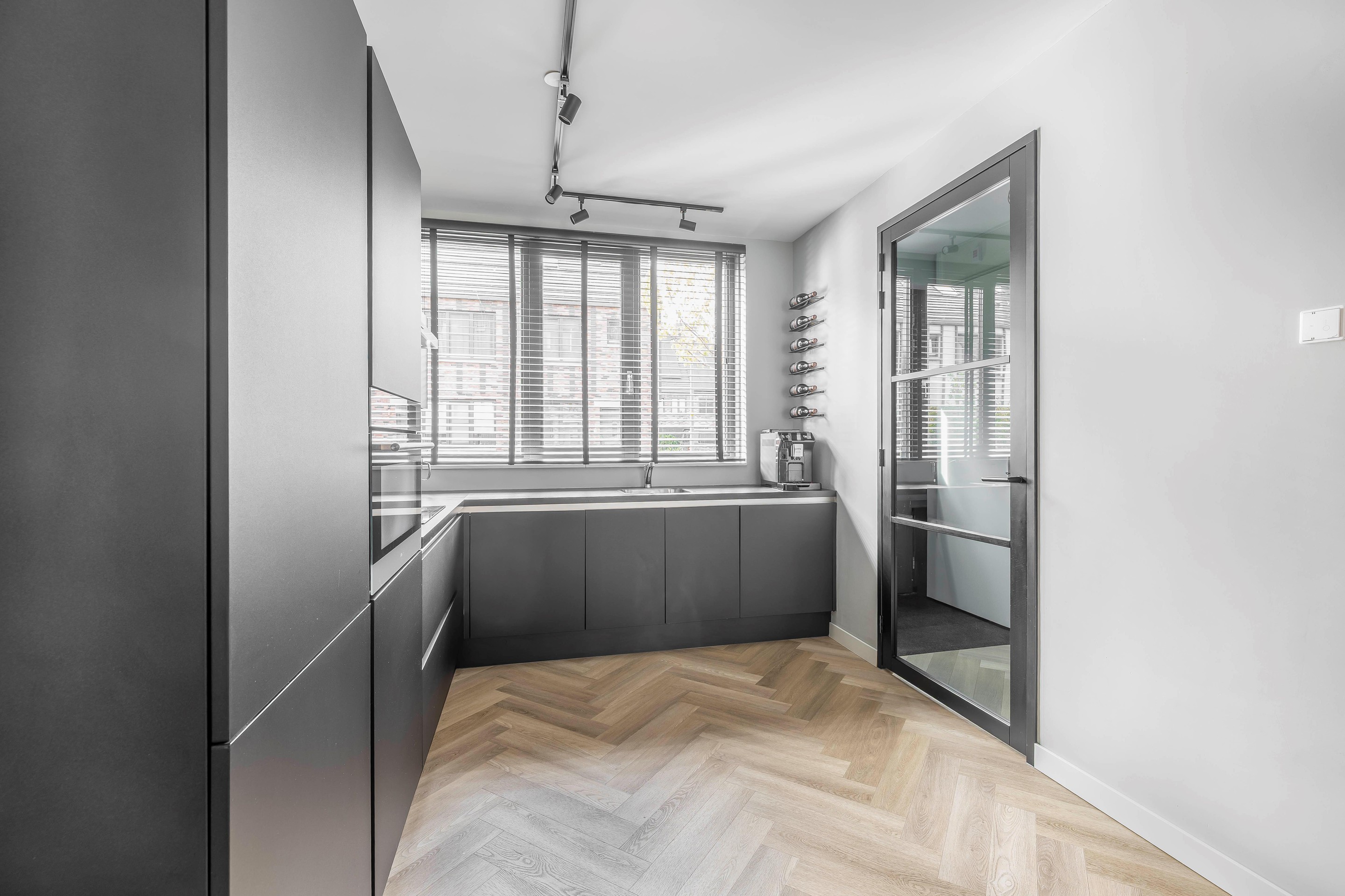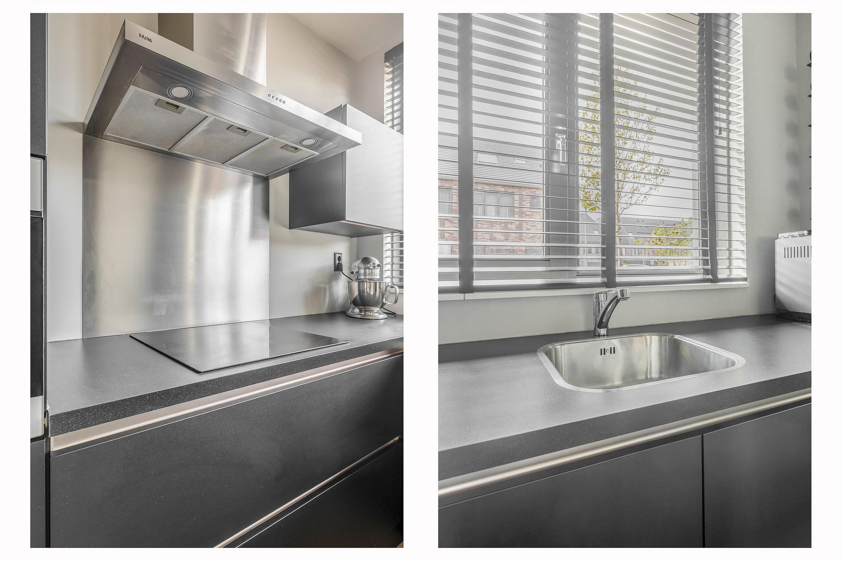 Aan de voorzijde bevindt zich de moderne open keuken in een praktische L-opstelling. Deze luxe keuken is van alle gemakken voorzien, waaronder een inductiekookplaat, combi-magnetron, vaatwasser en een koel-/vriescombinatie. De afwerking van de gehele begane grond is om door een "ringetje te halen".